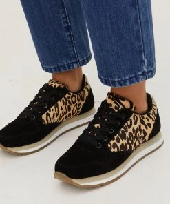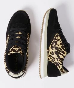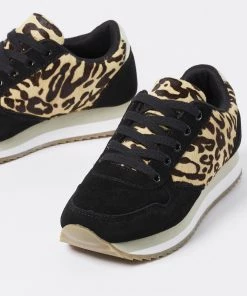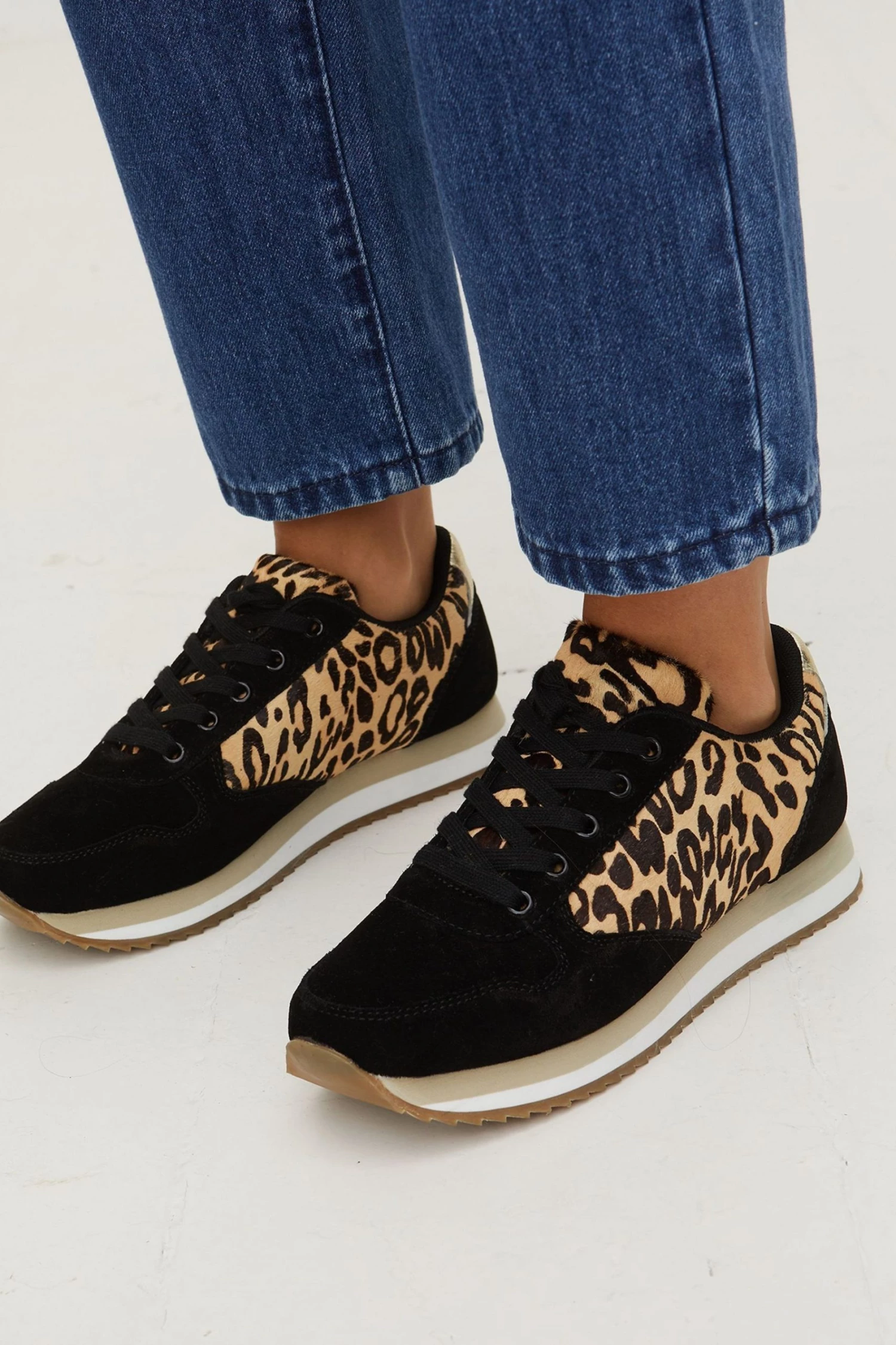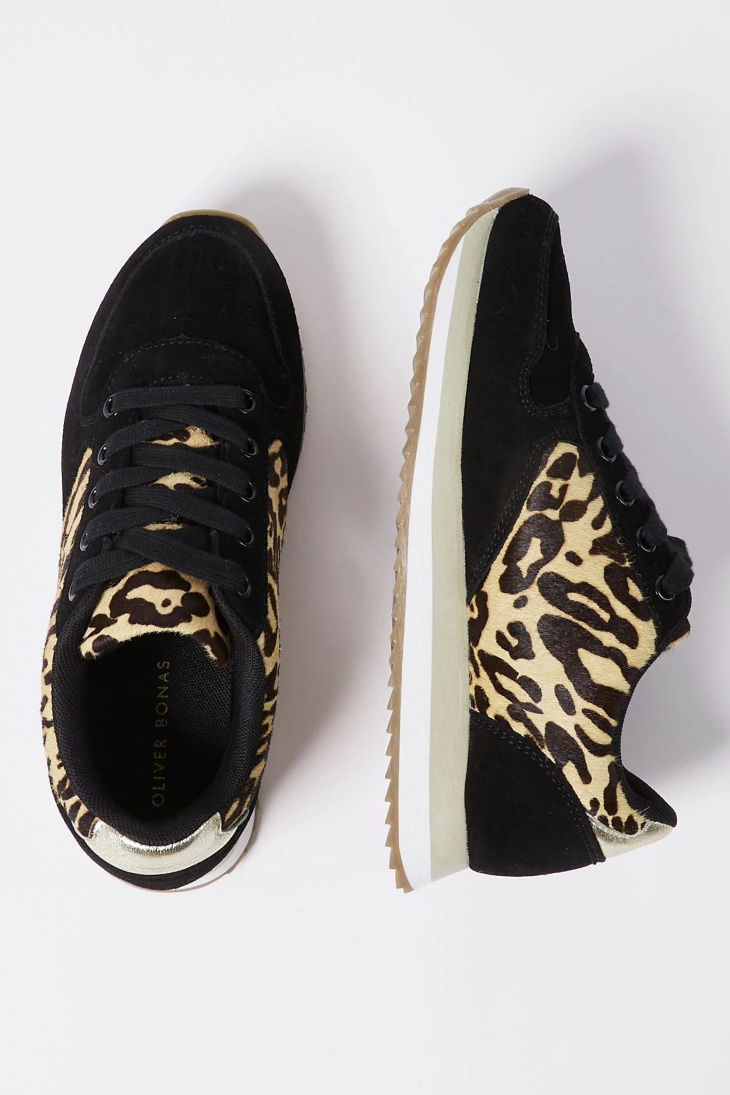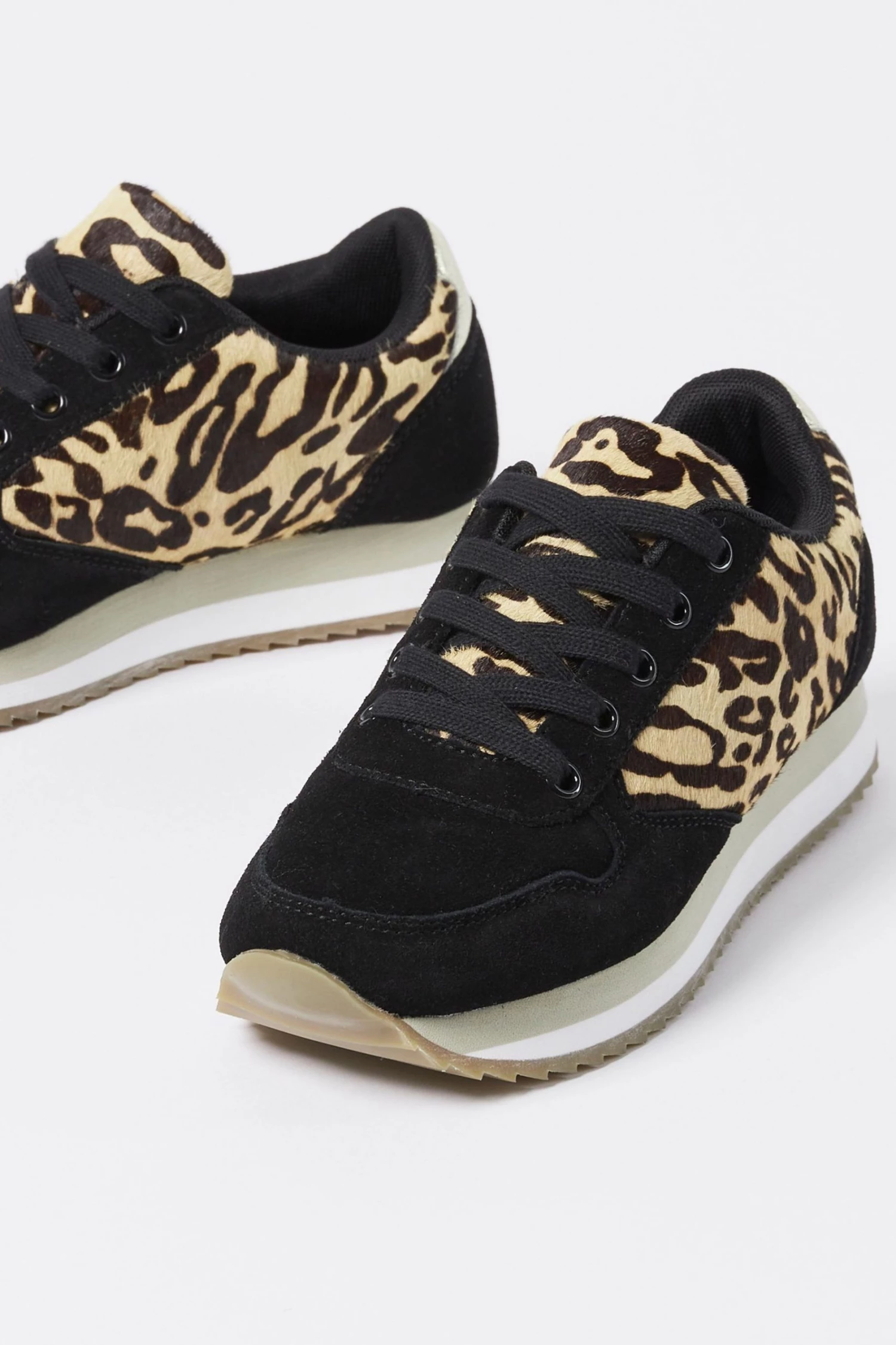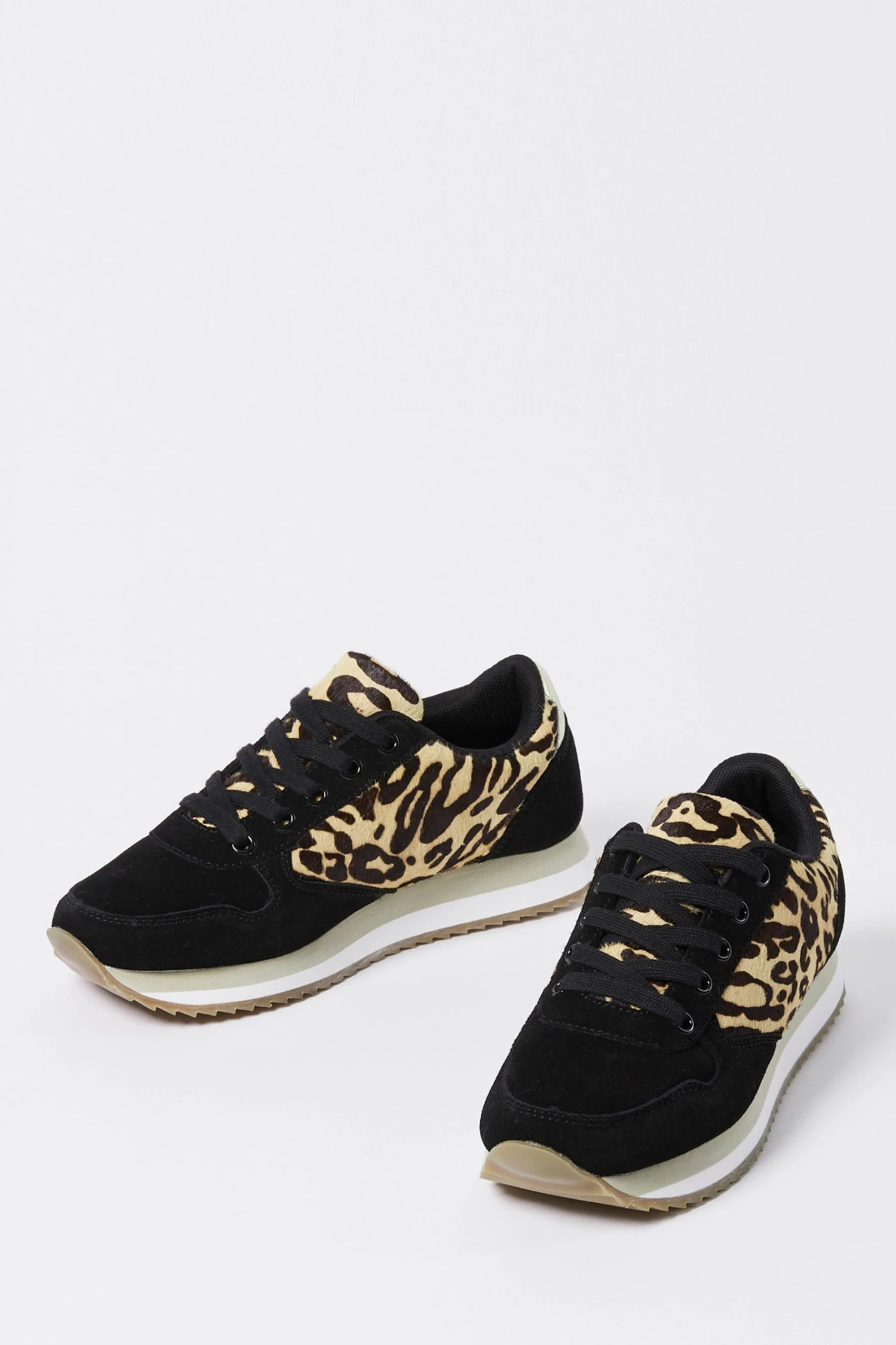Combining textured animal print with a colourblocked design, these soft-touch suede leather trainers lend a wild touch to your footwear. In a classic sneaker style with a gently pointed toe, these trainers are completed with lace-up fastenings and flatform rubber soles.