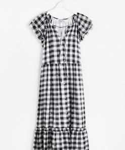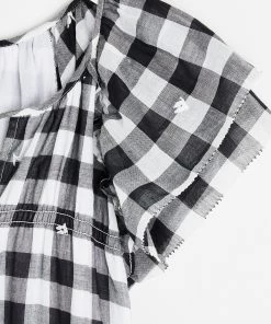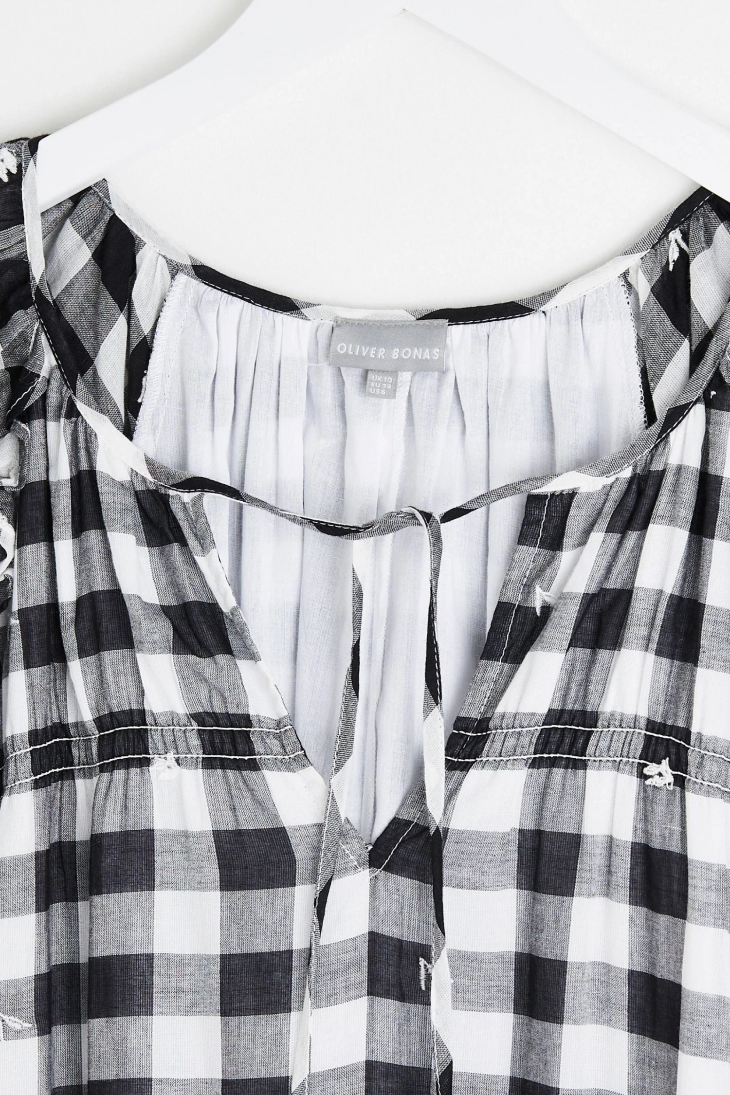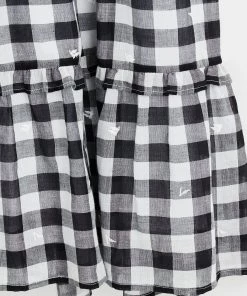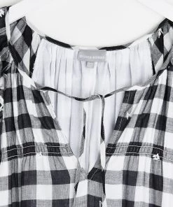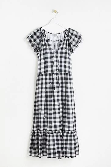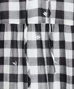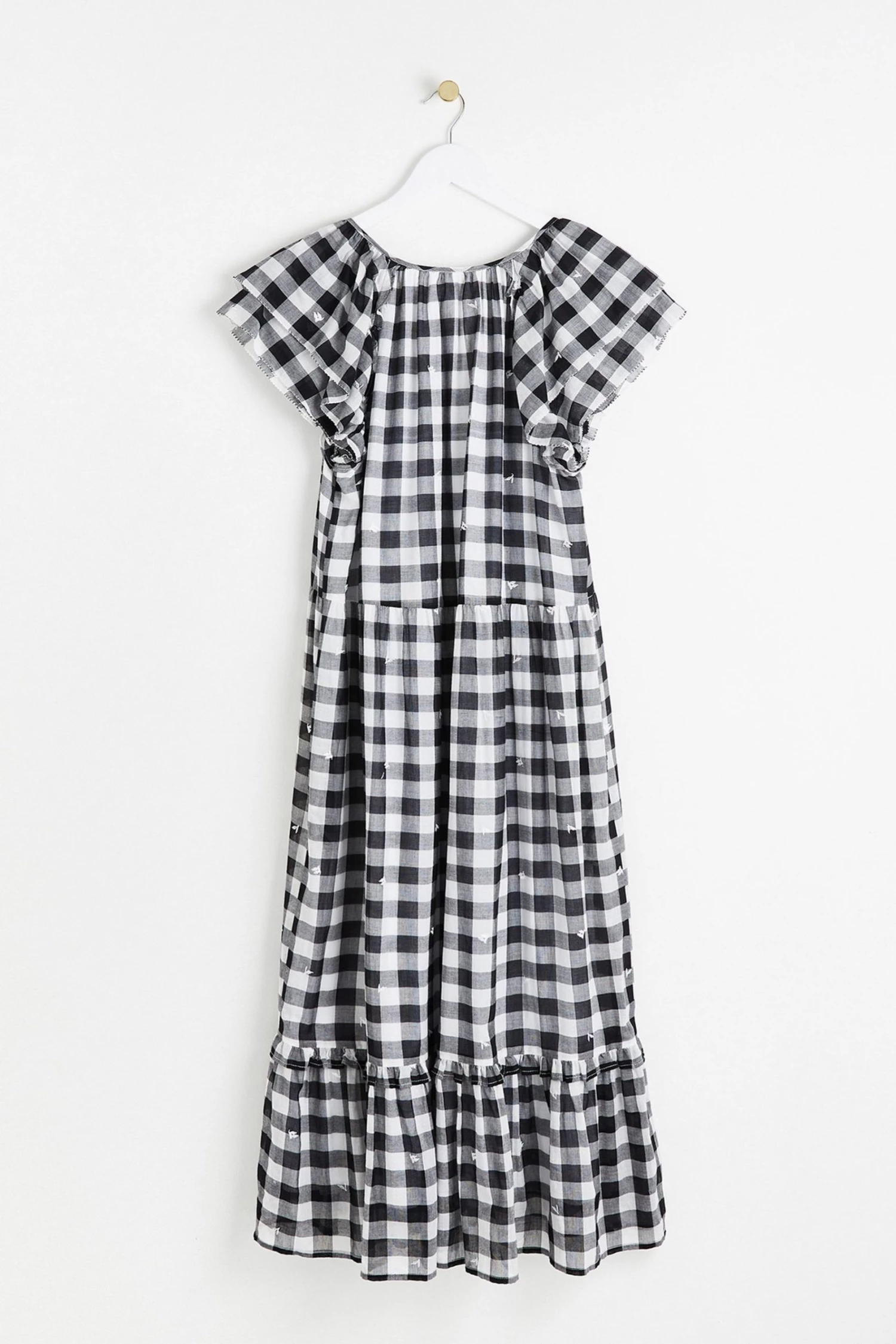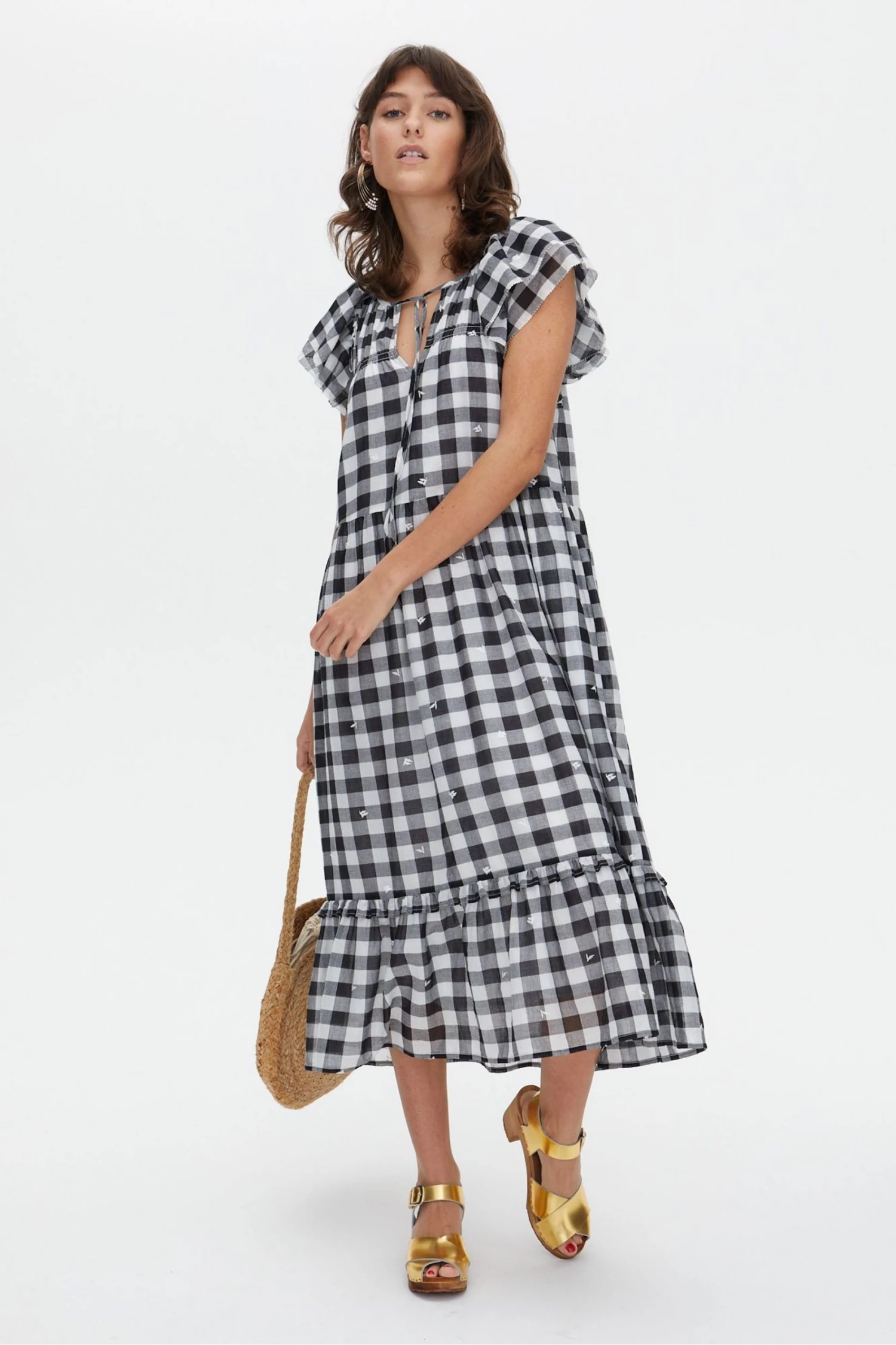 In a tiered, A-line silhouette, this black and white gingham midi dress is adorned with embroidered details throughout. Frill shoulders and a tie up V-neck come together to form a delicate design, and is completed with pleats for a flowy finish.