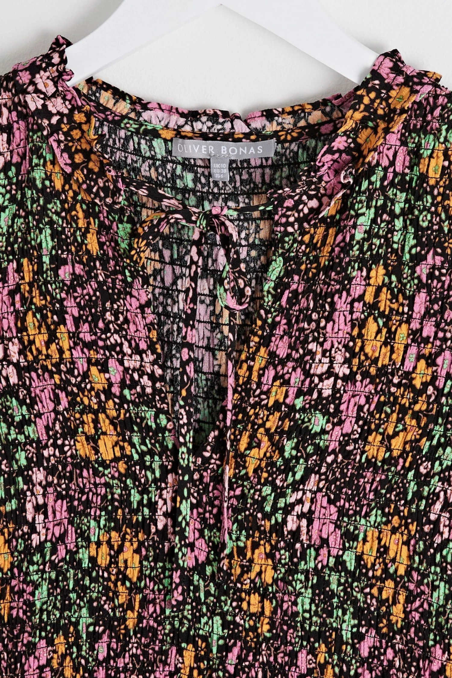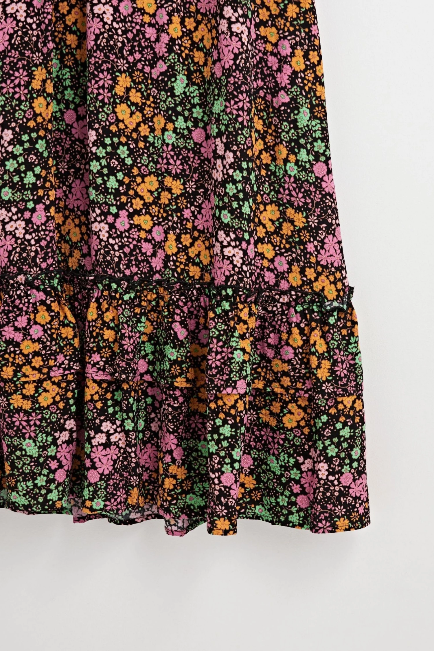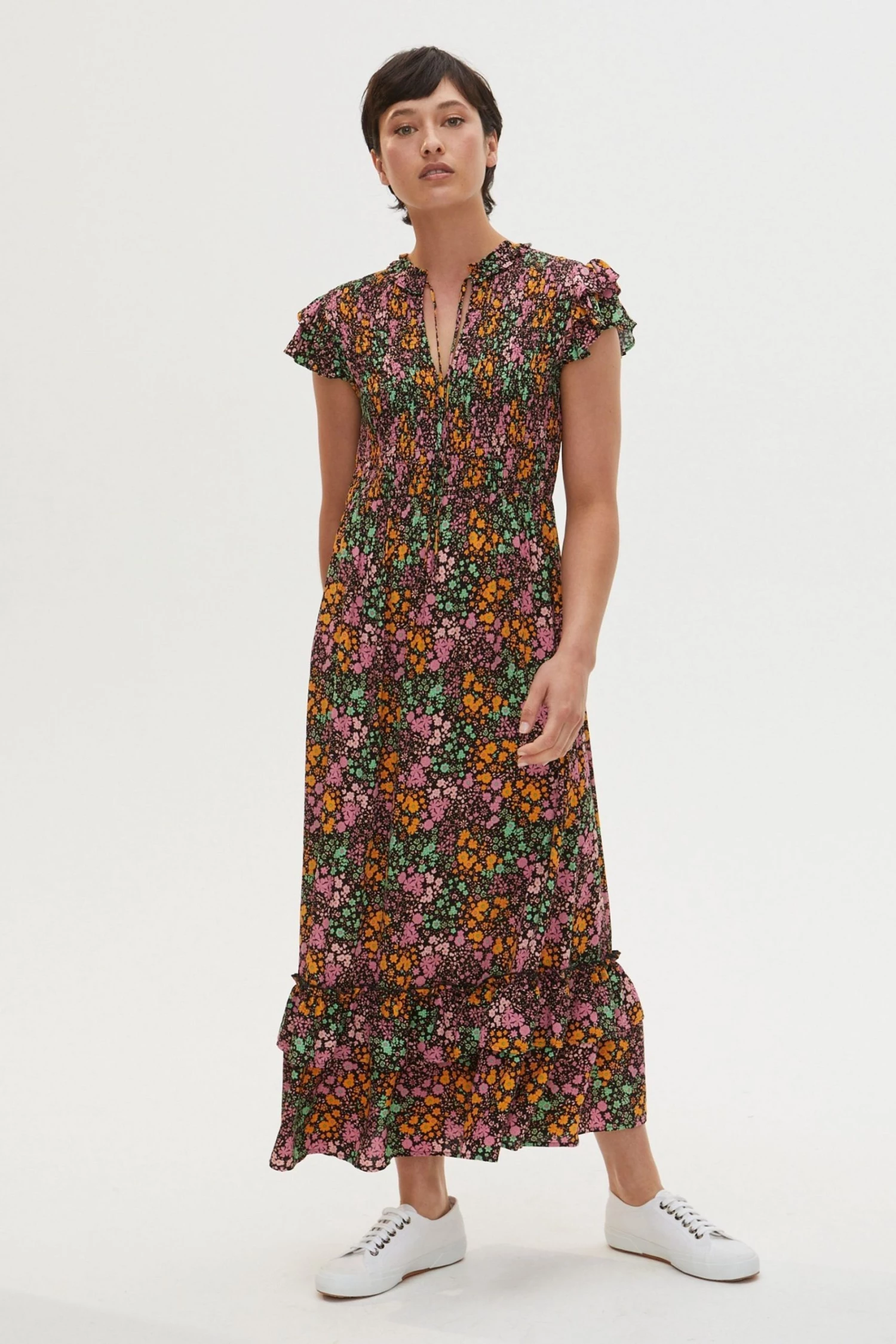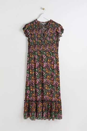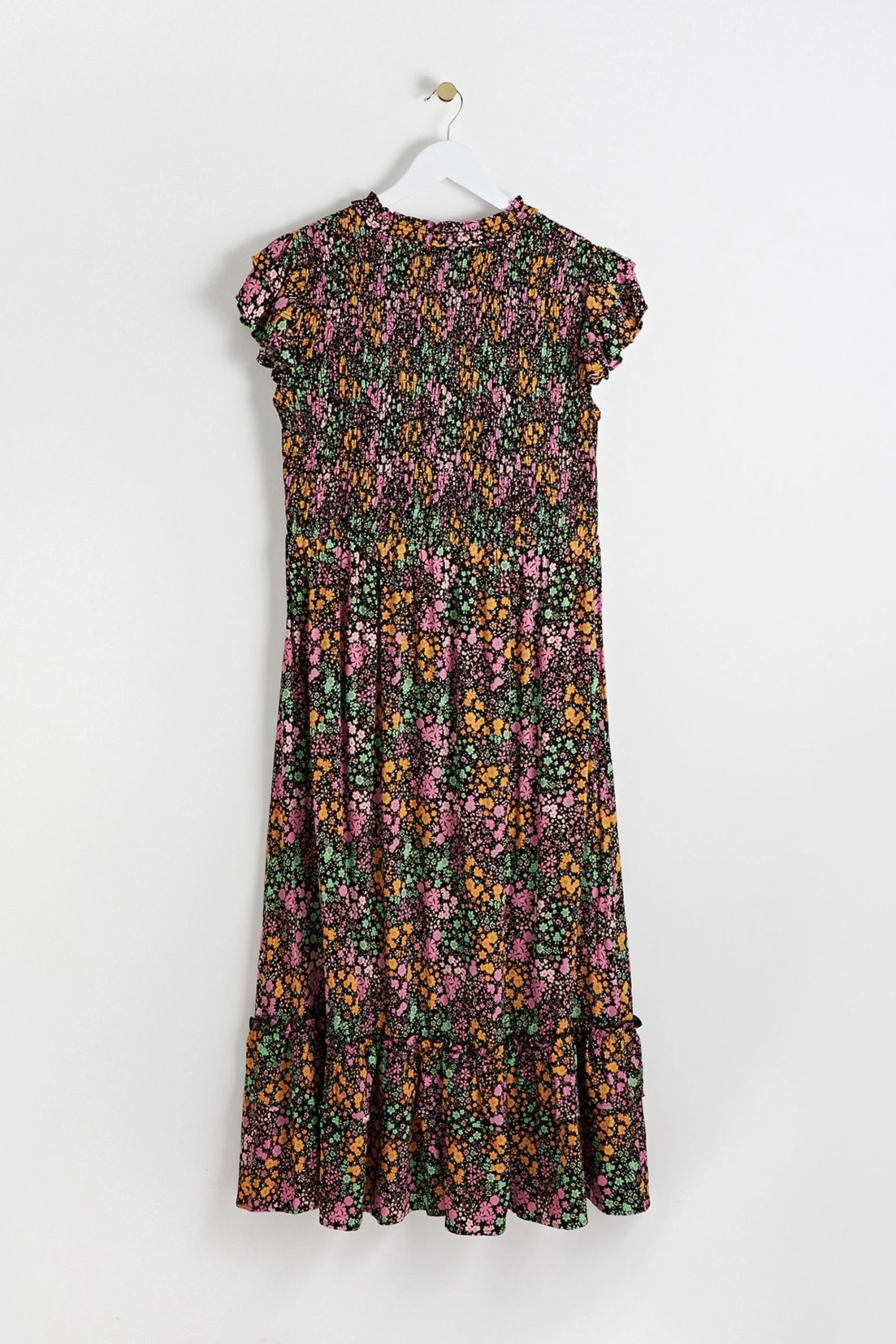 Oliver Bonas Black Floral Print Shirred Bodice Midi Dress