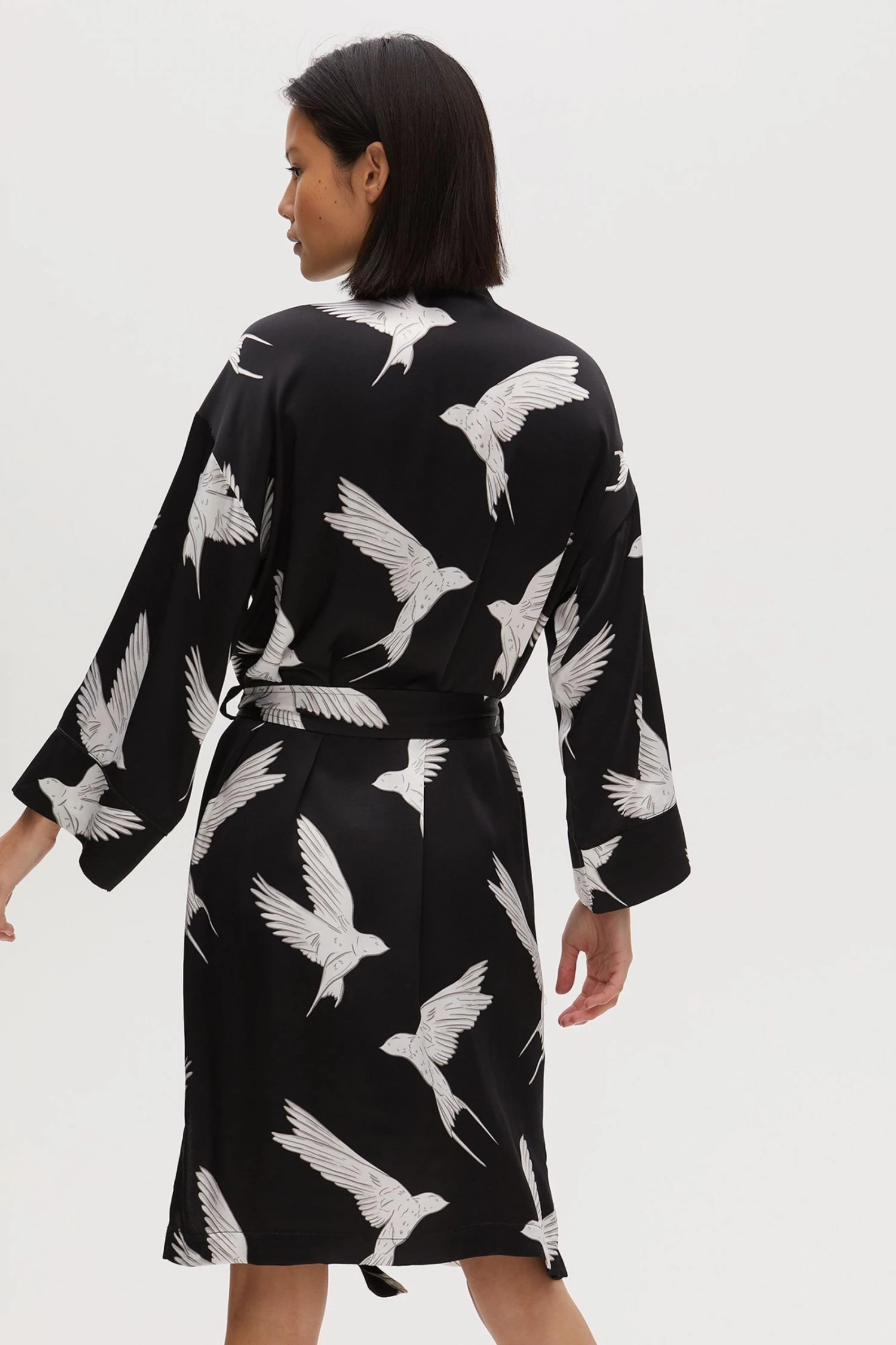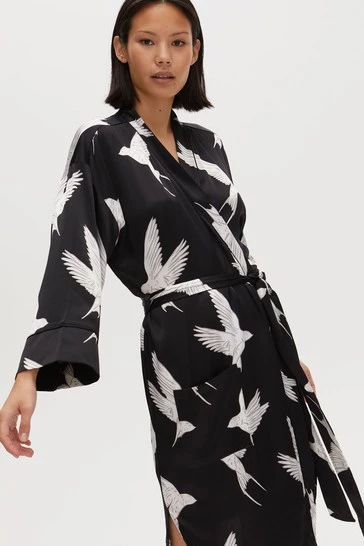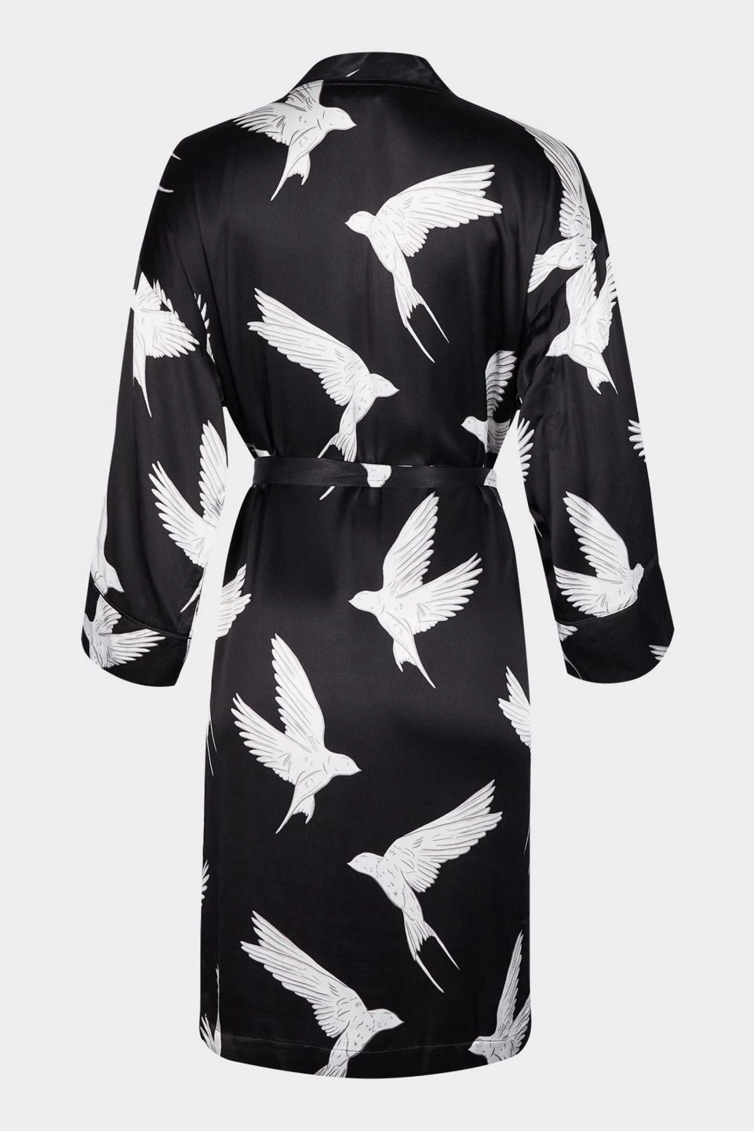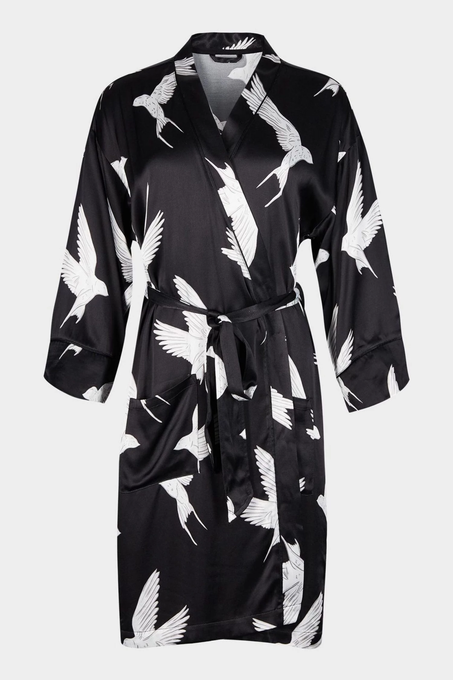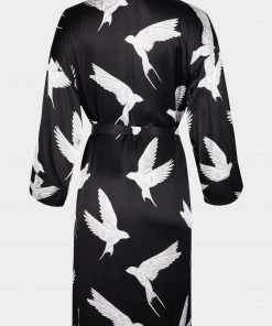 Fly off to dreamland with the Sleepy Swallow Print Dressing Gown. In a wrap around style with a fabric tie fastening in the waist, this robe is decorated in a flying bird print in white and grey tones, completed with long sleeves, a V-neckline and sewn-on pockets on the front.
