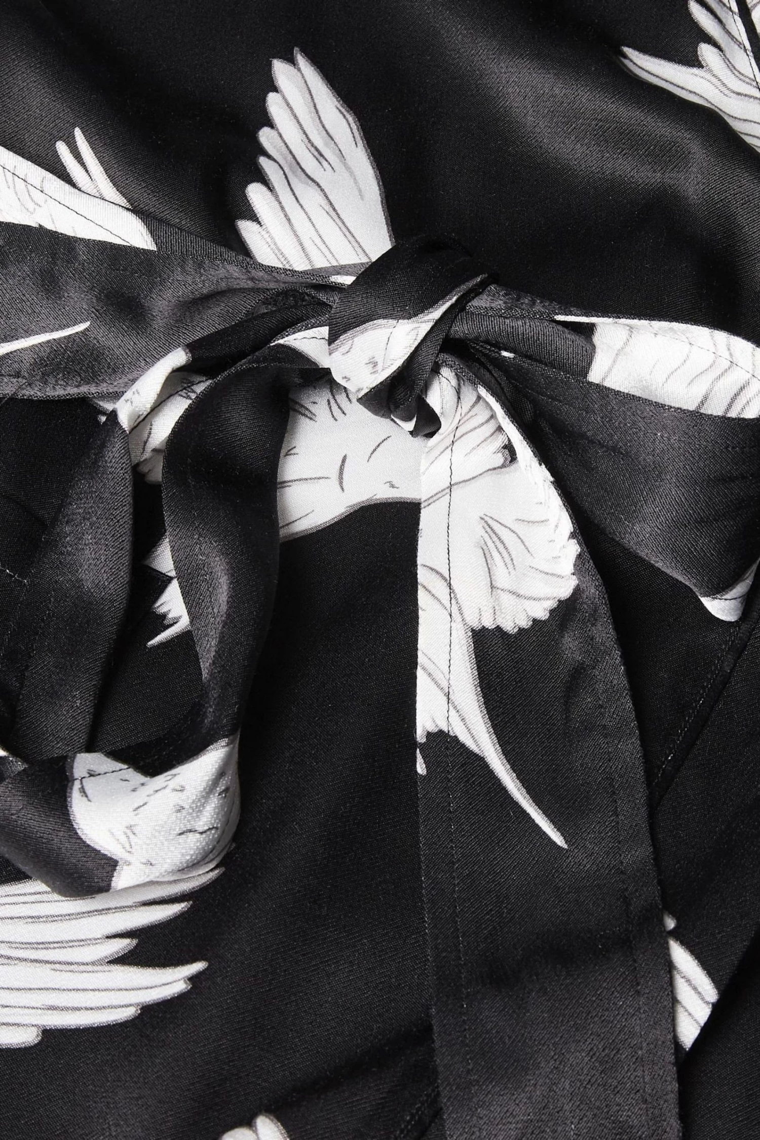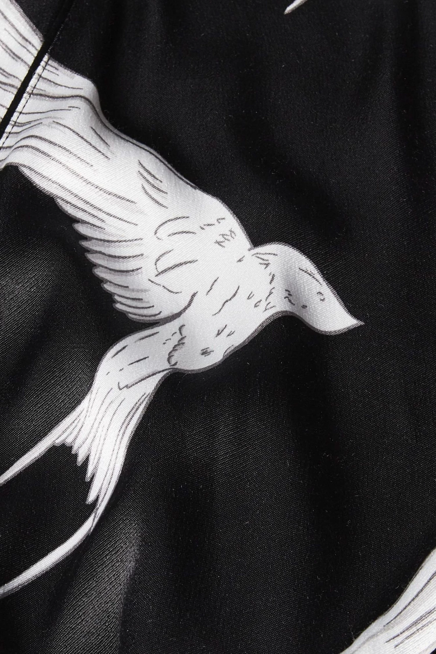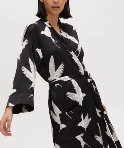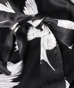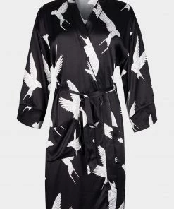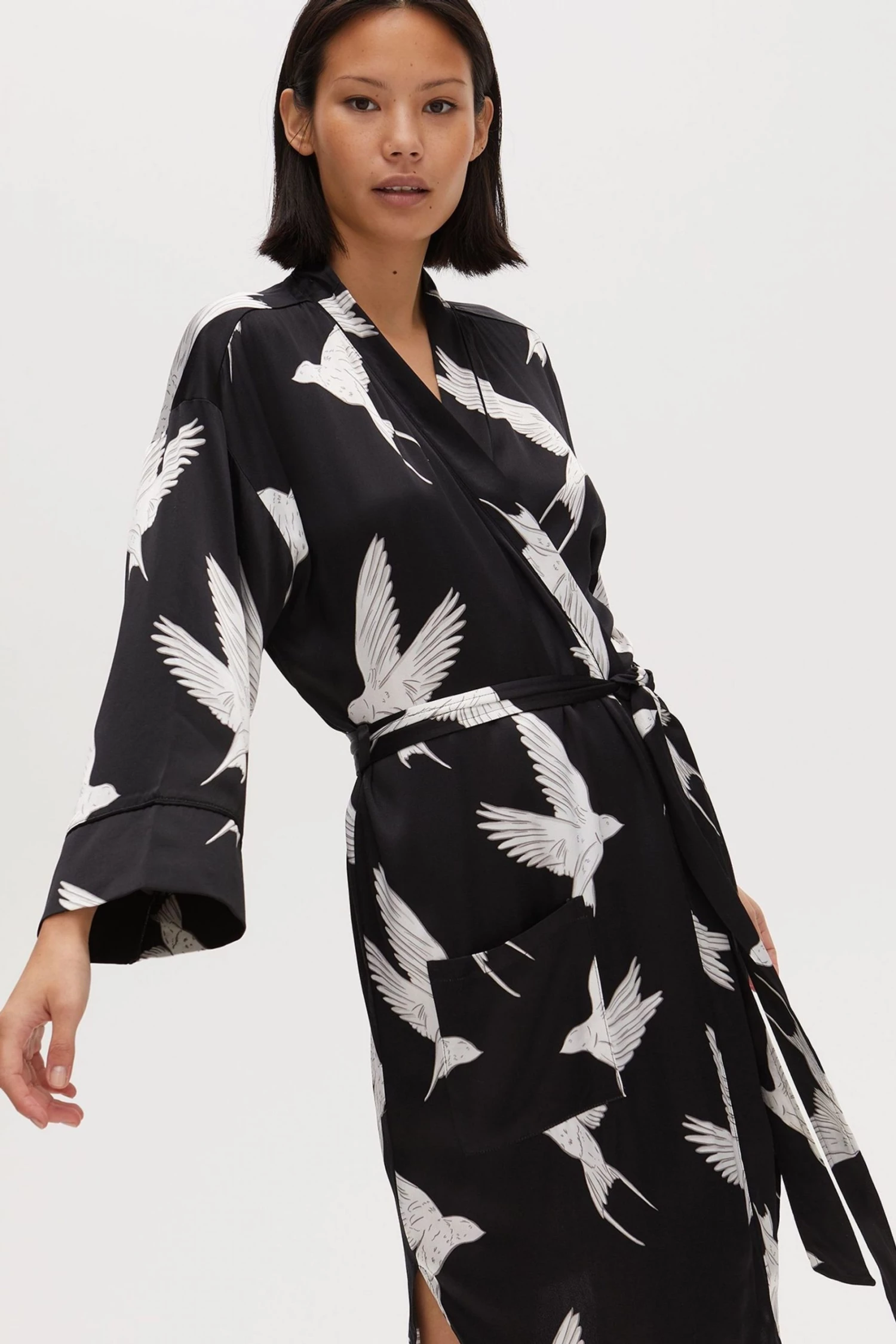 Fly off to dreamland with the Sleepy Swallow Print Dressing Gown. In a wrap around style with a fabric tie fastening in the waist, this robe is decorated in a flying bird print in white and grey tones, completed with long sleeves, a V-neckline and sewn-on pockets on the front.