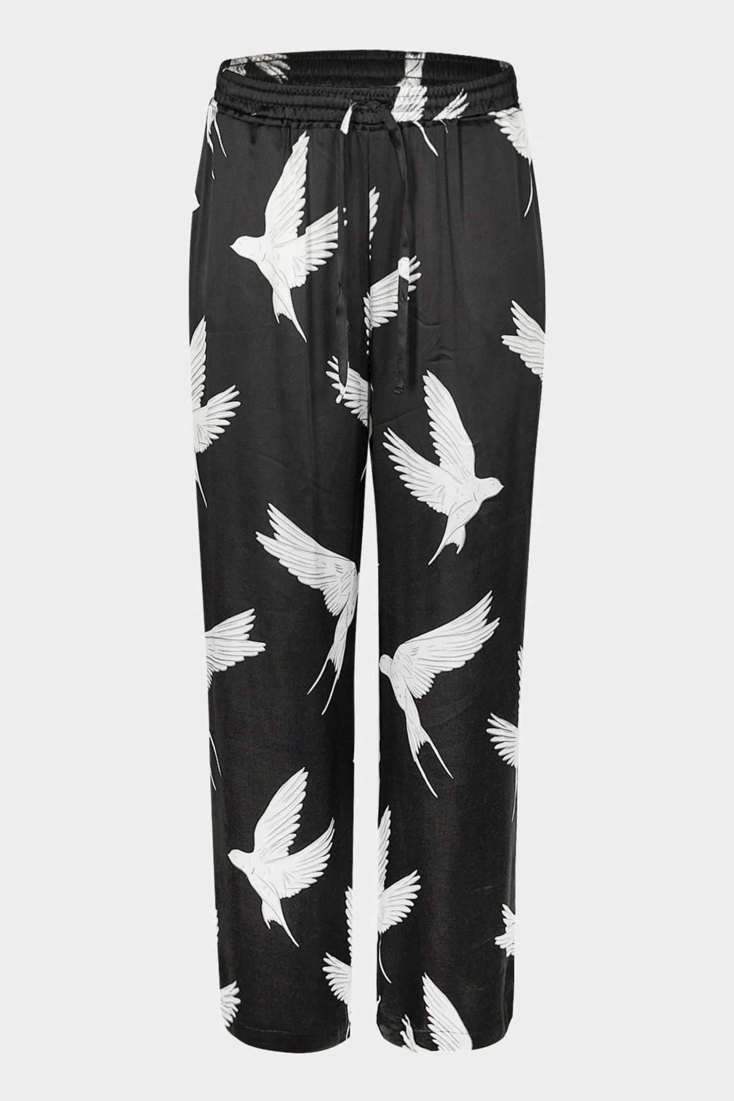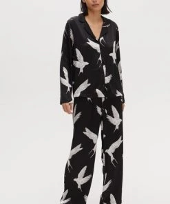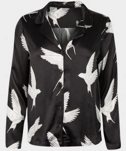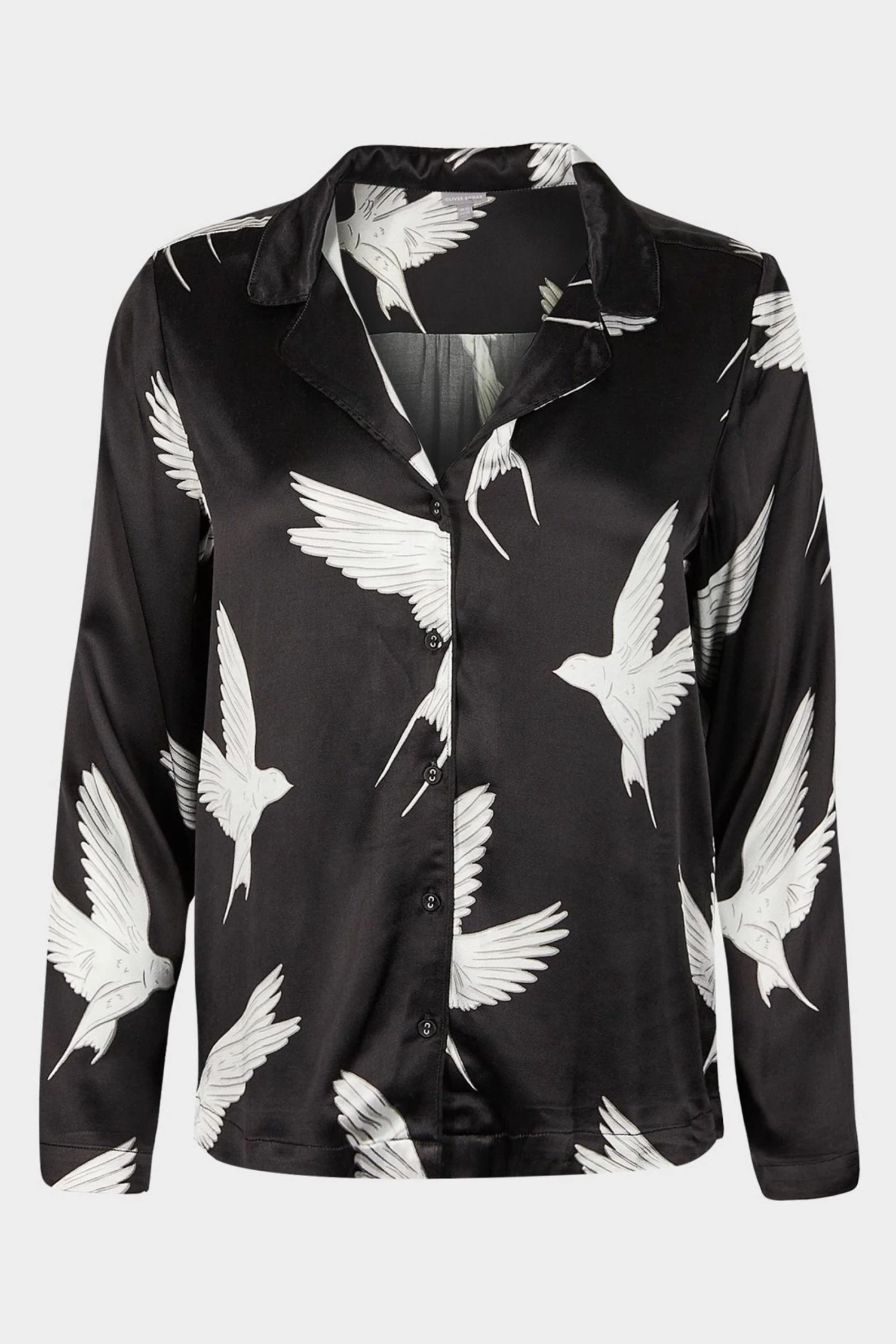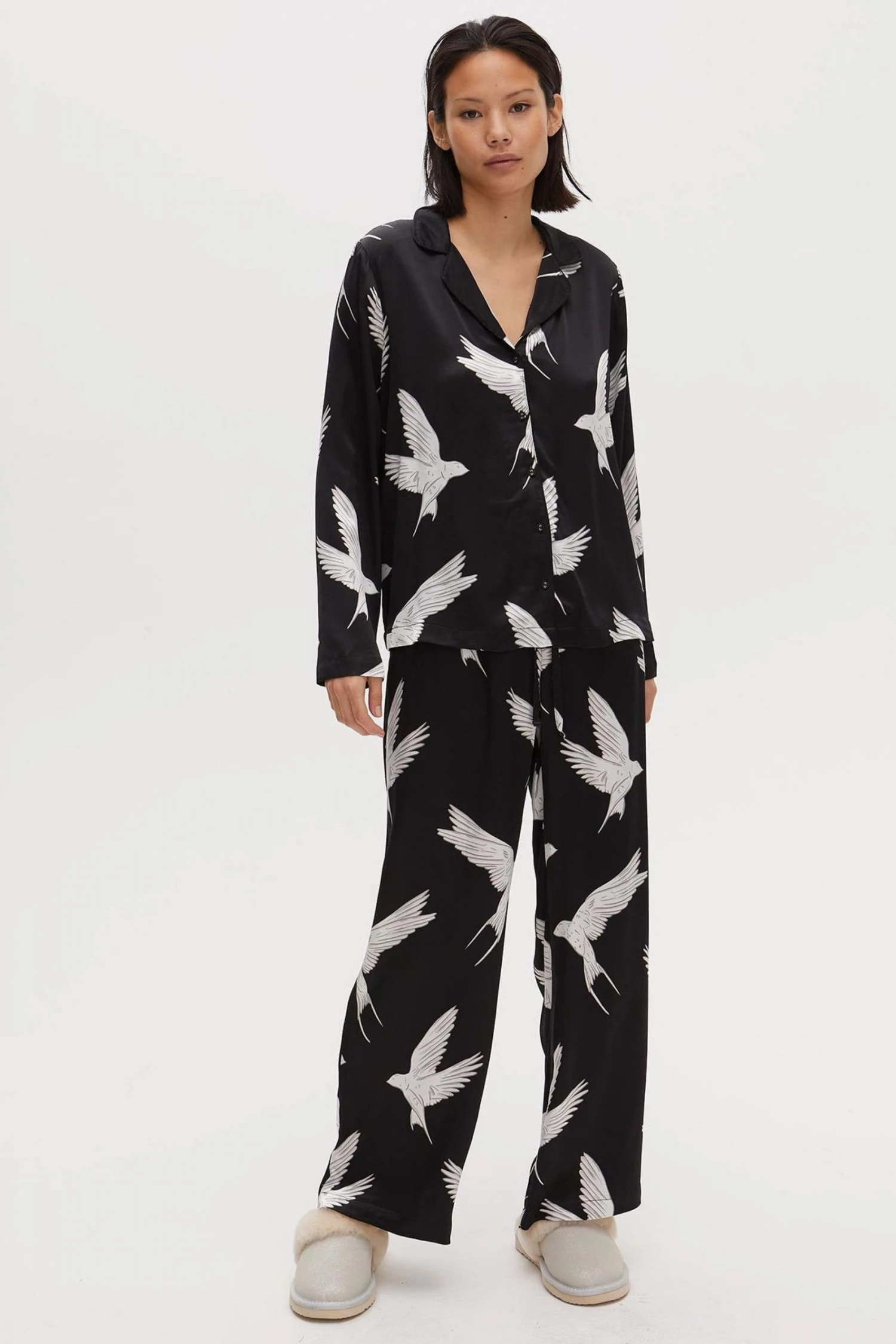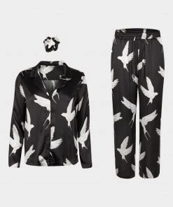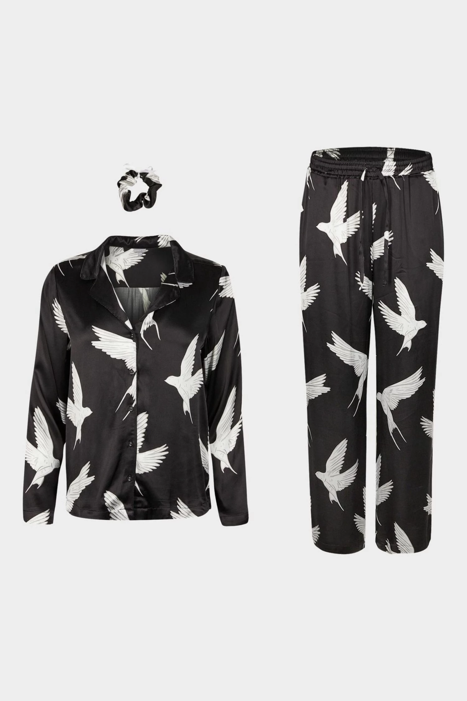 Fly off to dreamland with the Sleepy Swallow Print Pyjama Set, complete with a matching hair scrunchie. Featuring a long sleeve, button down shirt and long pyjama bottoms with an elasticated waist, this set is decorated in a flying bird print in white and grey tones.