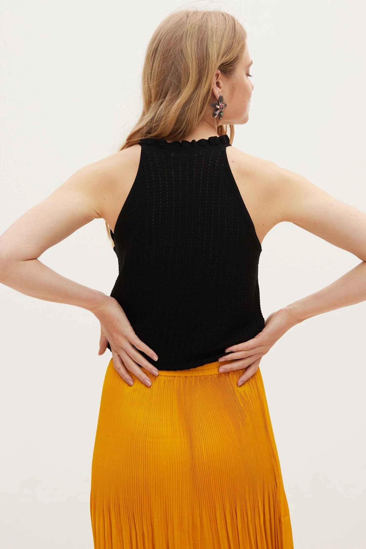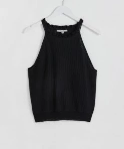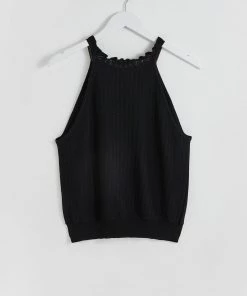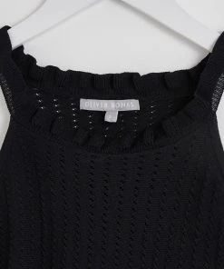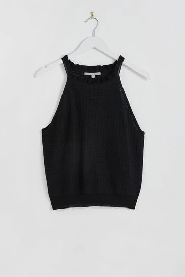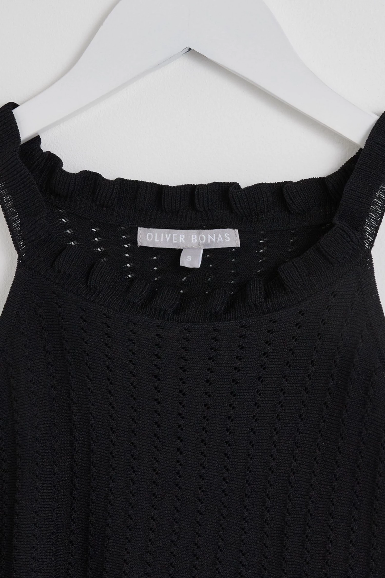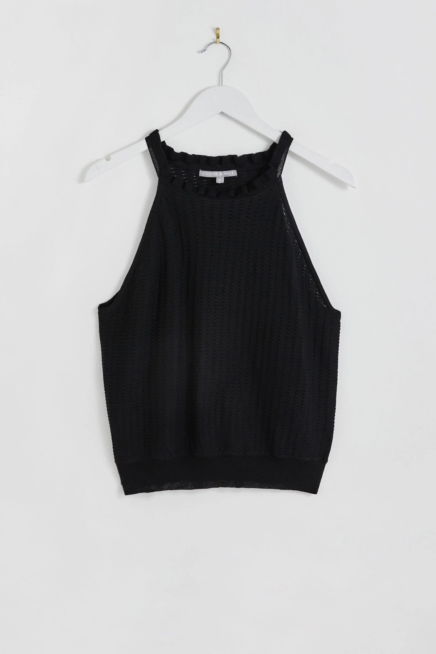 Stay in style this season with this black knit tank top. In an all-over pointelle fabric, this knitted number features a no-sleeve vest style with in a straight profile and is completed with a simple frill detailed round neckline.