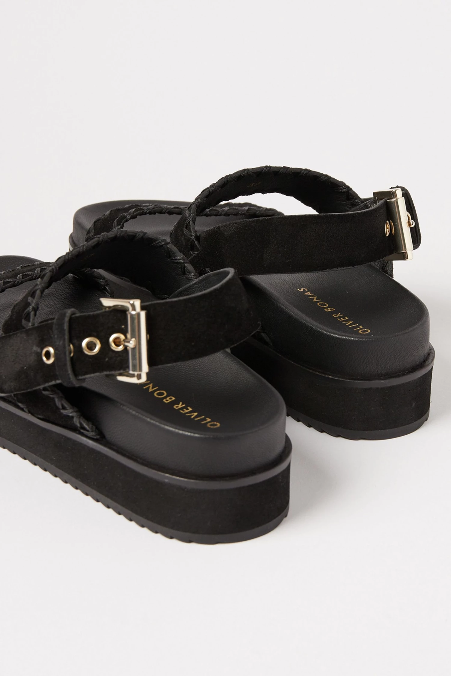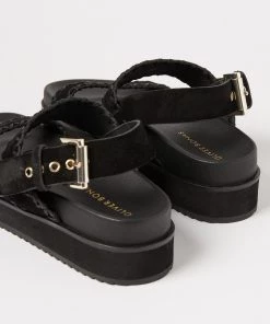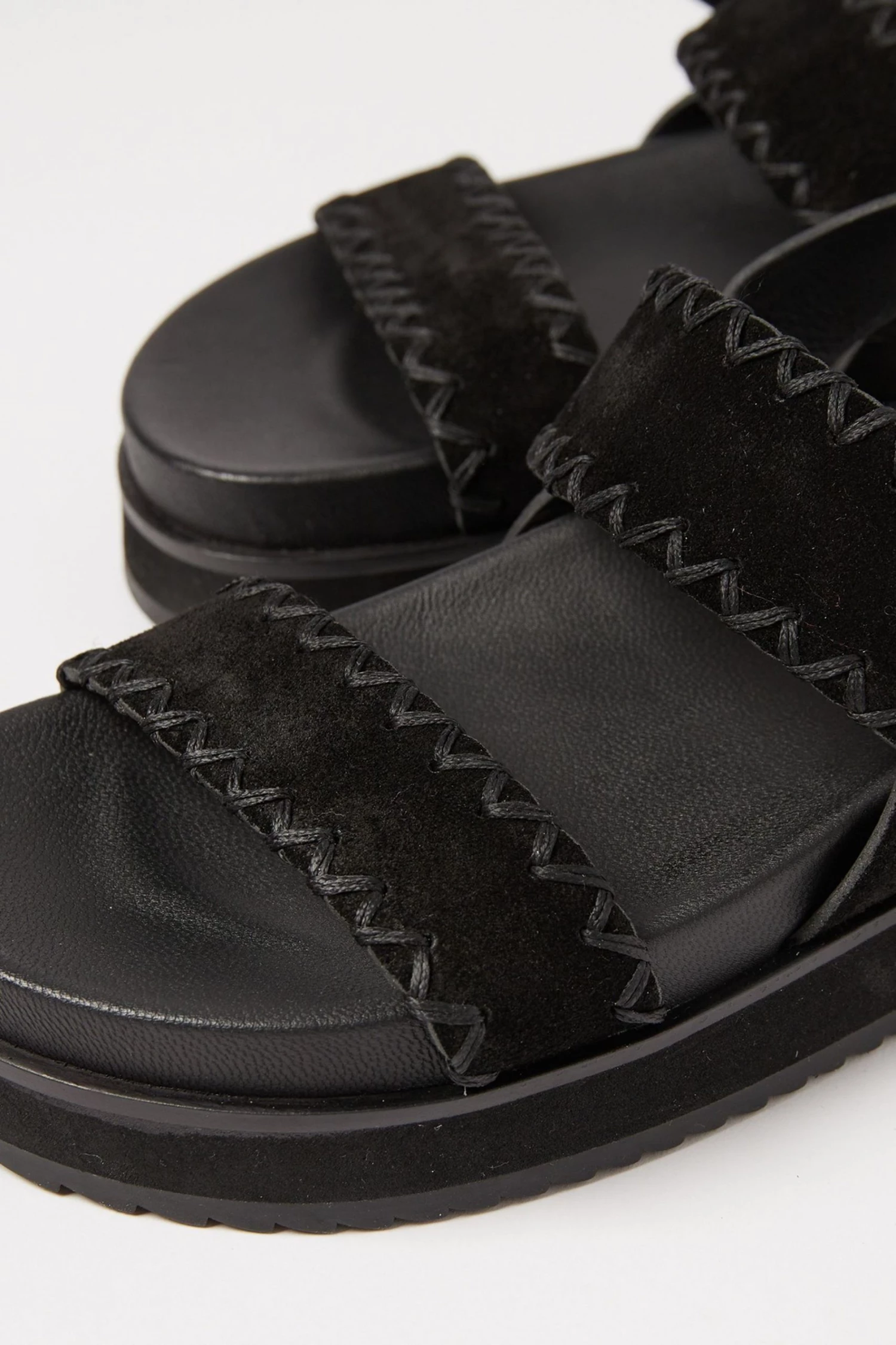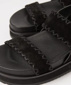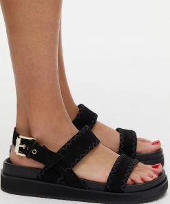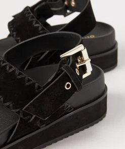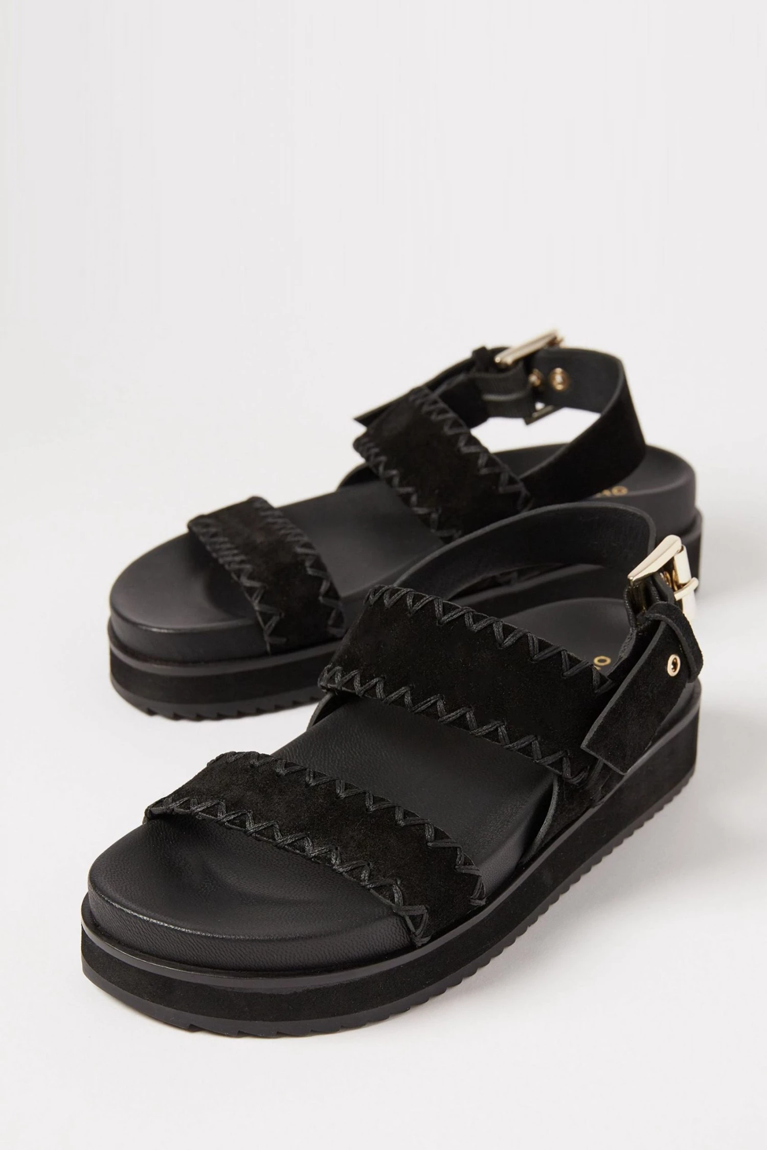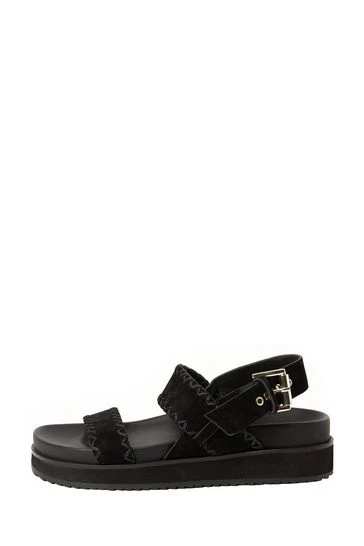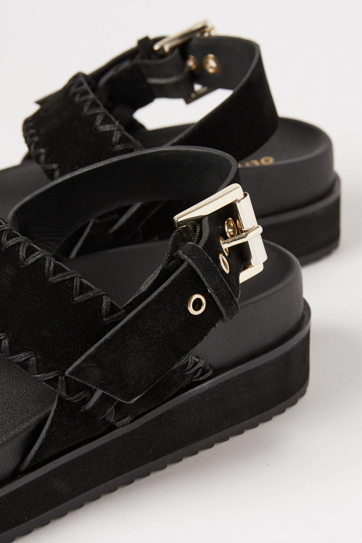 With a curved leather footbed for added comfort, these leather sandals feature strapping at the ankle and across the feet for support. In a chic black tone with whipstitch detailing and with a gold-toned buckle, they are finished with a black flatform sole for a cool and contemporary look.