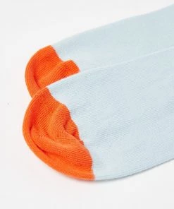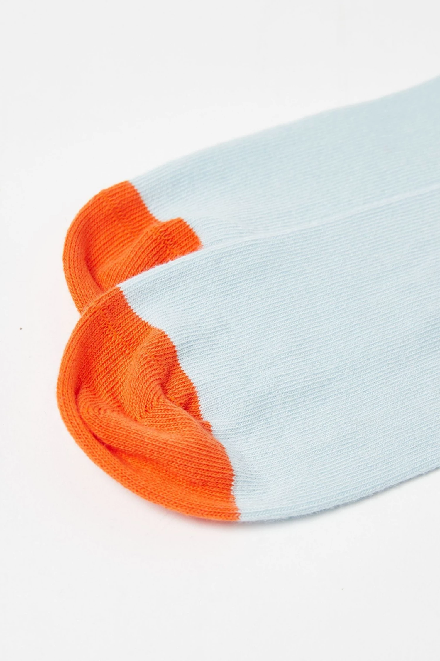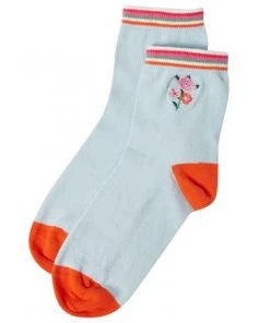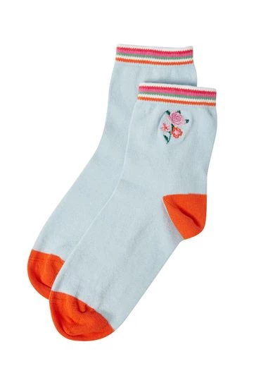 On a light blue pair of socks, orange panels add contrast with a bouquet of embroidered flowers sitting at the sides. With striped cuffs, these socks would make a great gift for a fan of florals.