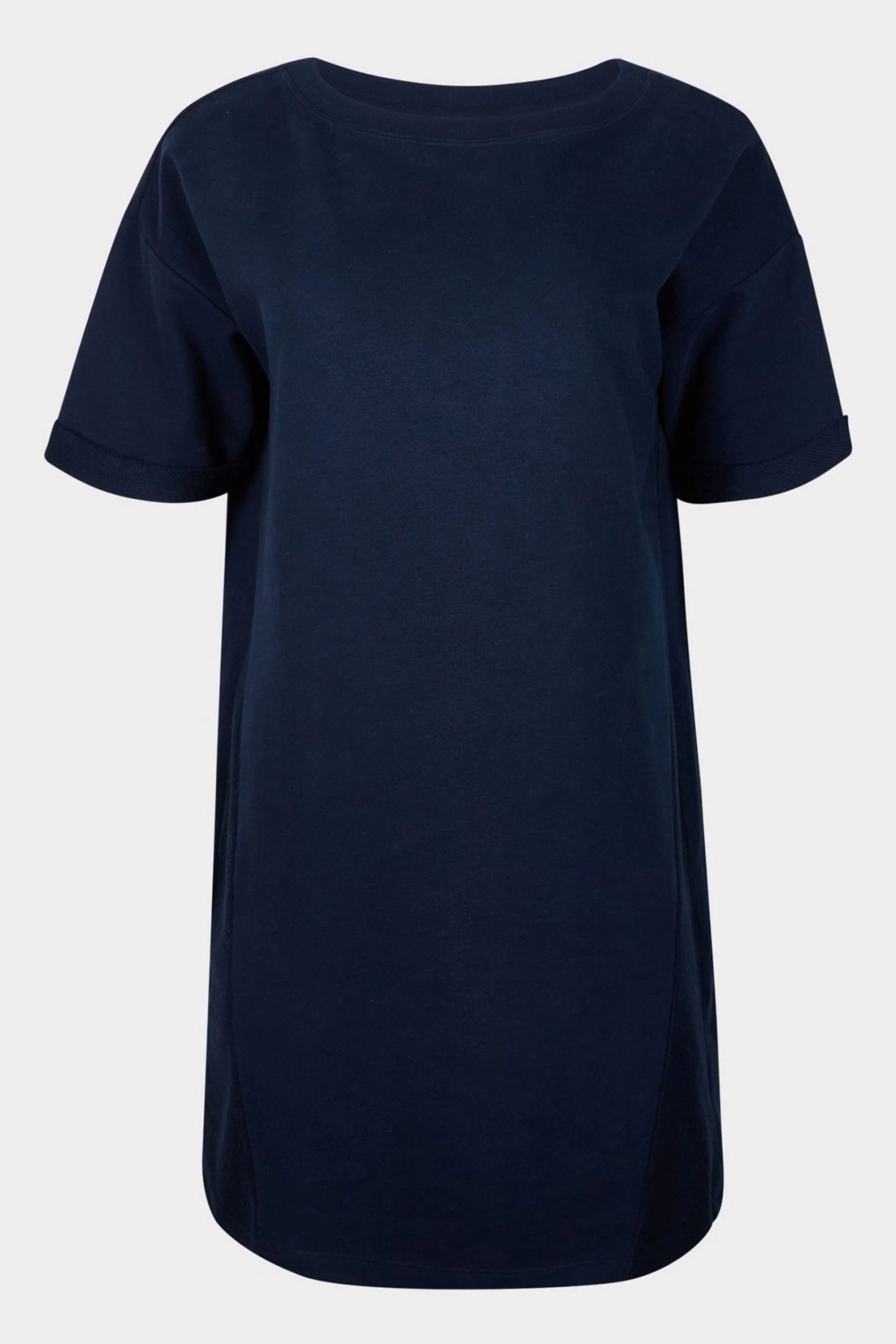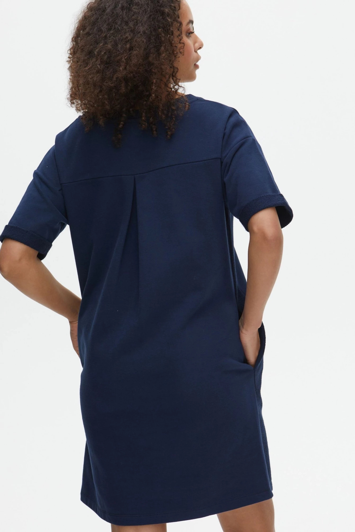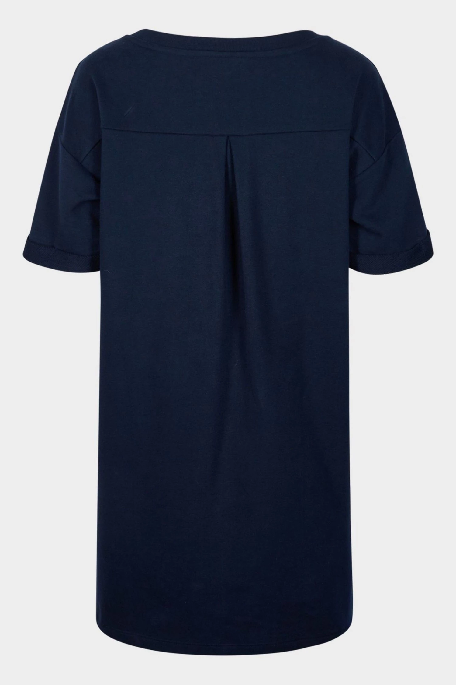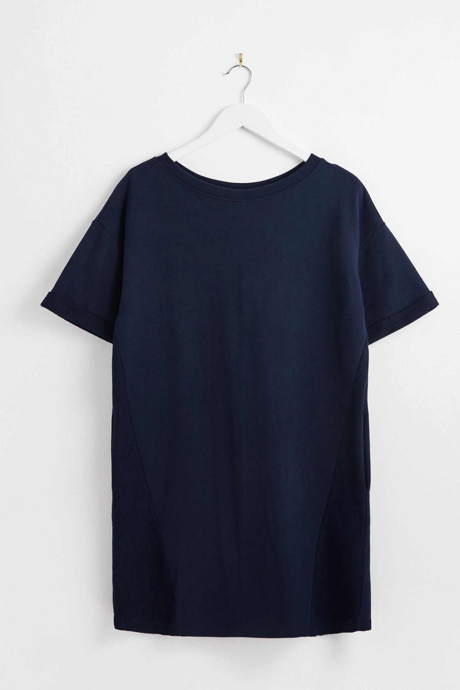 In a relaxed fit, this navy blue sweater dress has short rolled sleeves and a simple round neckline. At the front of the dress, two diagonal stitched lines move towards the middle, creating the illusion of shape. Finishing above the knee, this dress has a single pleated detail at the back and pockets for your essentials.