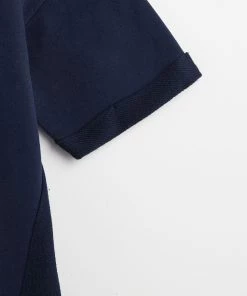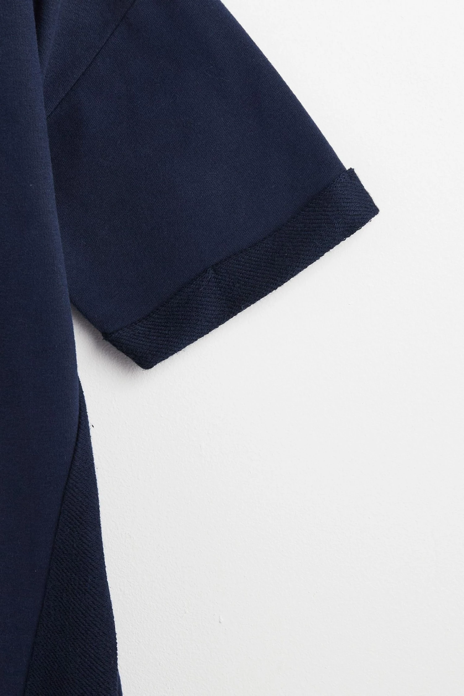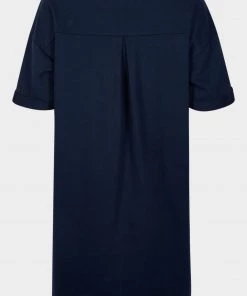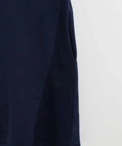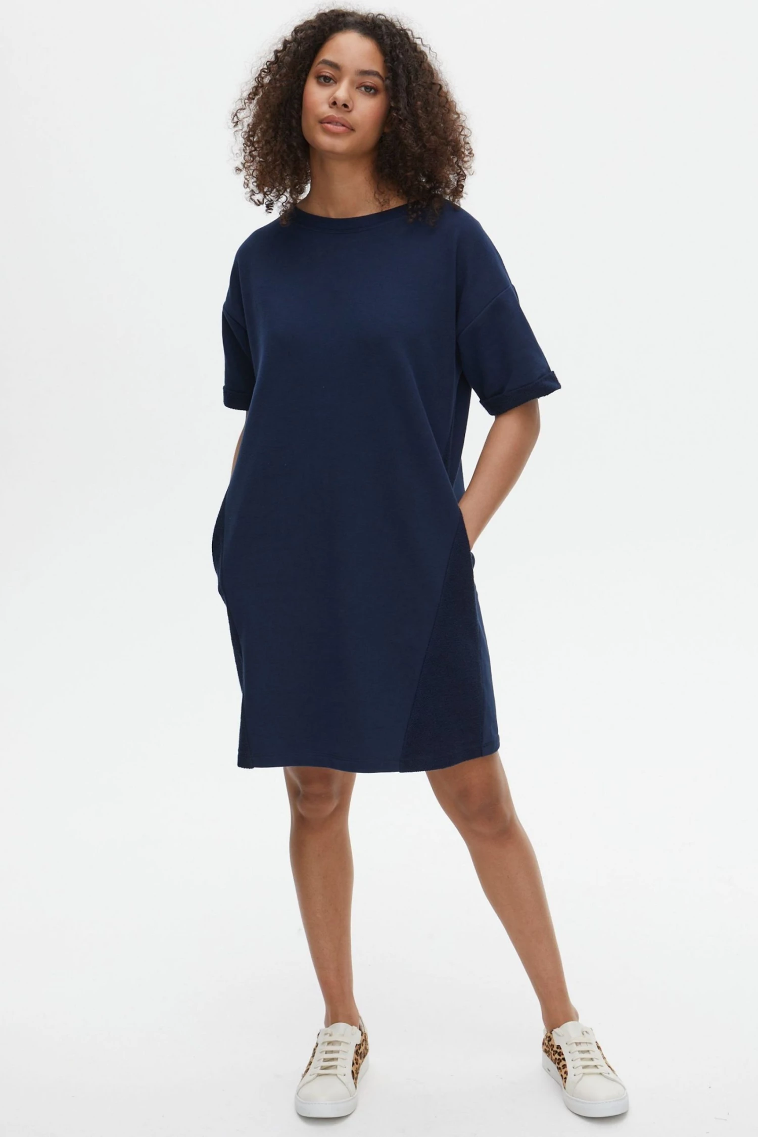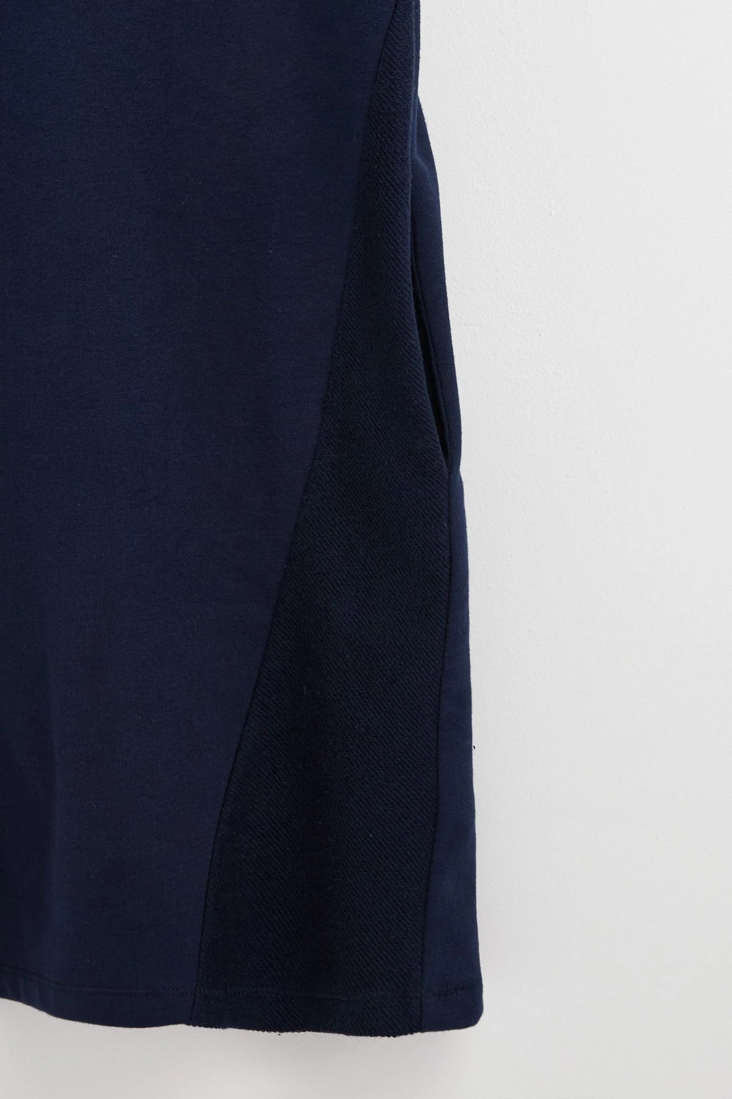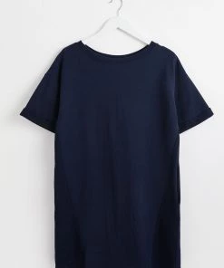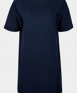 In a relaxed fit, this navy blue sweater dress has short rolled sleeves and a simple round neckline. At the front of the dress, two diagonal stitched lines move towards the middle, creating the illusion of shape. Finishing above the knee, this dress has a single pleated detail at the back and pockets for your essentials.