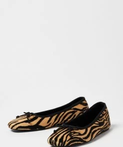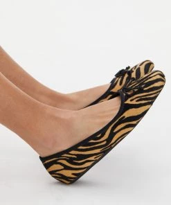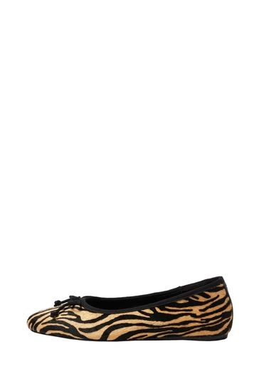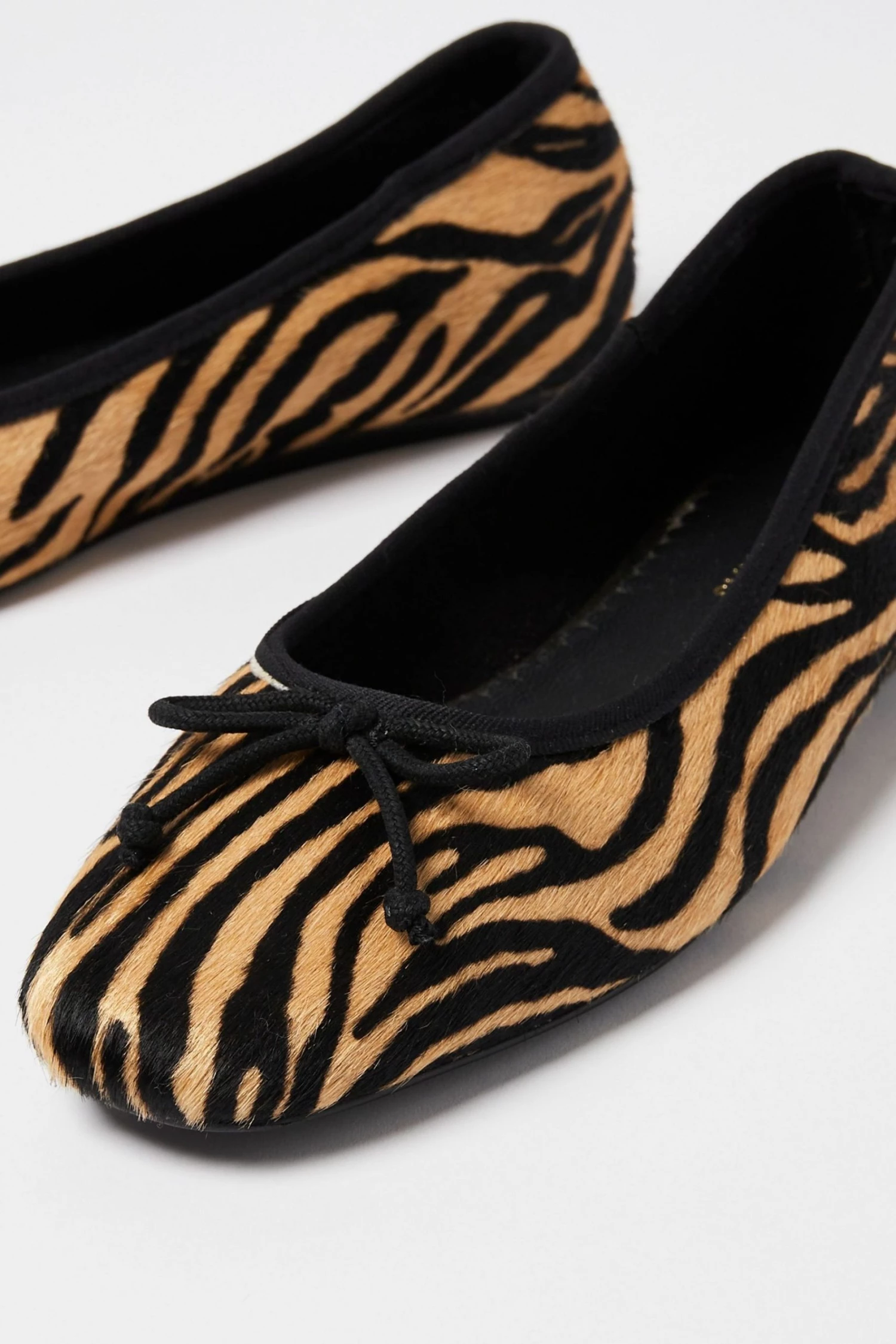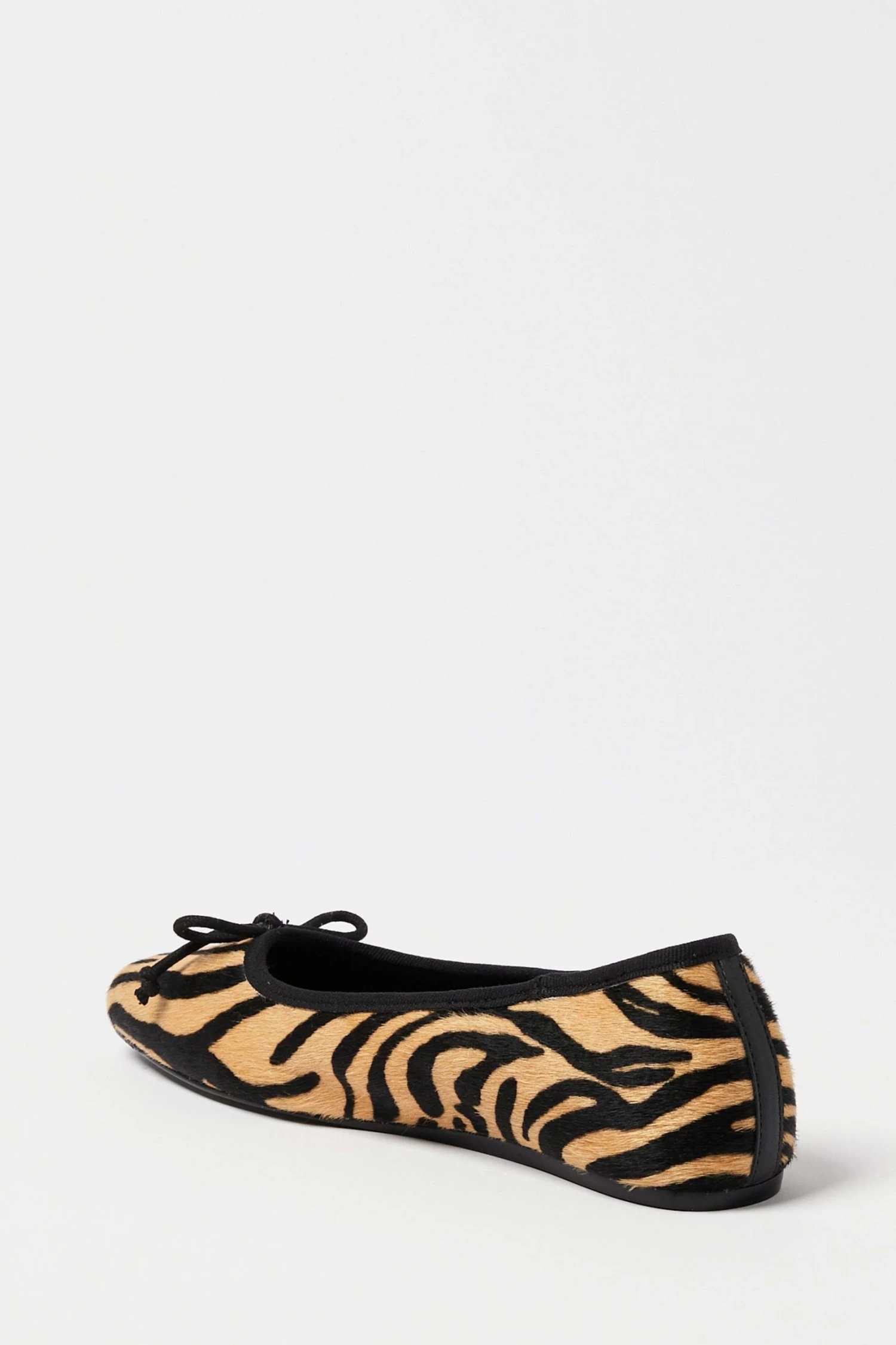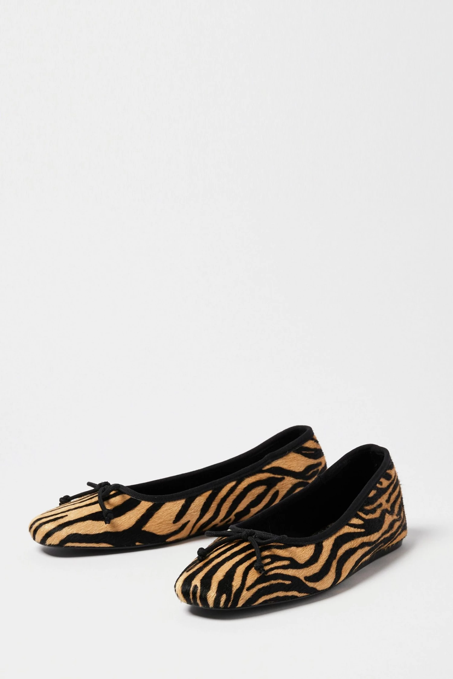 In a classic ballet shoe silhouette, these pumps are adorned in a textured tiger print, complete with black piping and a bow on the front.