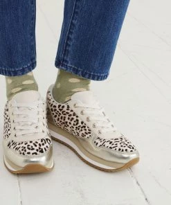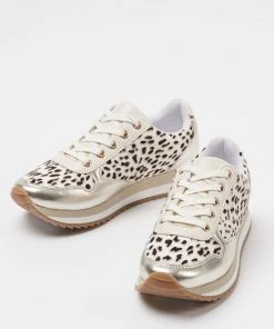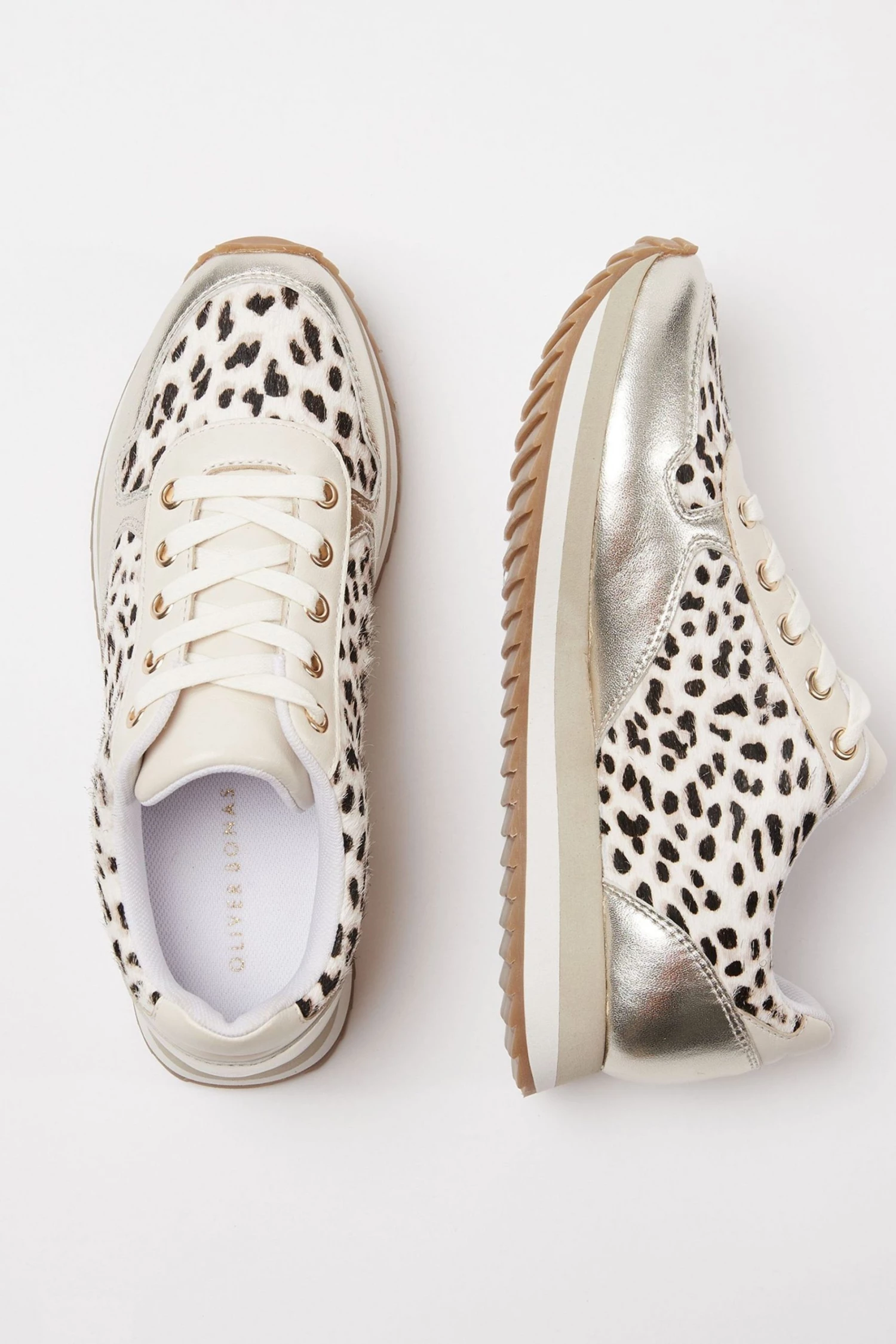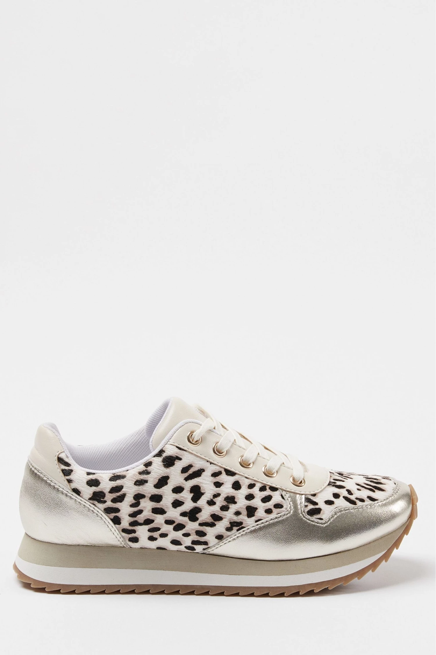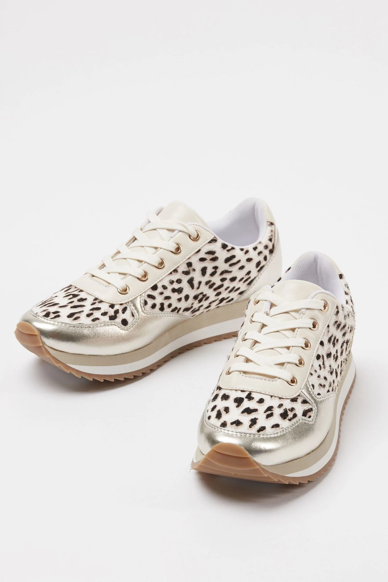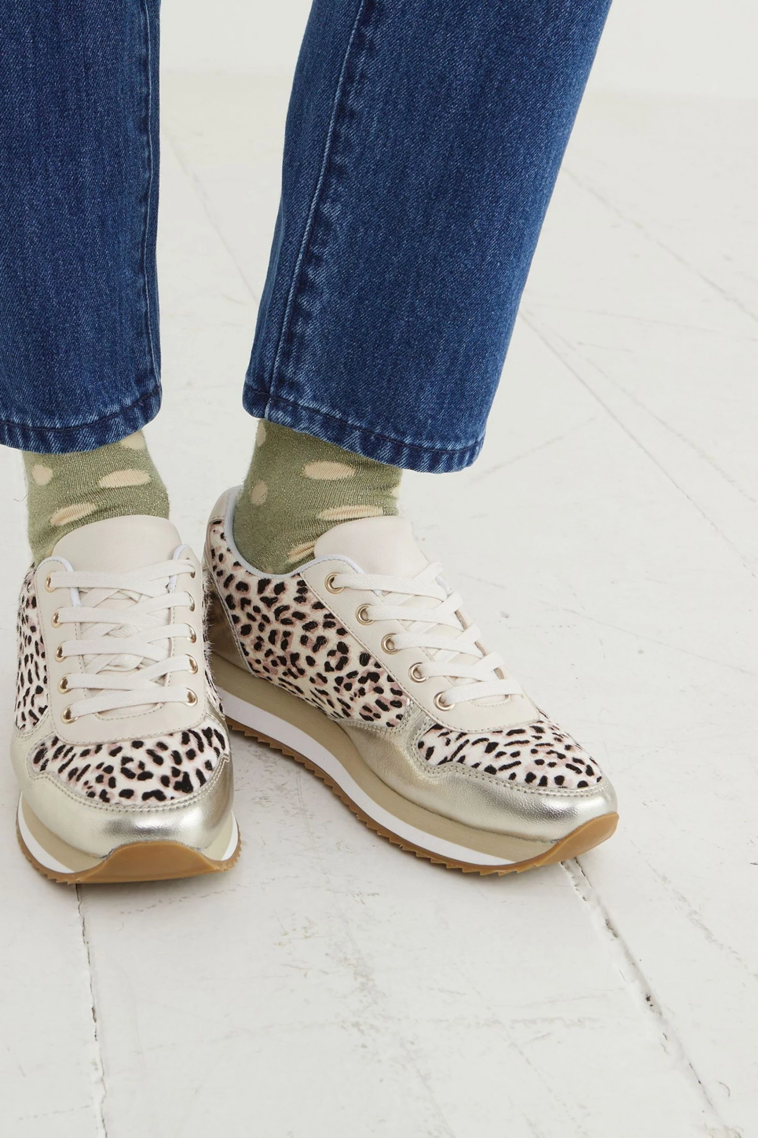 Combining textured animal print with a colourblocked design in metallic gold and cream tones, these soft-touch suede leather trainers lend a wild touch to your footwear. In a classic sneaker style with a gently pointed toe, these trainers are completed with lace-up fastenings and rubber soles.