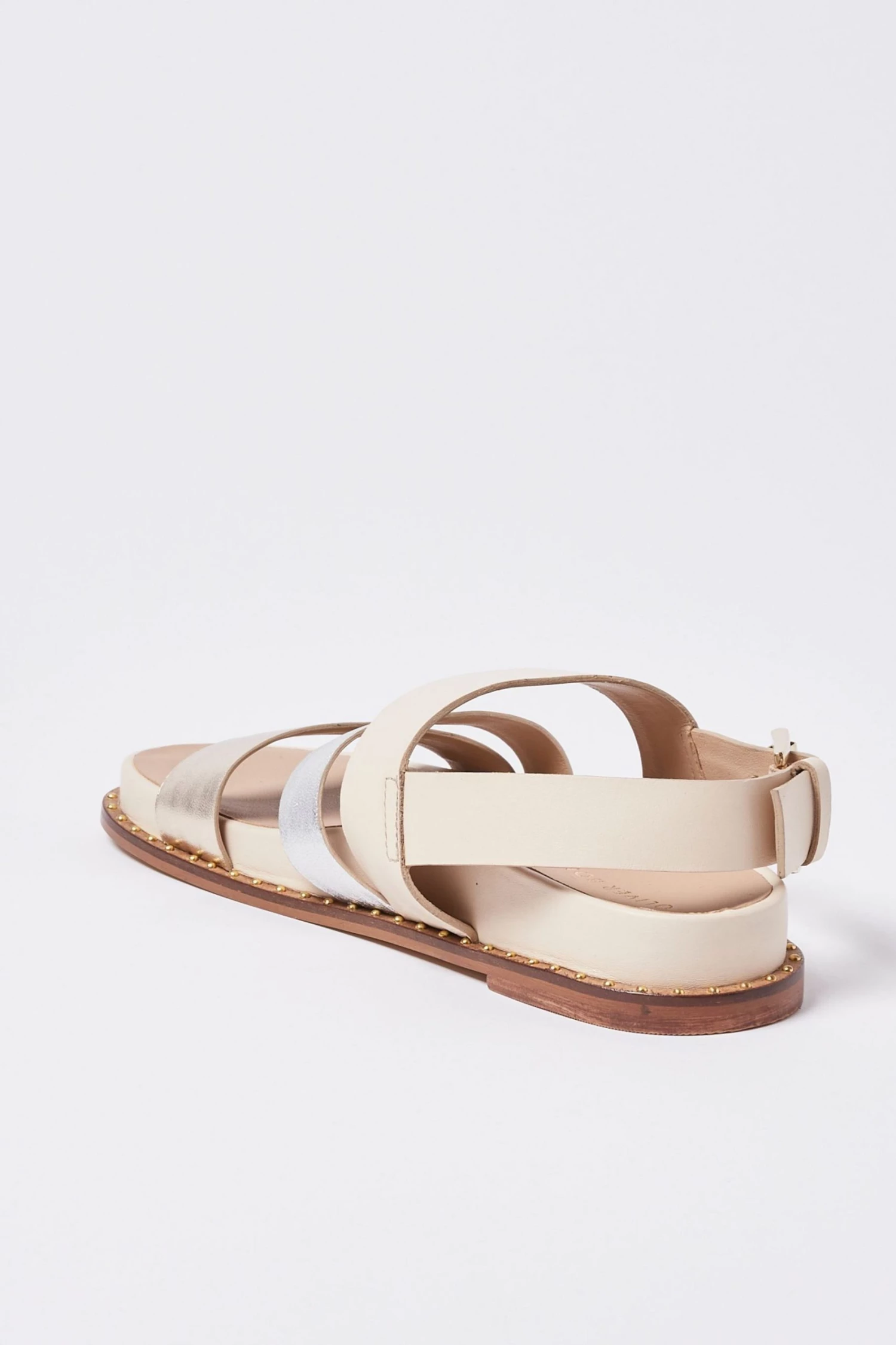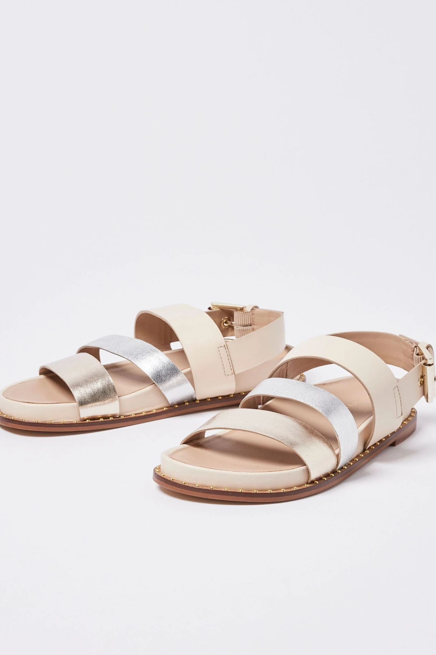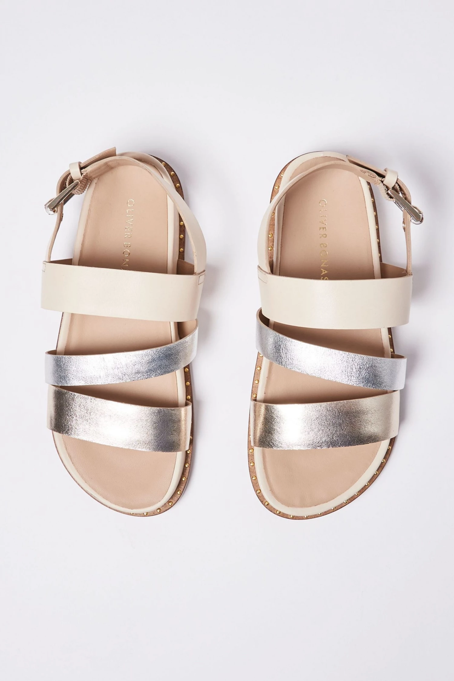 Combining metallic silver and gold tones with a neutral cream hue, these leather strappy sandals feature a raised footbed with gold studded trims. A gold toned buckle wraps around the heel, all sitting on a brown sole with a slim profile.