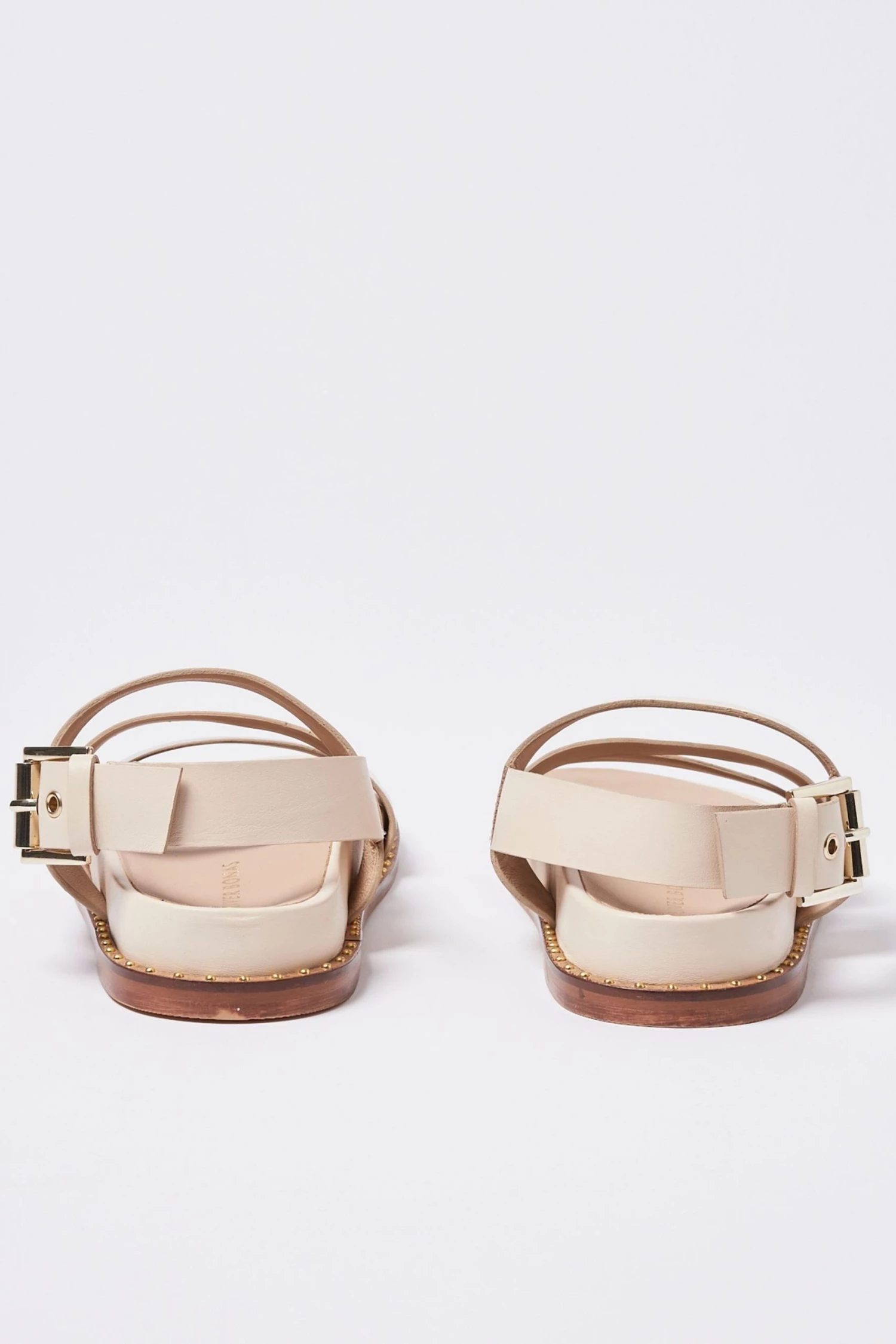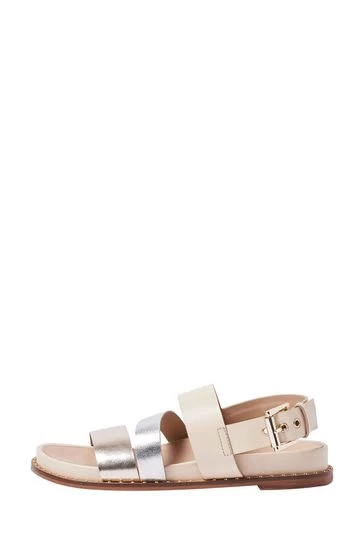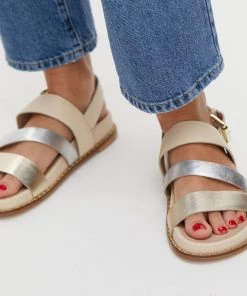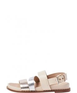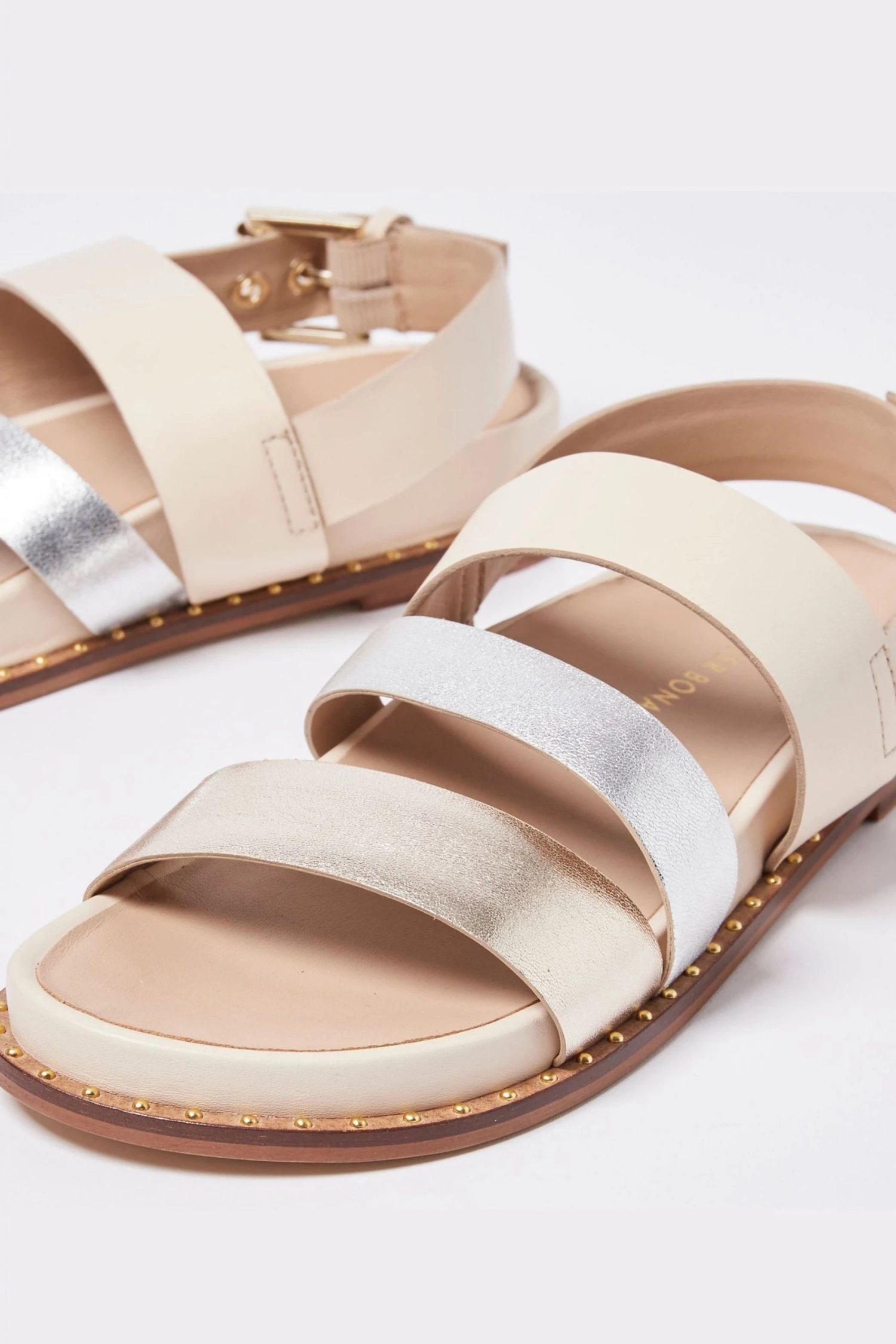 Combining metallic silver and gold tones with a neutral cream hue, these leather strappy sandals feature a raised footbed with gold studded trims. A gold toned buckle wraps around the heel, all sitting on a brown sole with a slim profile.