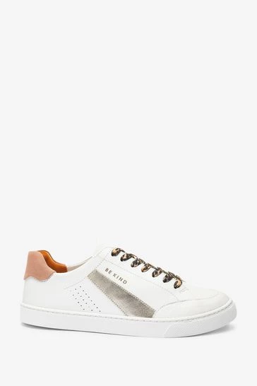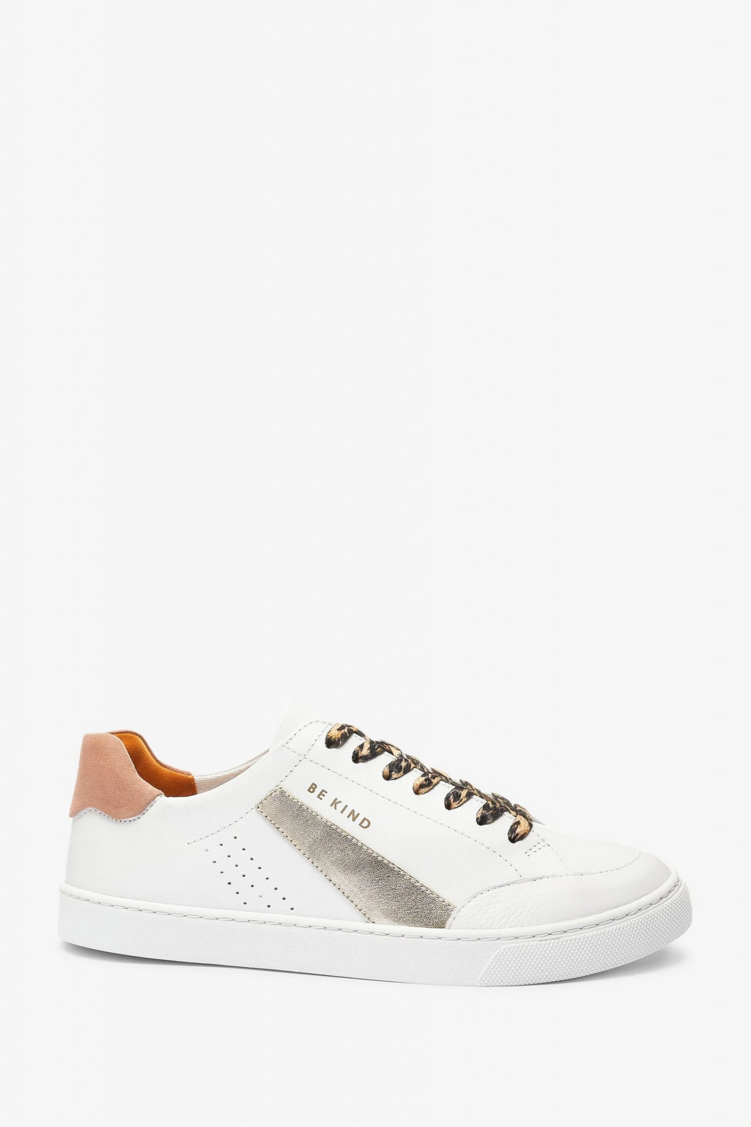 With their classic low top profile, these trainers feature a sparkling gold panel on the side and vibrant pink and orange panels on the back, finished with animal print laces to contrast their fresh white colour.
