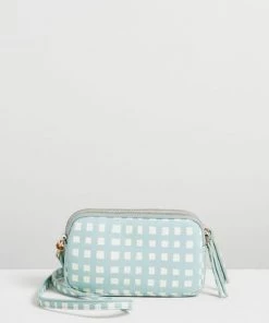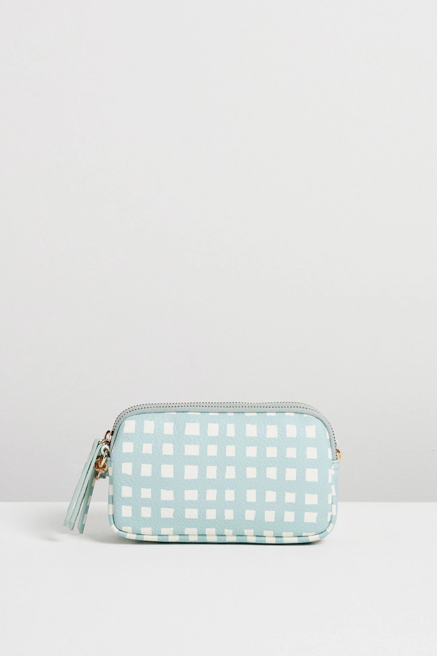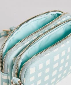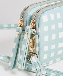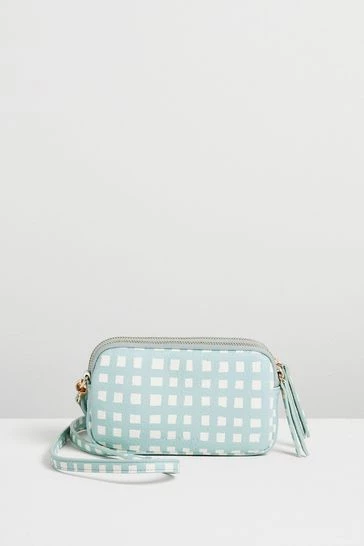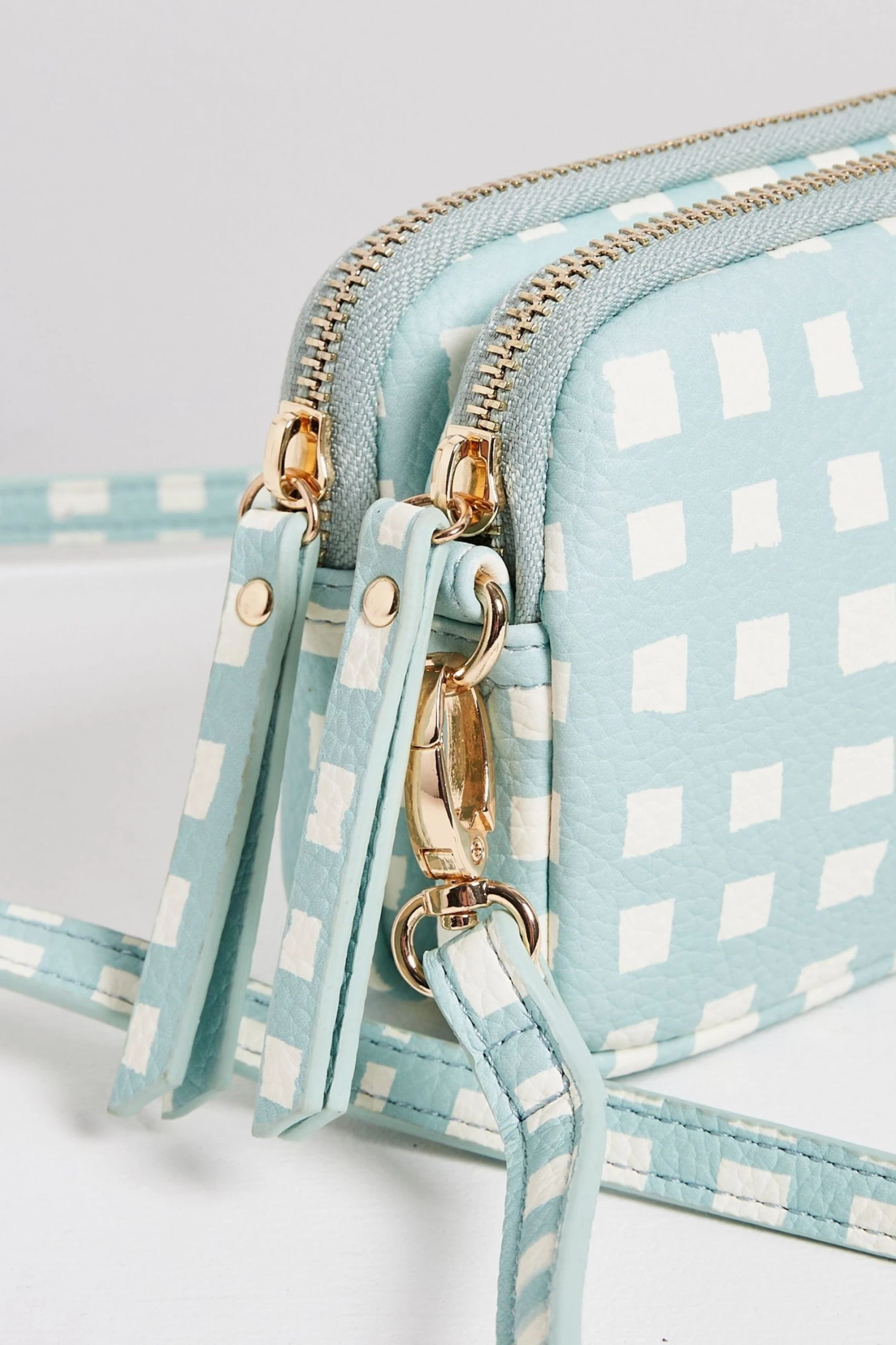 Check finding your new favourite summer bag off your list with this compact mint green style. Featuring a checked print with two compartments and zip fastenings to keep your essentials safe, it is complete with golden metalware and a cross-body strap.
