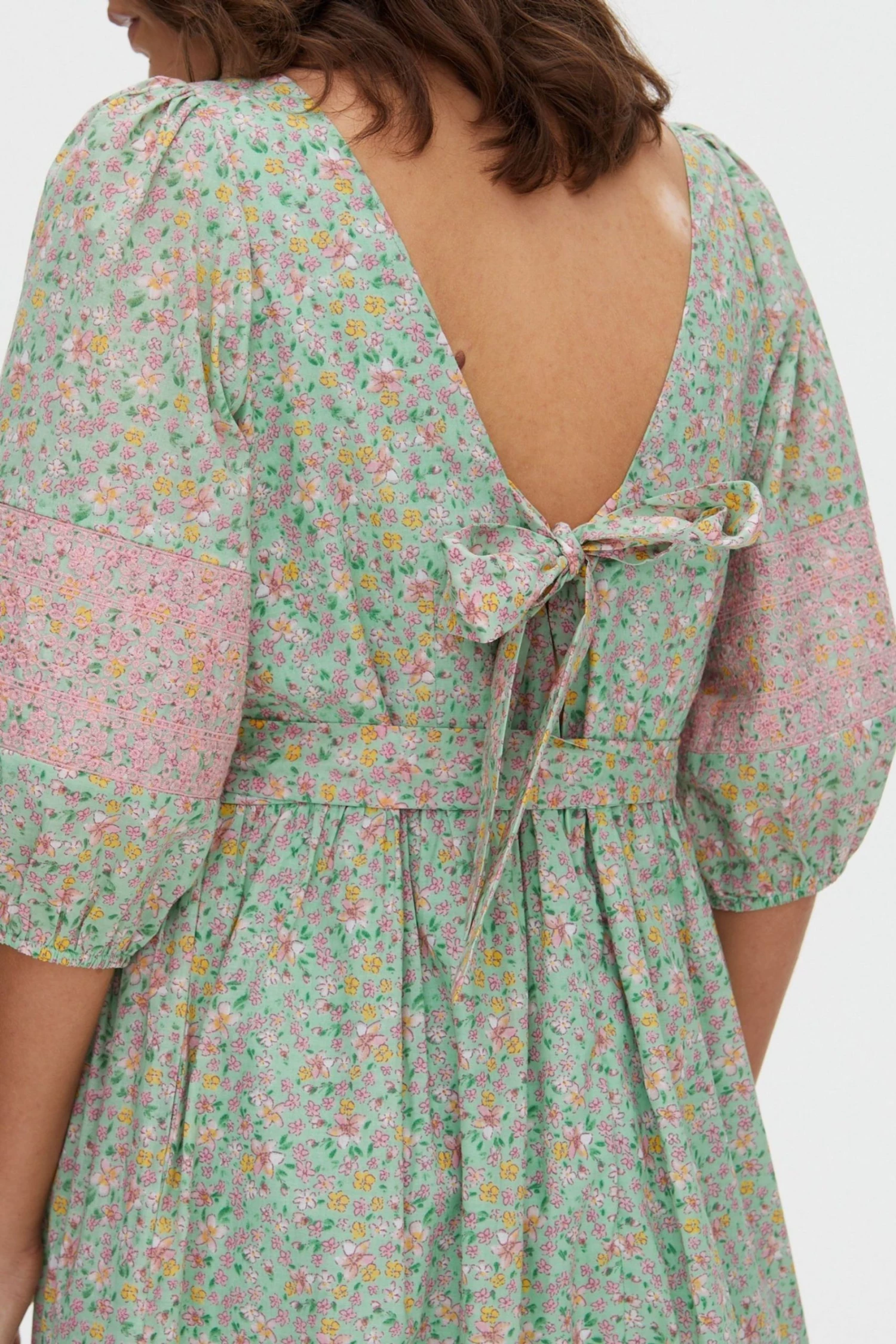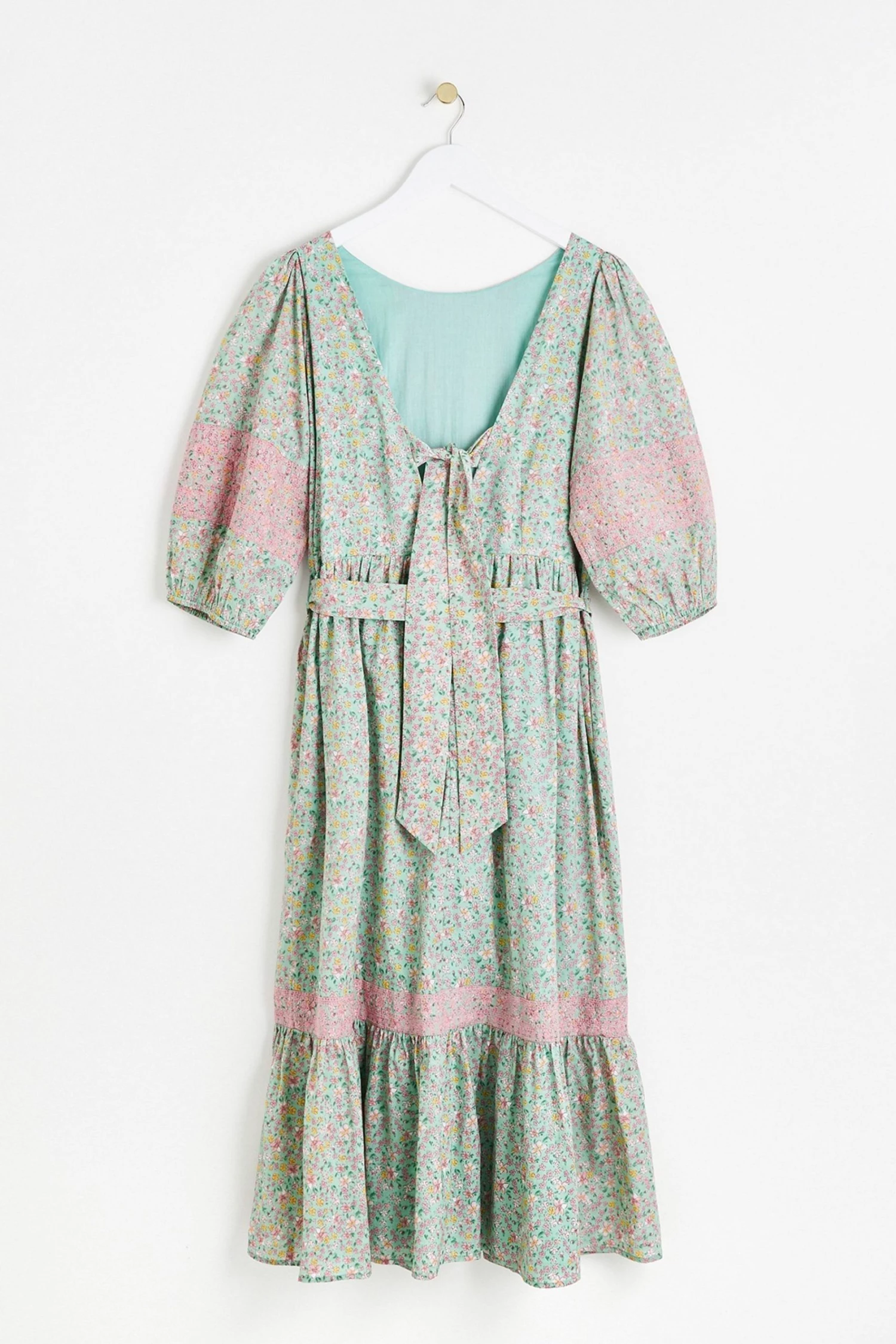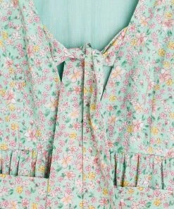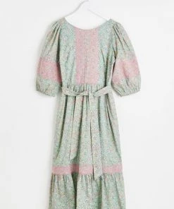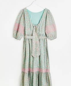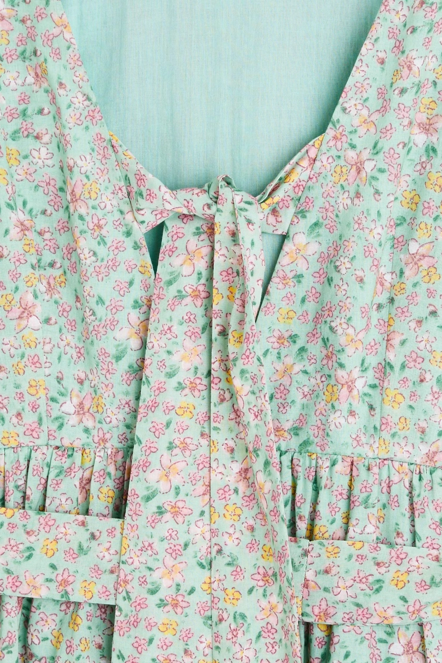 In an all over green and pink floral print, this midi dress features a bold tie up fastening at the back as well as a tie belt to cinch in the waist. Three quarter length balloon sleeves with elasticated cuffs are joined by a round neckline and V-shaped back. A tiered, pleated skirt completes this dress, wear to your next social event with sandals and cross-body bag to be the star the of the show.