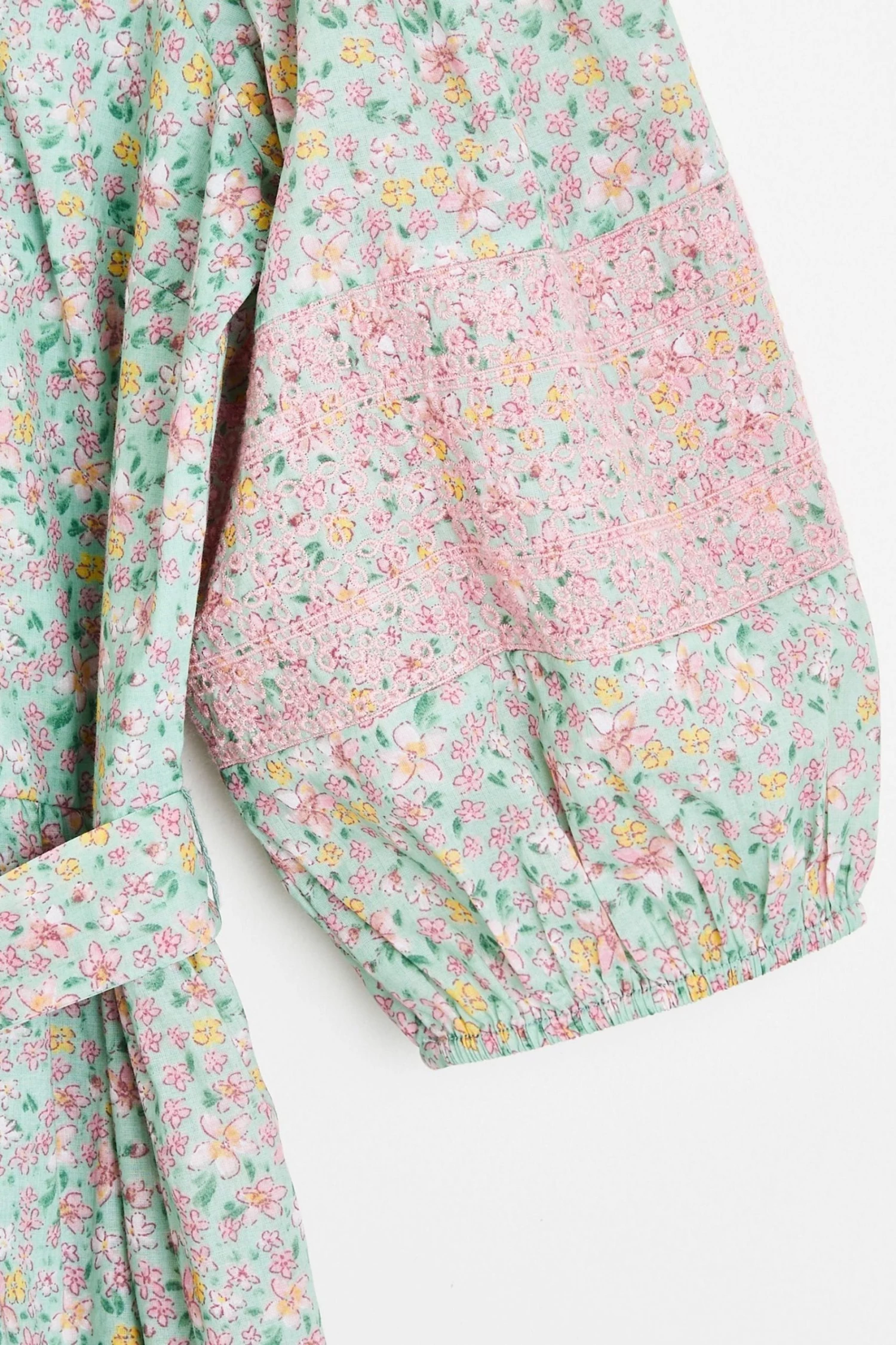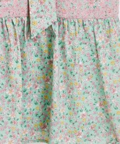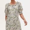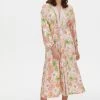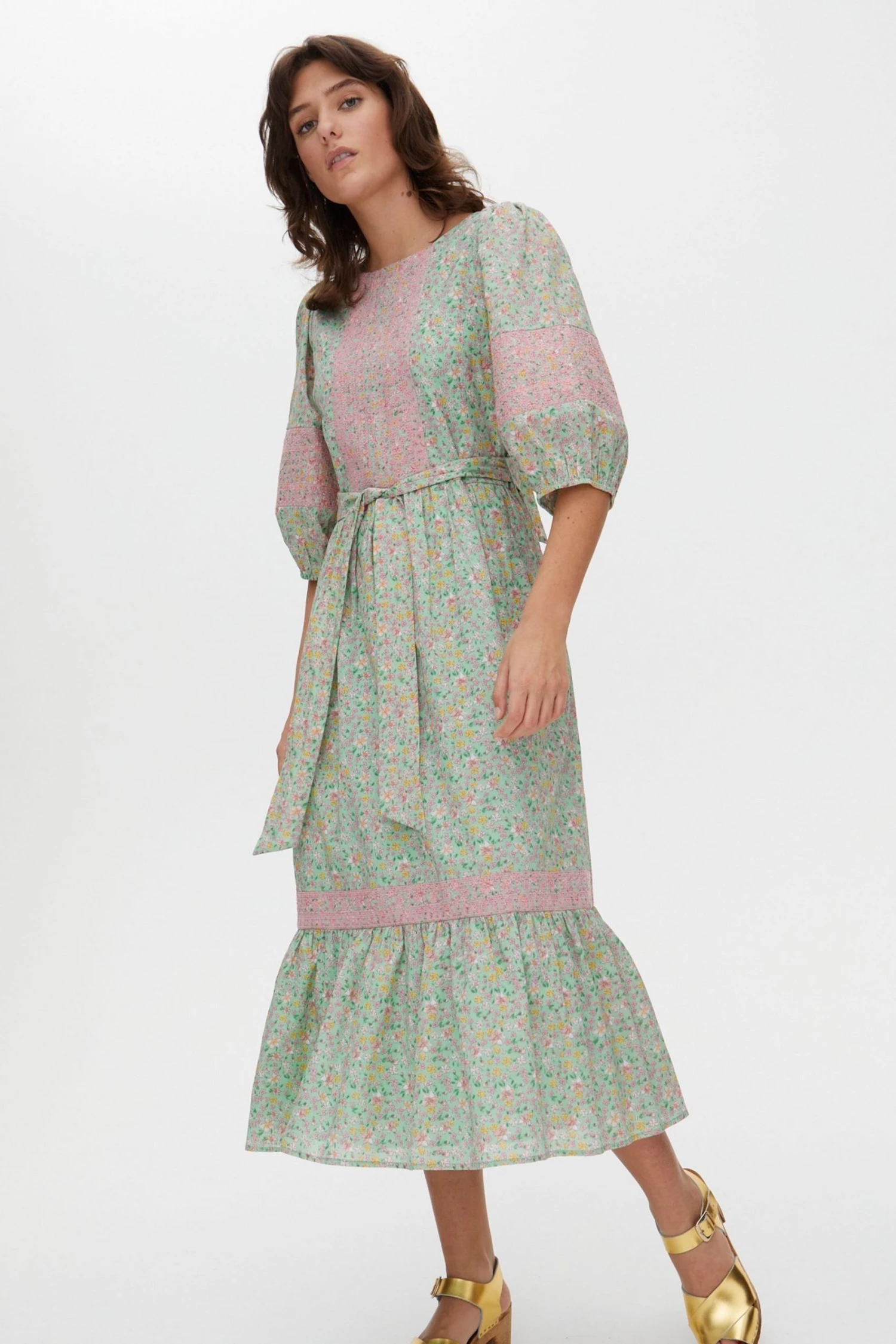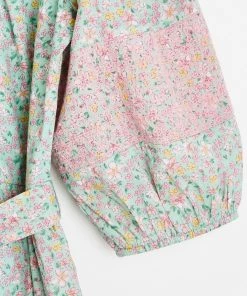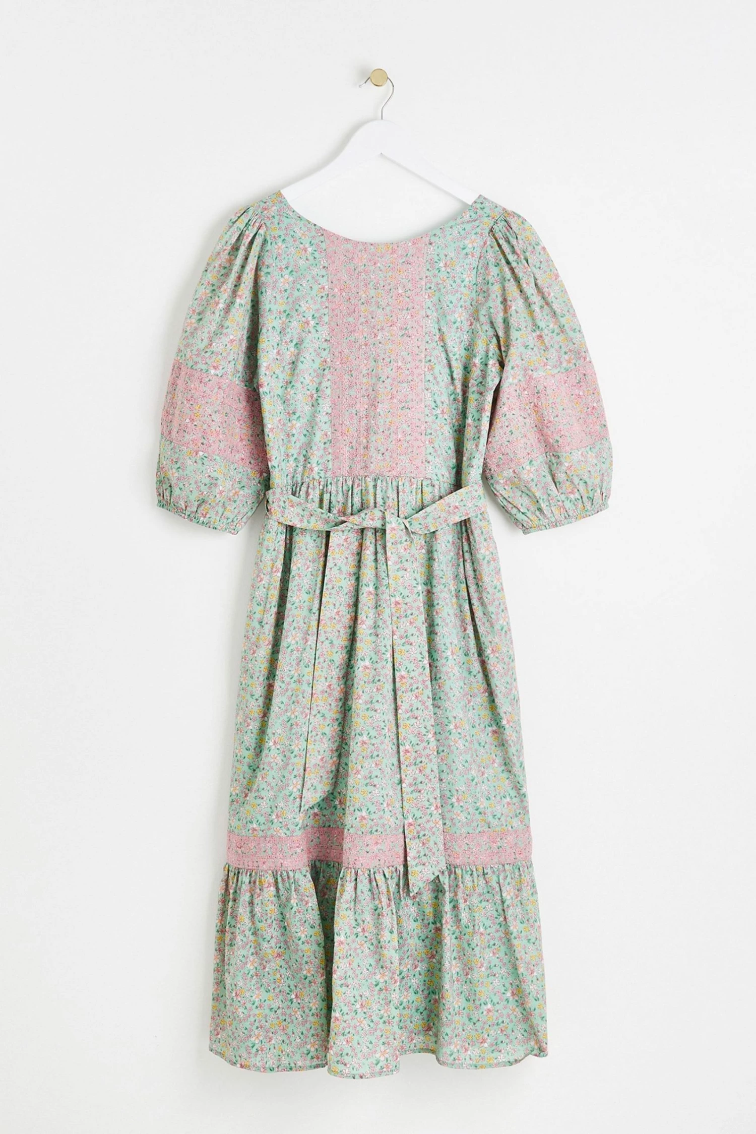 In an all over green and pink floral print, this midi dress features a bold tie up fastening at the back as well as a tie belt to cinch in the waist. Three quarter length balloon sleeves with elasticated cuffs are joined by a round neckline and V-shaped back. A tiered, pleated skirt completes this dress, wear to your next social event with sandals and cross-body bag to be the star the of the show.