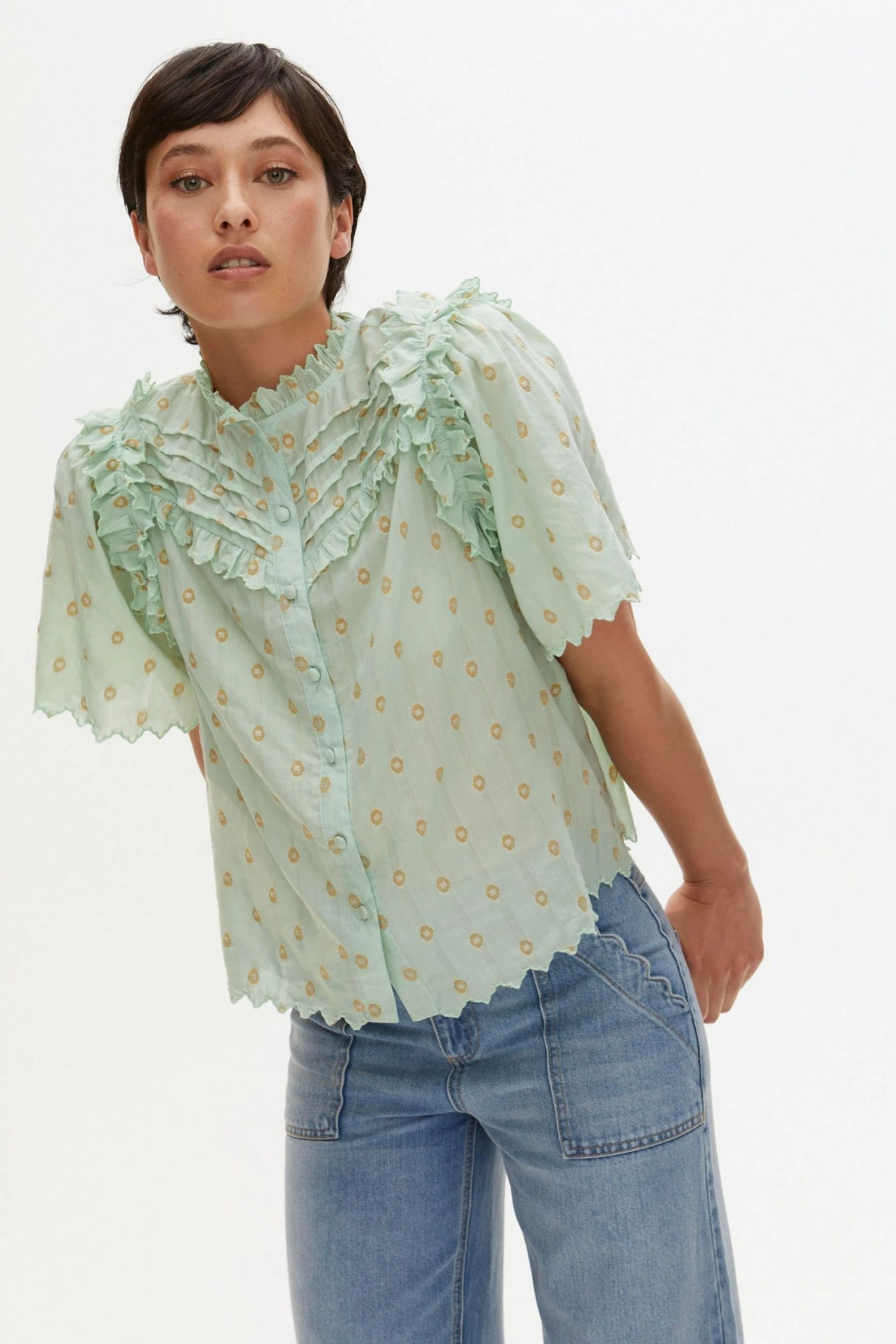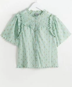 Be the first to review “Oliver Bonas Green Foil Polka Dot Print Frill Blouse” Cancel reply