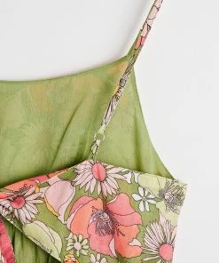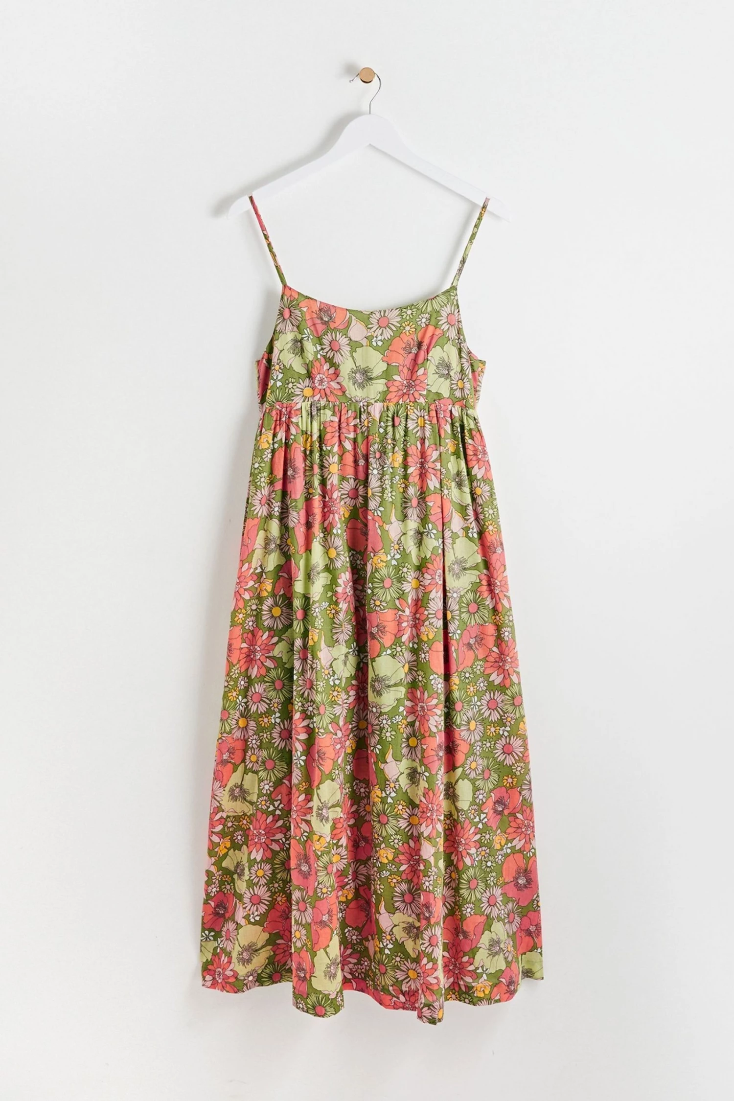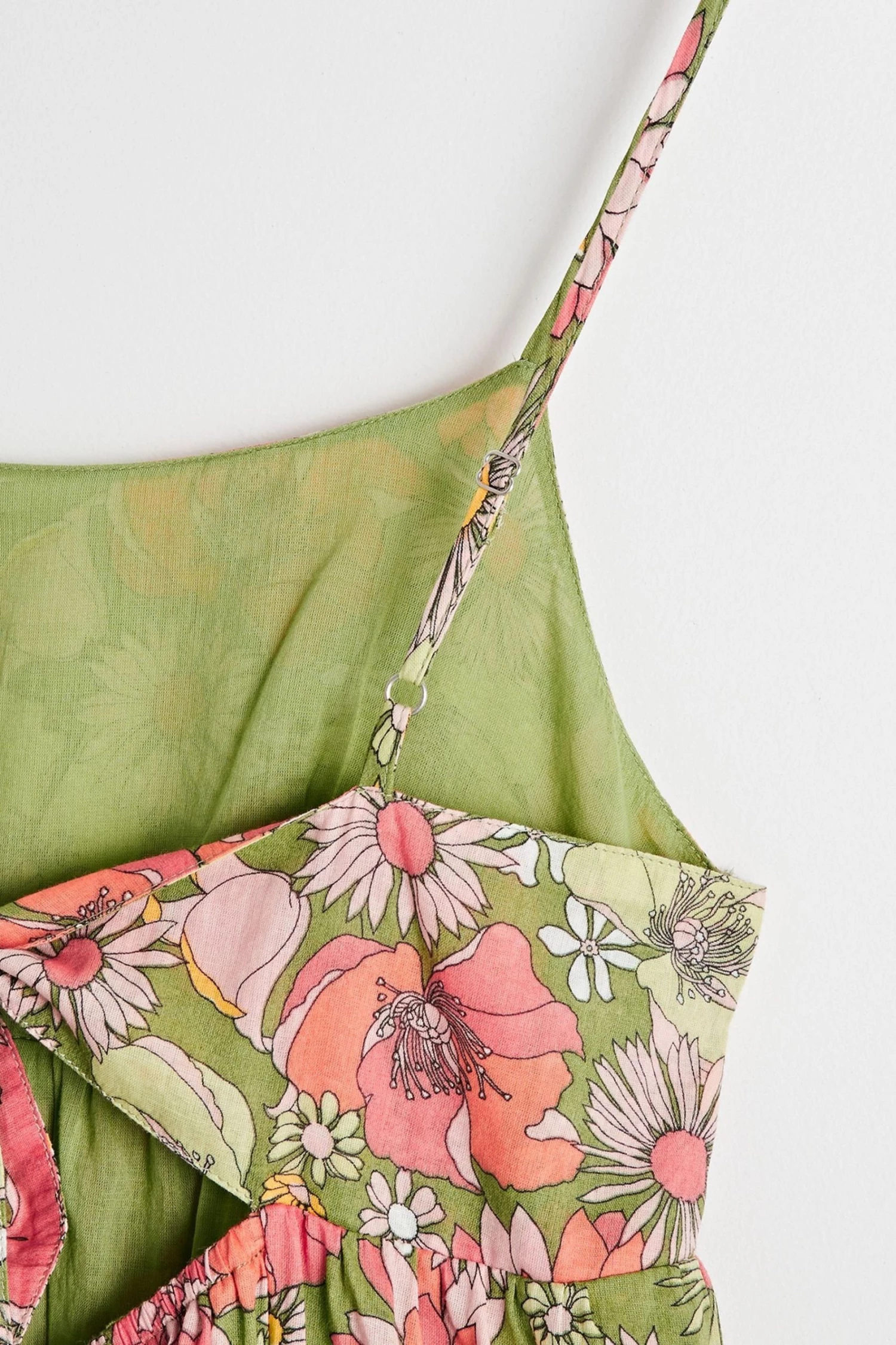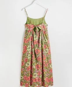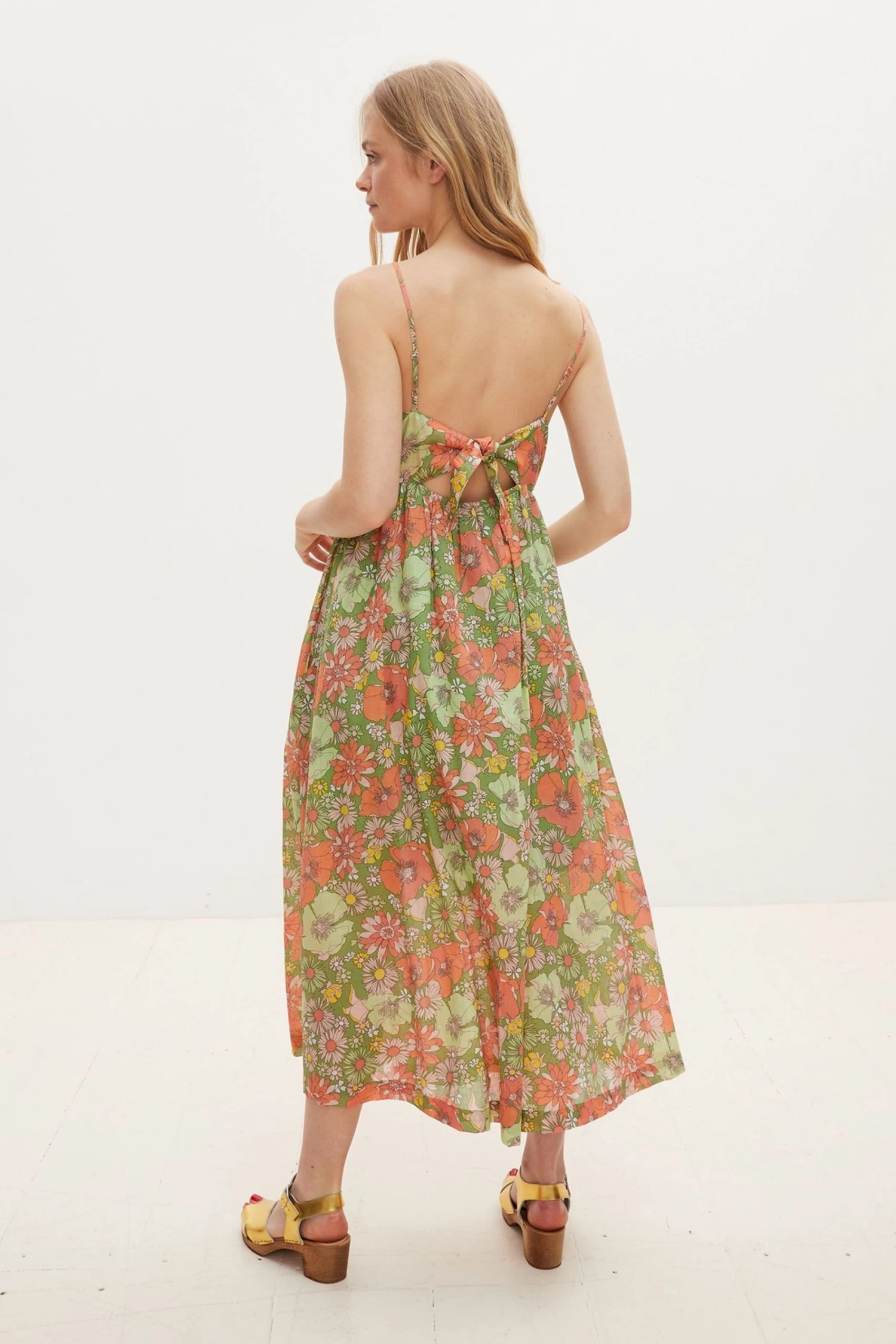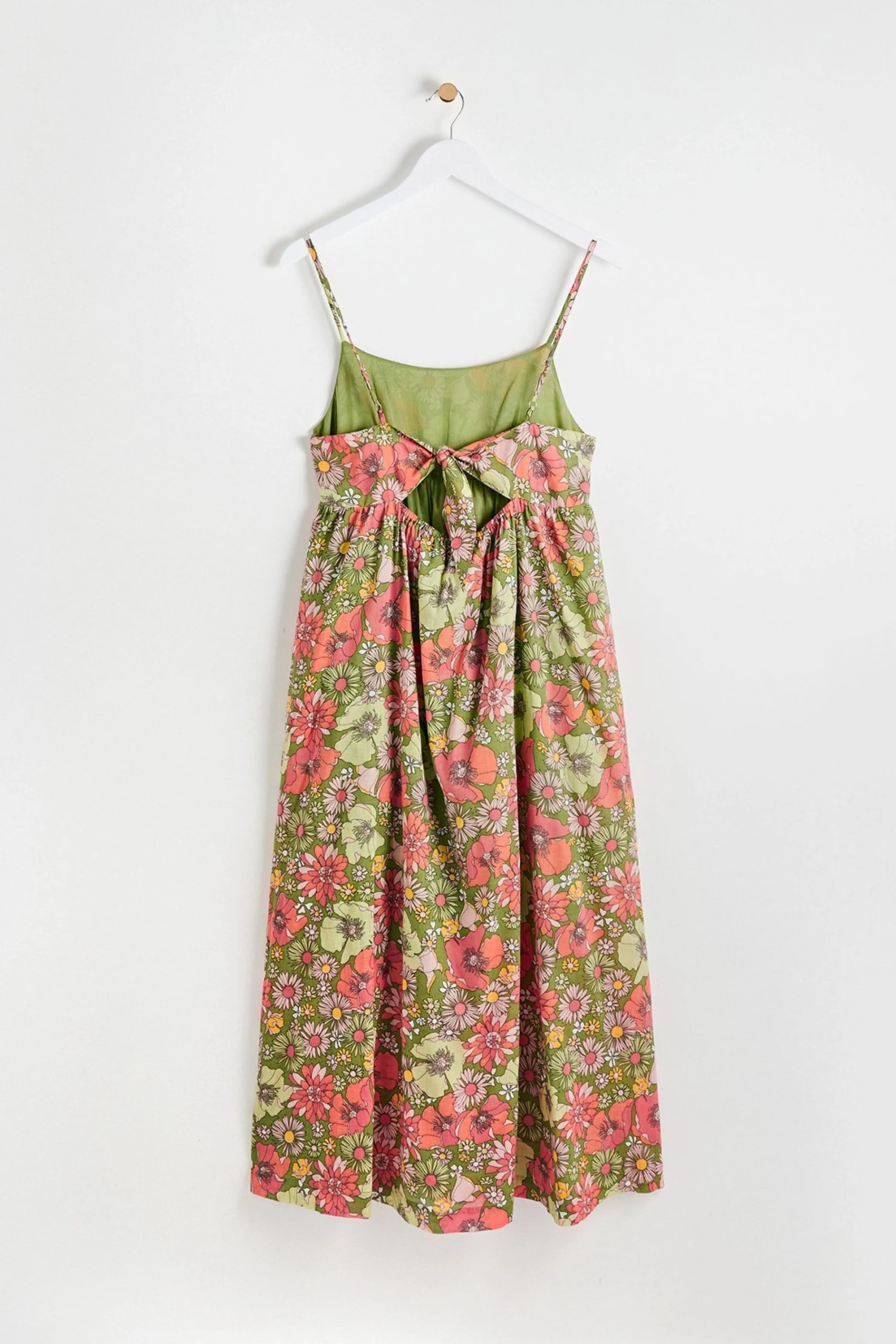 Featuring a busy green and pink floral print, this A-line midi dress has a tie up back design and thin profile straps. With a unique high waistline, this summer inspired dress can be paired with sandals to complete the look.