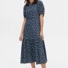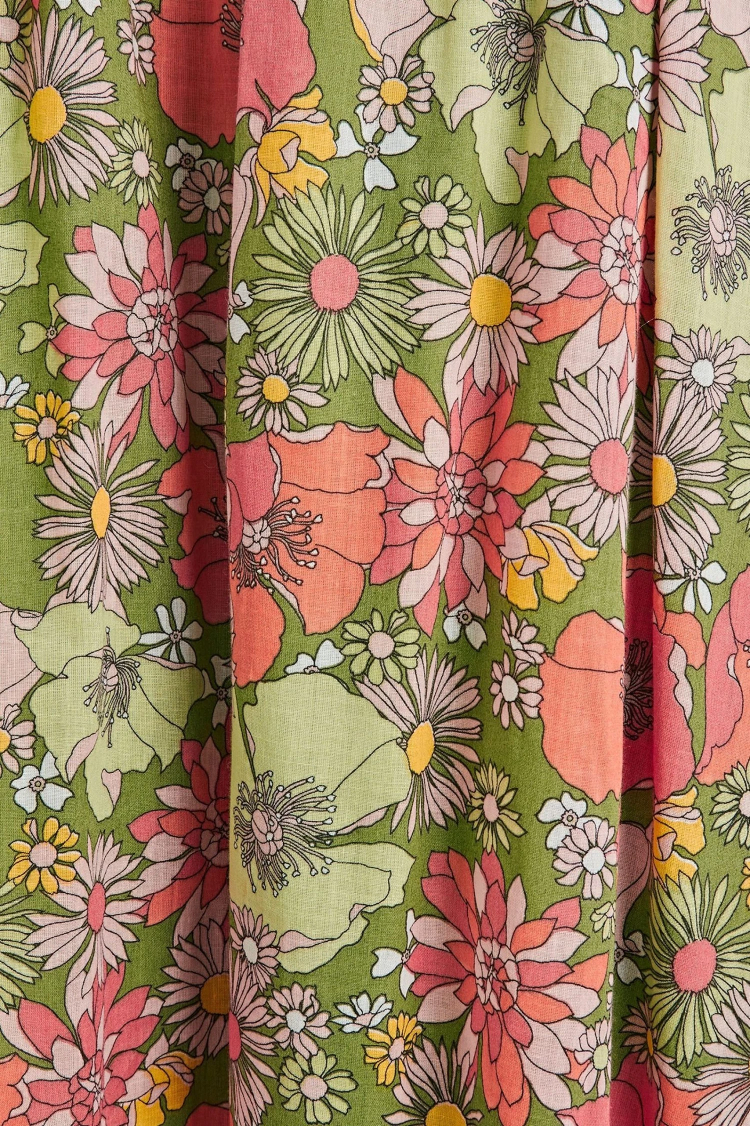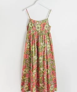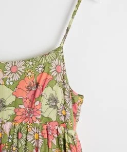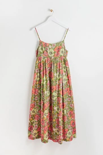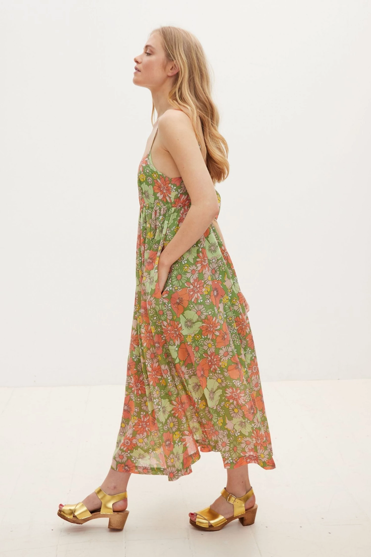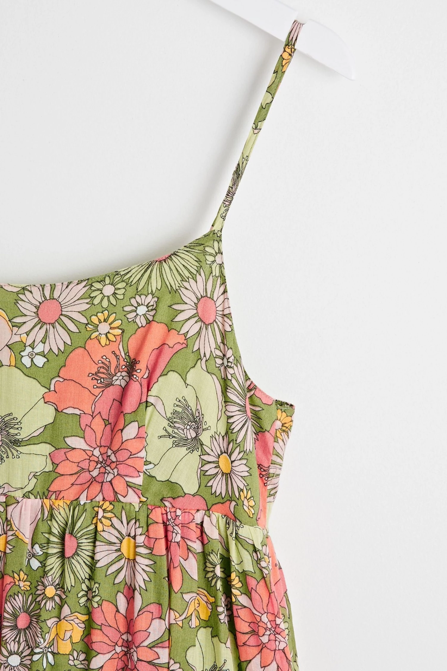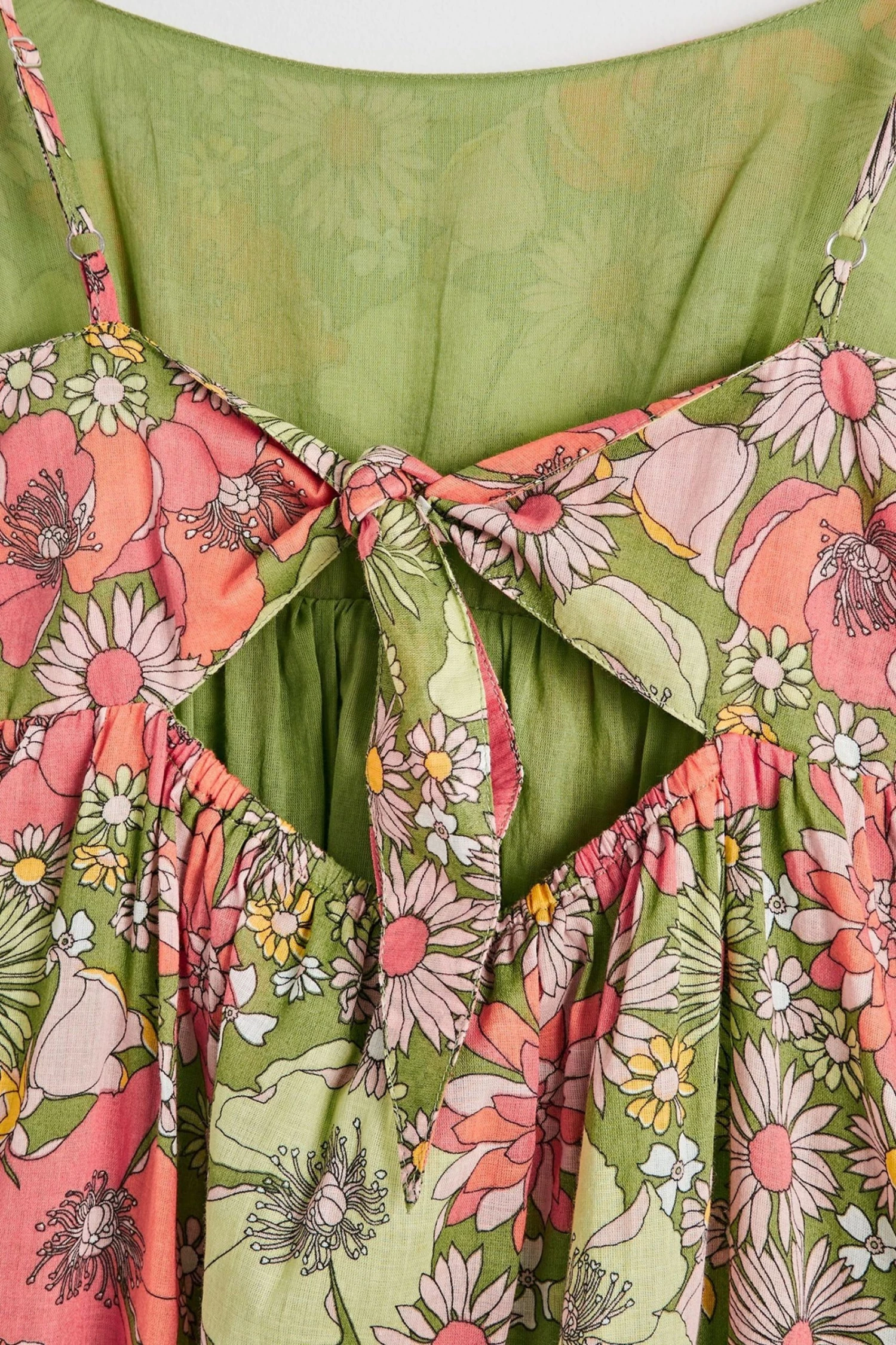 Featuring a busy green and pink floral print, this A-line midi dress has a tie up back design and thin profile straps. With a unique high waistline, this summer inspired dress can be paired with sandals to complete the look.