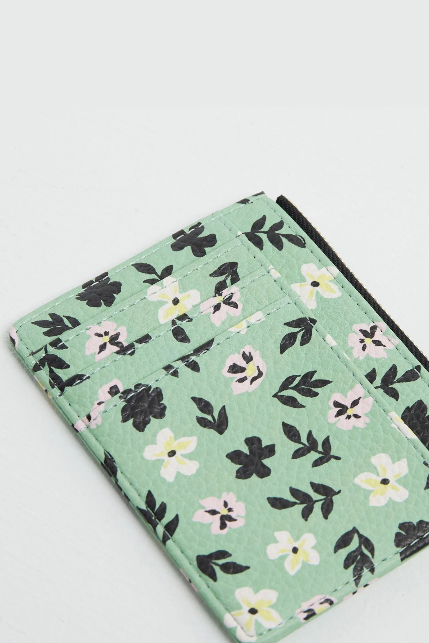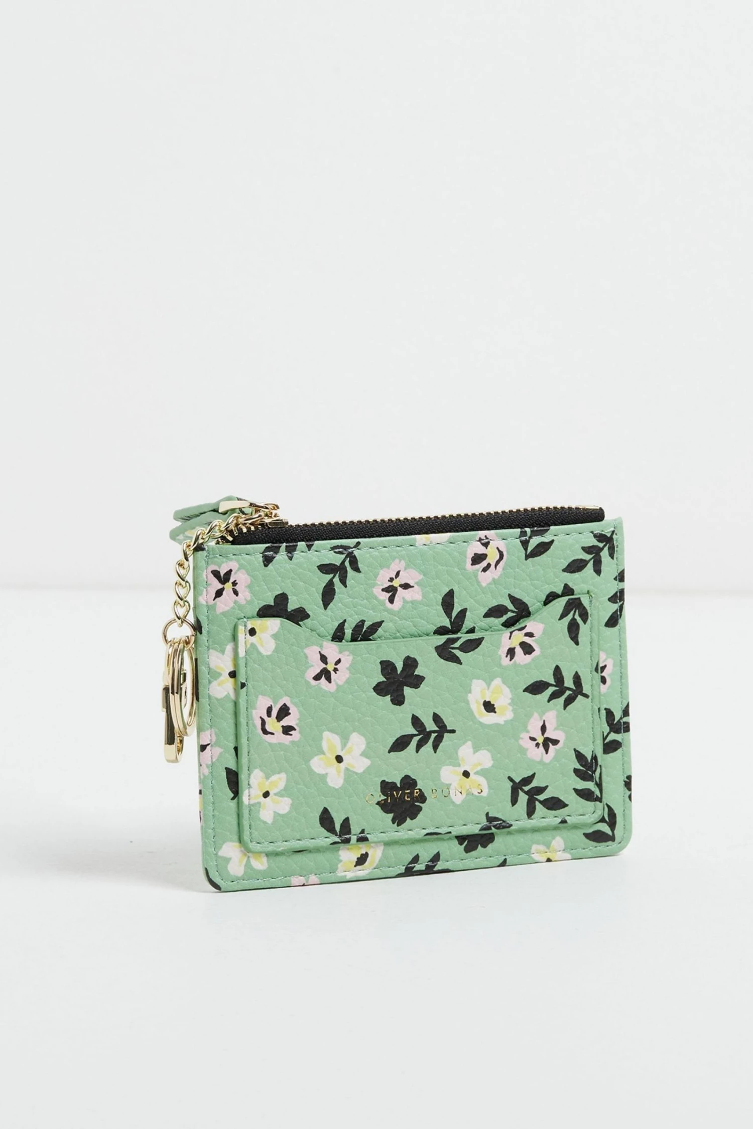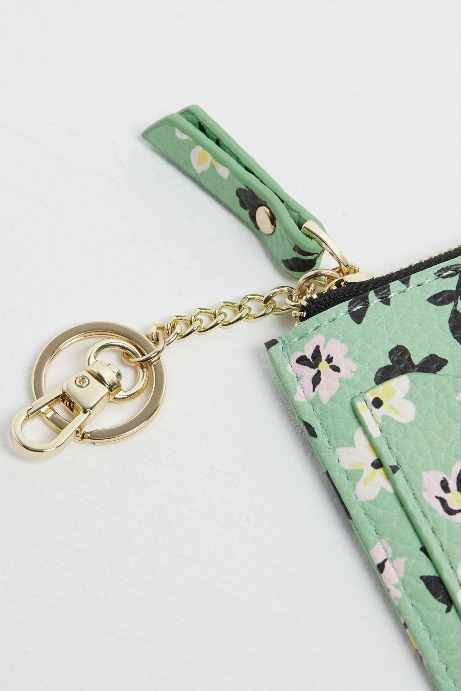 In an all-over green and black floral pattern, this pouch features a key ring and detachable clip, so you never lose your essential cards. With a small zipped compartment and multiple card slots, this pocket size pouch is finished with a gold toned metalware.