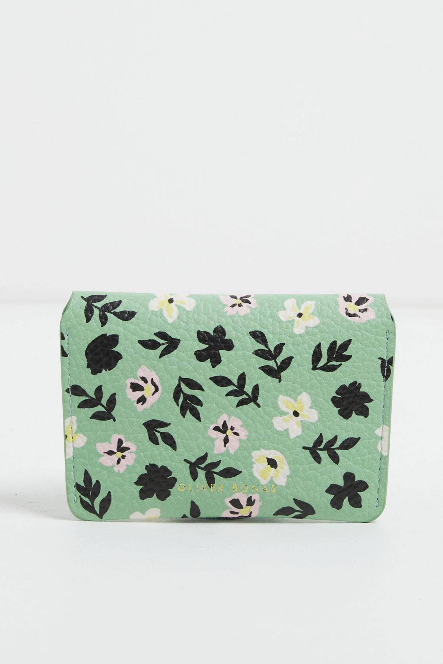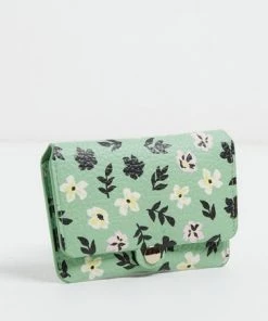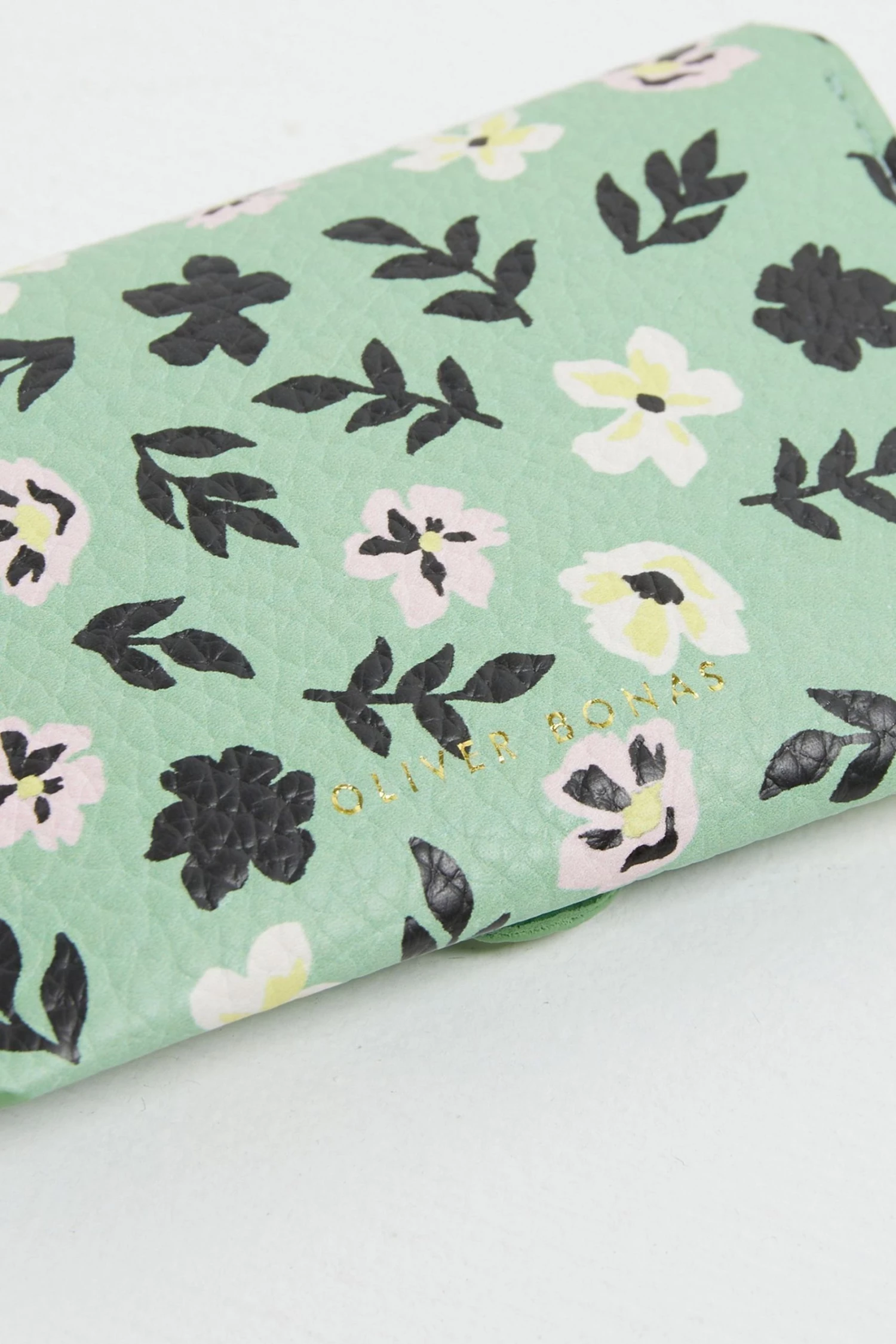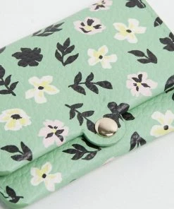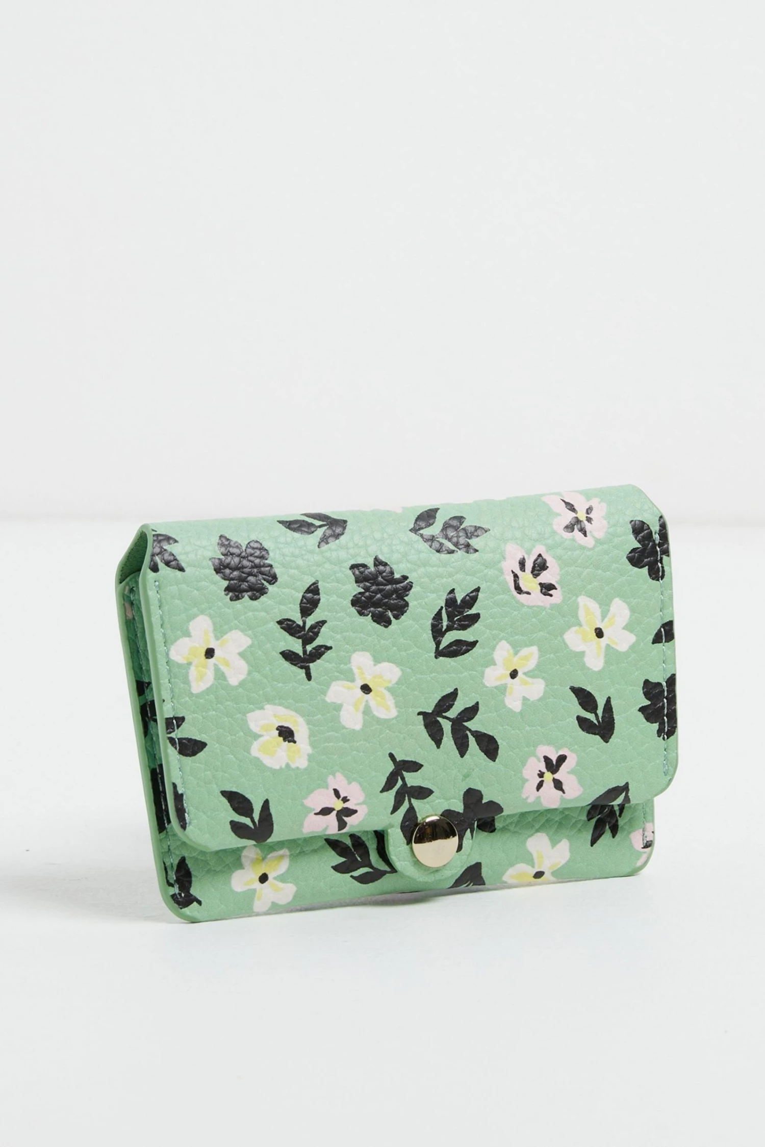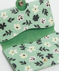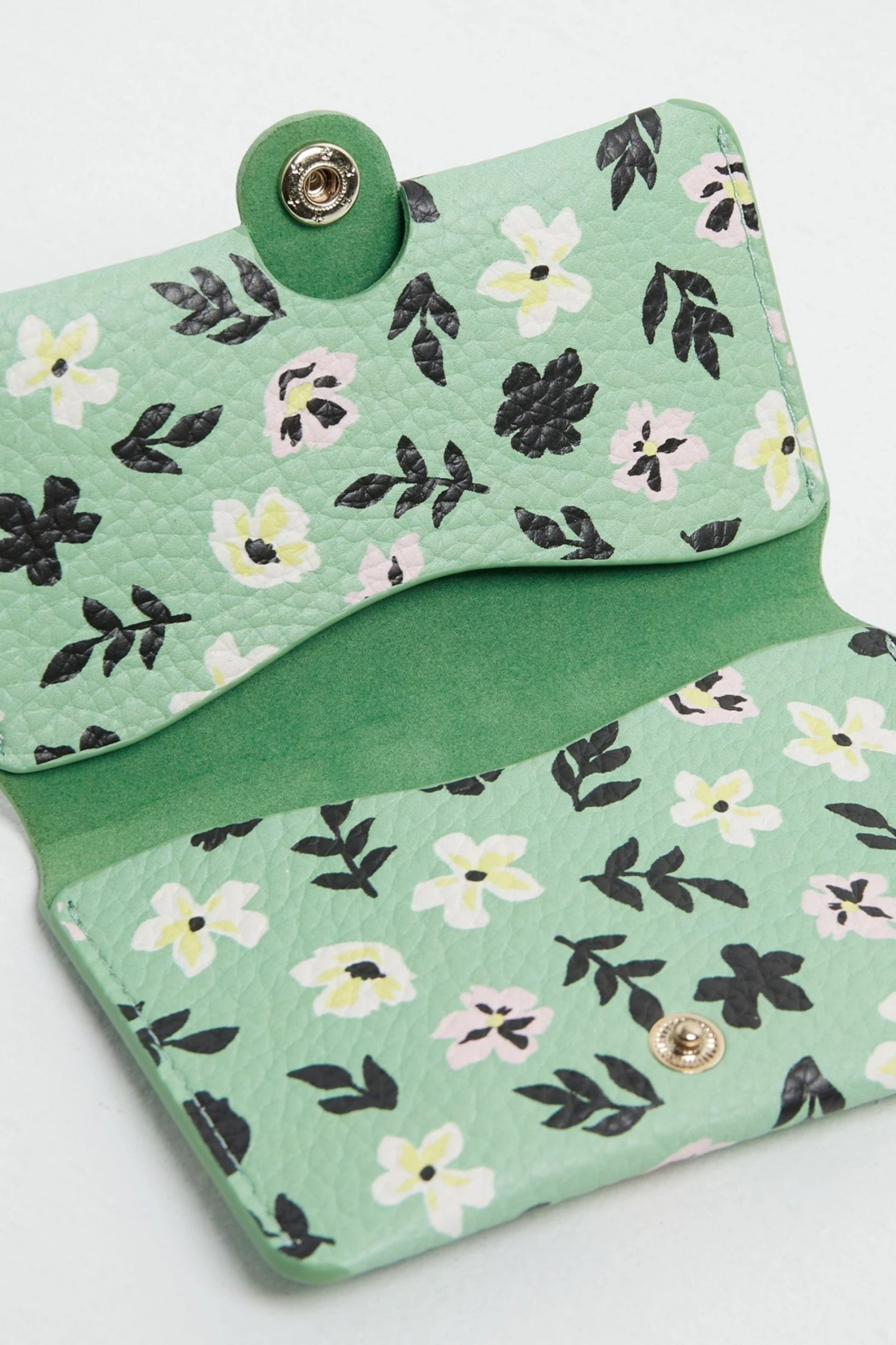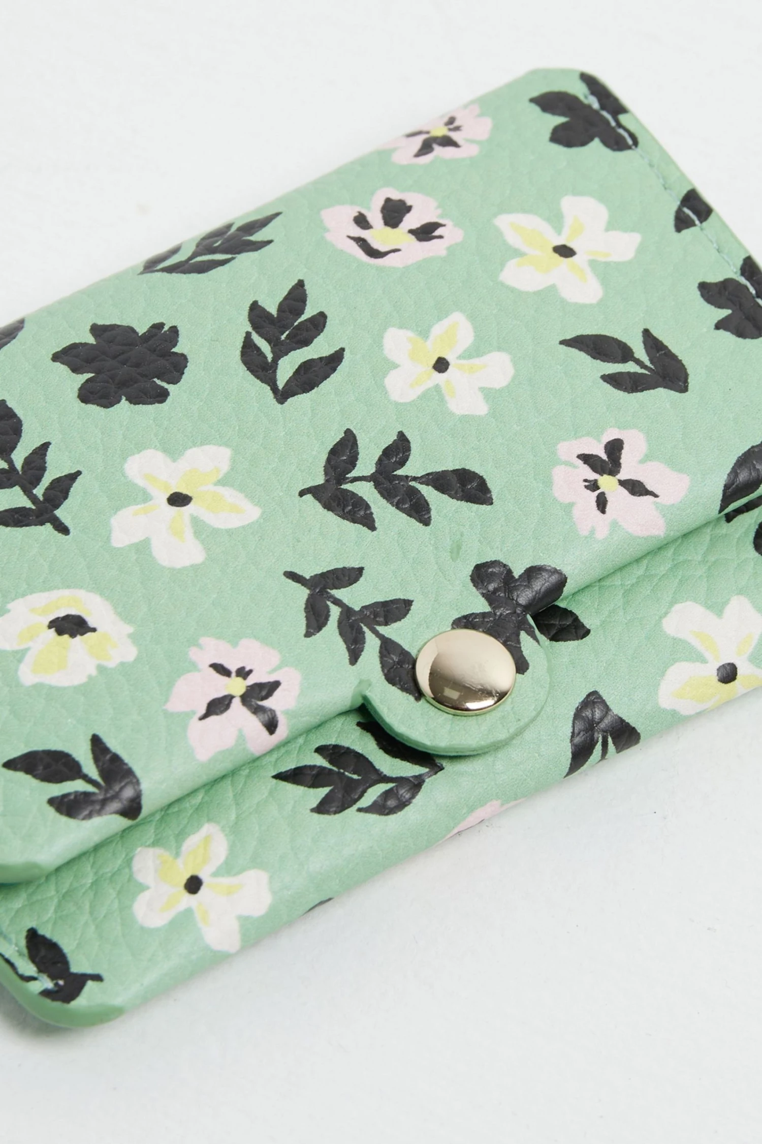 In a small, rectangular profile, this floral print green and black card holder is ideal for your most used cards. With a button closure and two slots for your essentials, slide into your pocket for when you are on the go.