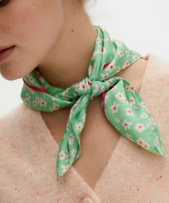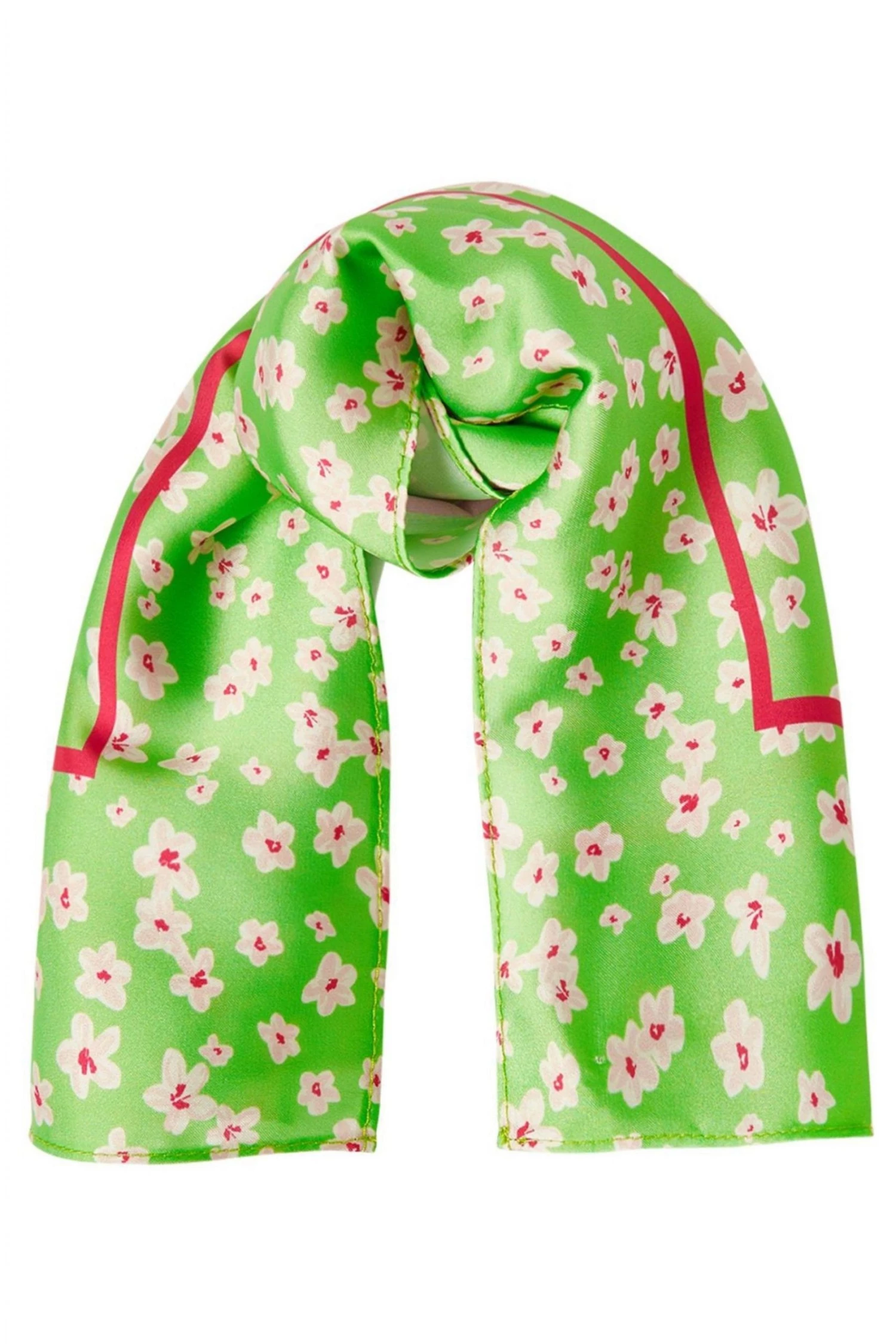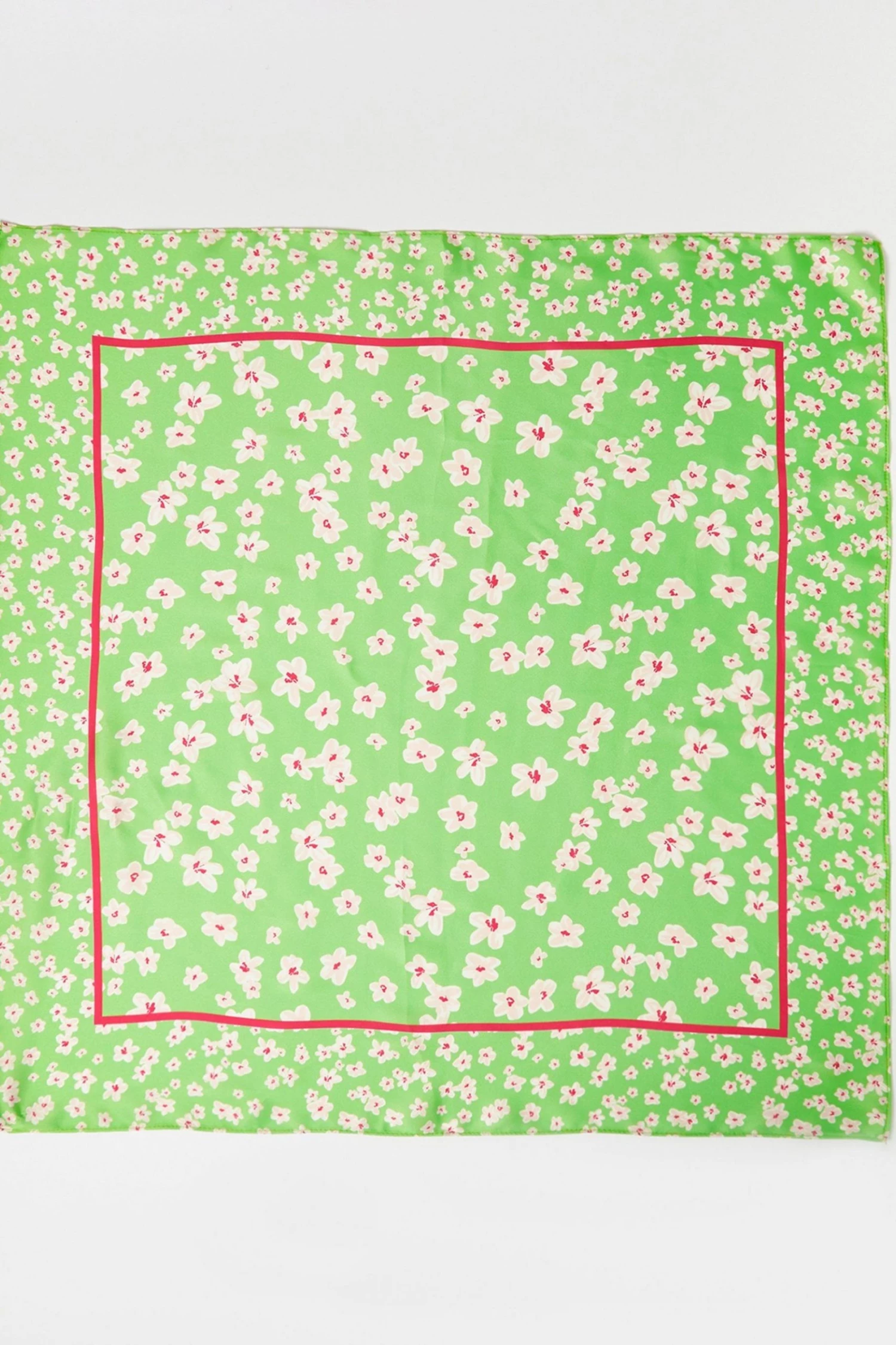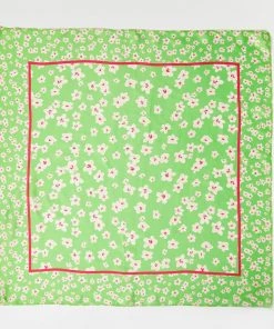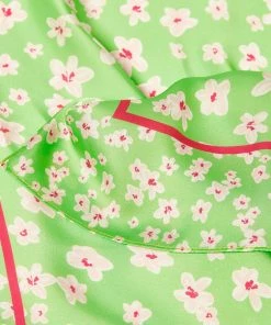 A bright green silk finish scarf is decorated with a ditsy white floral print and detailed with a contrasting pink square outline. Tie around your handbag to add a chic element or even use as a retro style scarf.