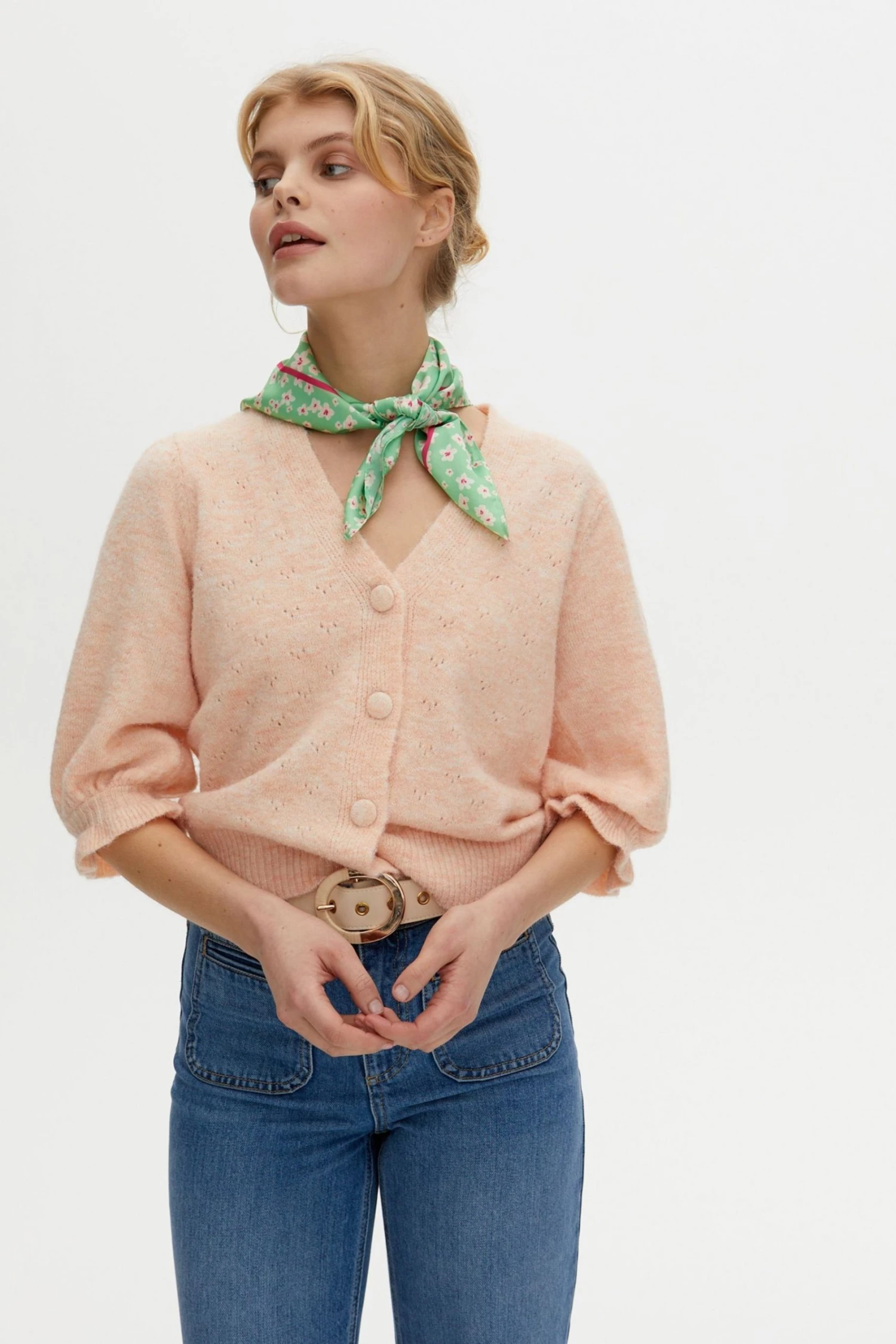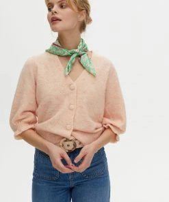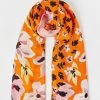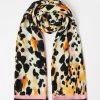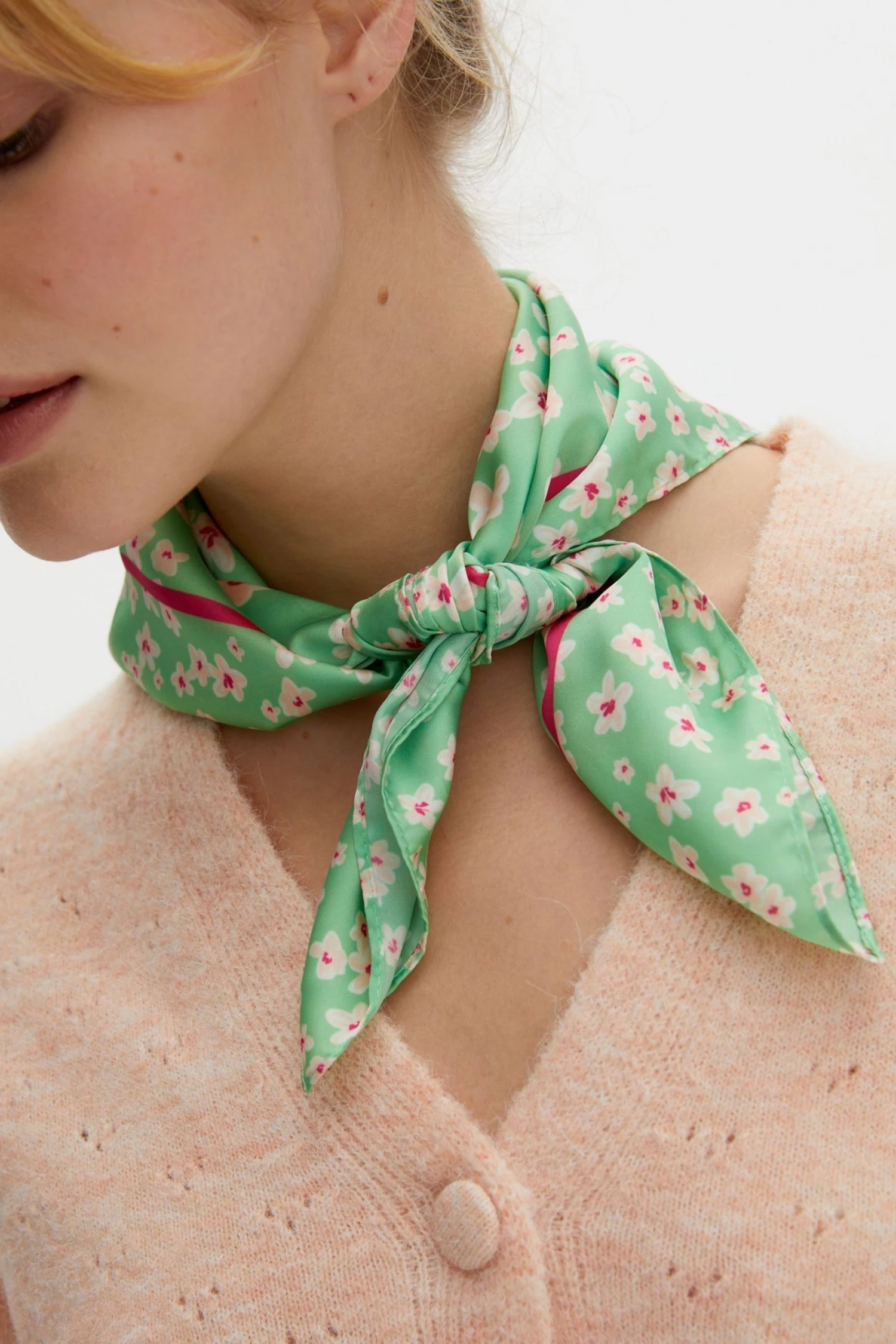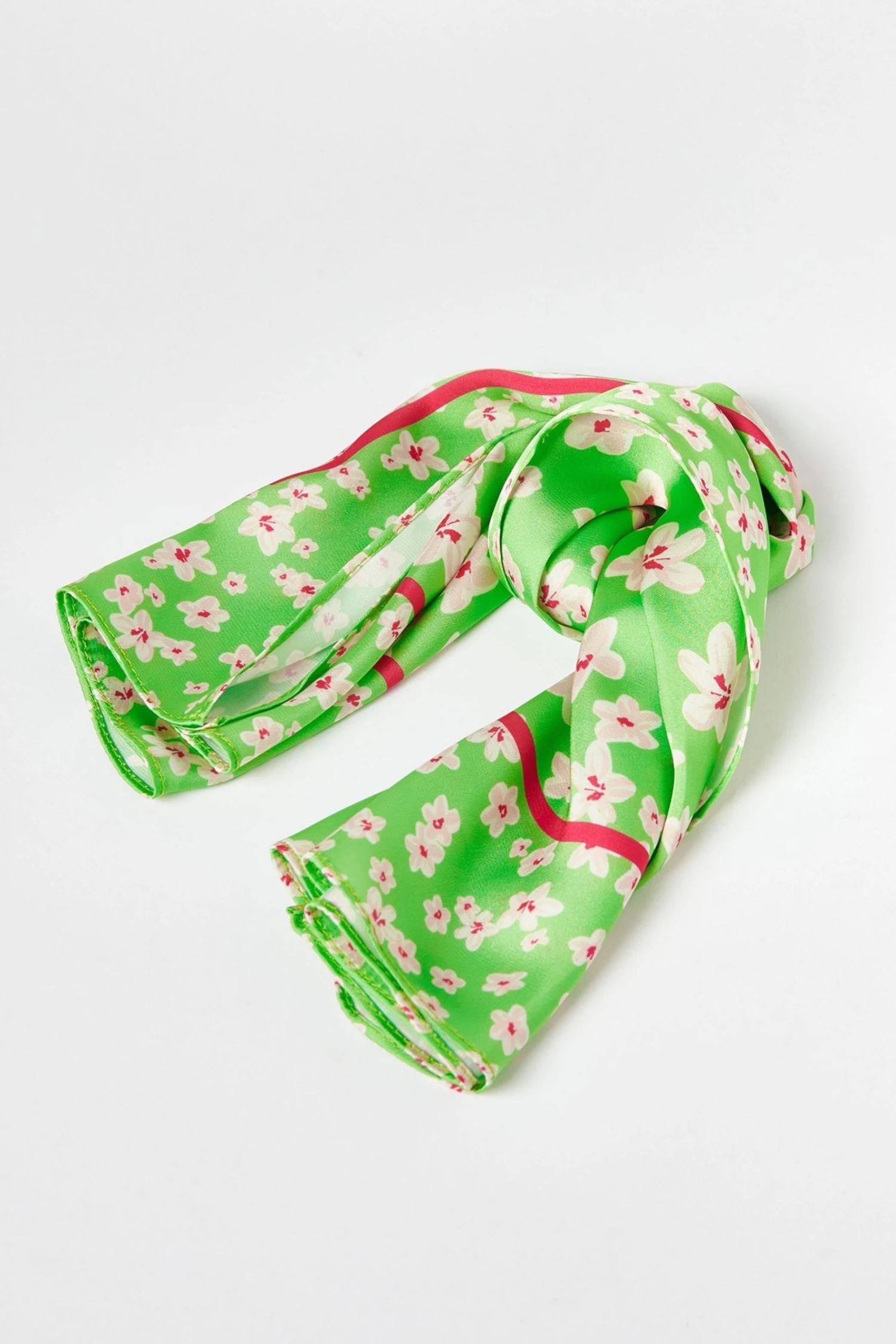 A bright green silk finish scarf is decorated with a ditsy white floral print and detailed with a contrasting pink square outline. Tie around your handbag to add a chic element or even use as a retro style scarf.