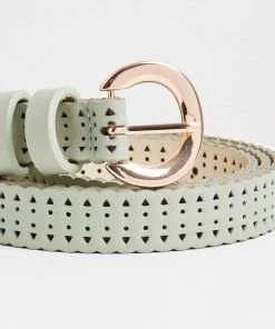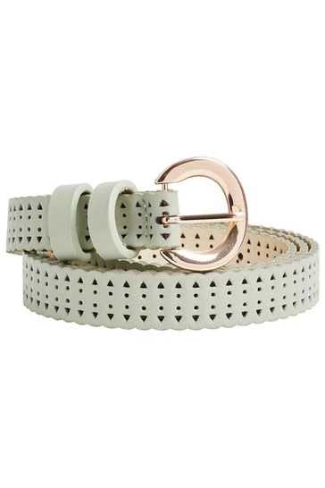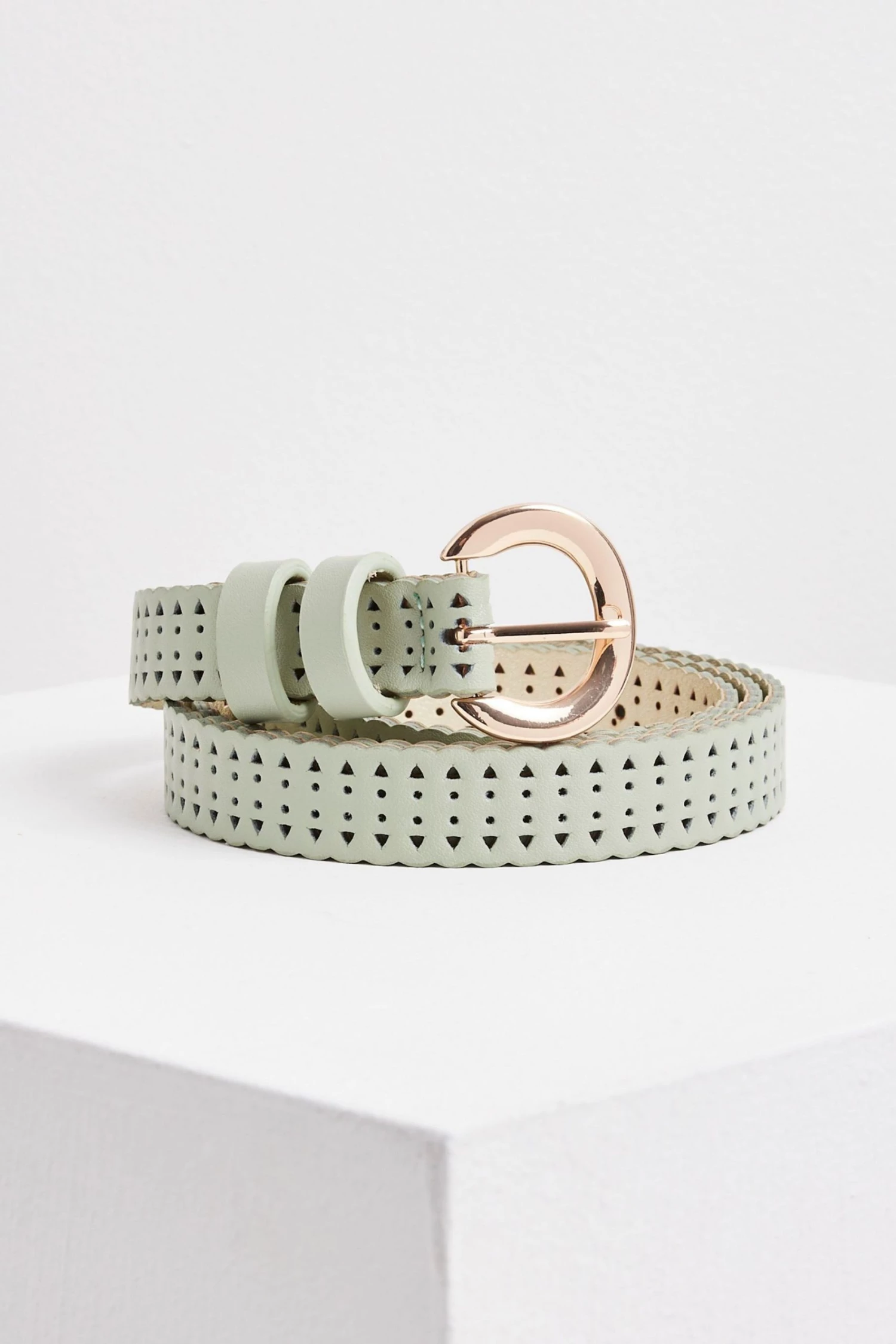 In a slim profile, this scallop edge belt in a sage green tone has cut out detailing and is complete with a gold toned round buckle fastening.
