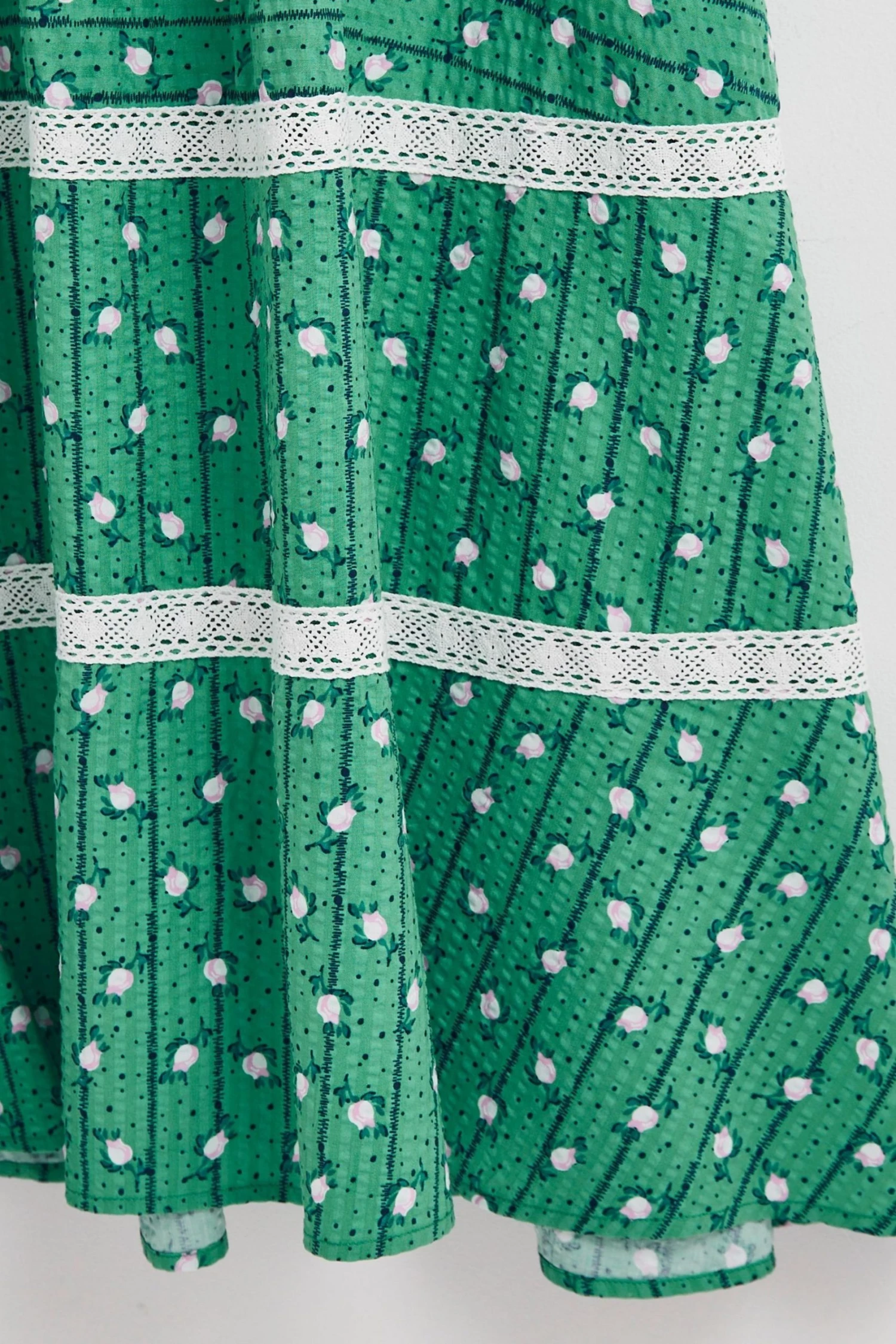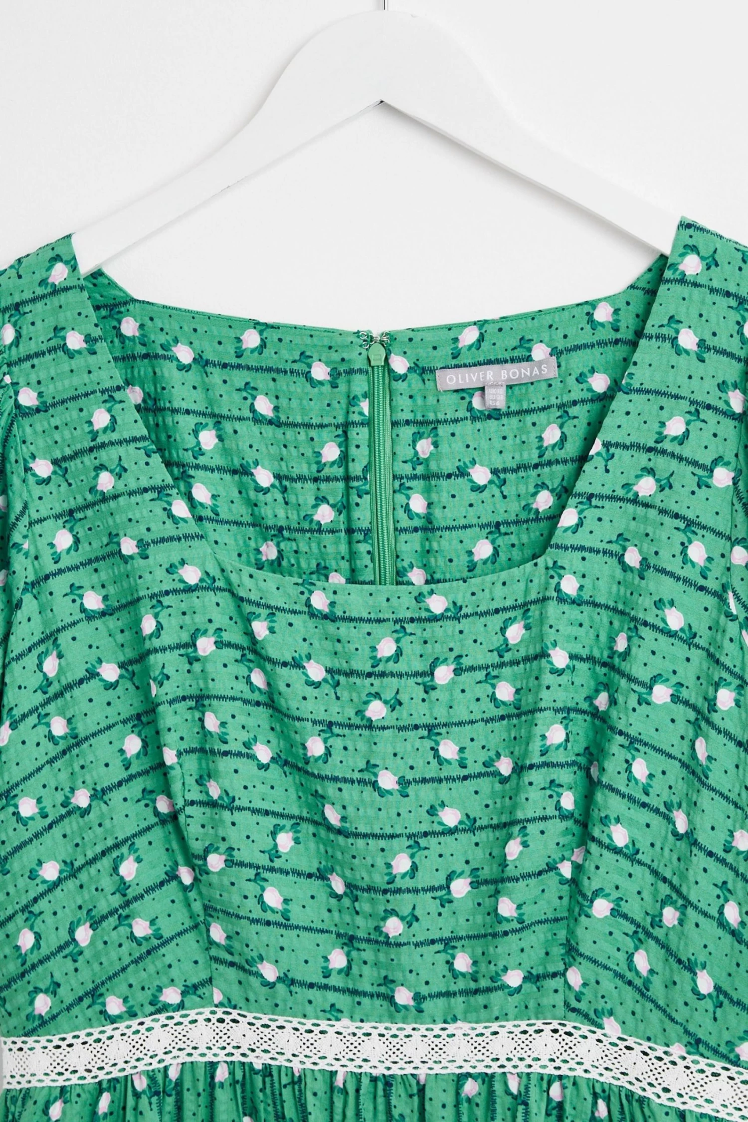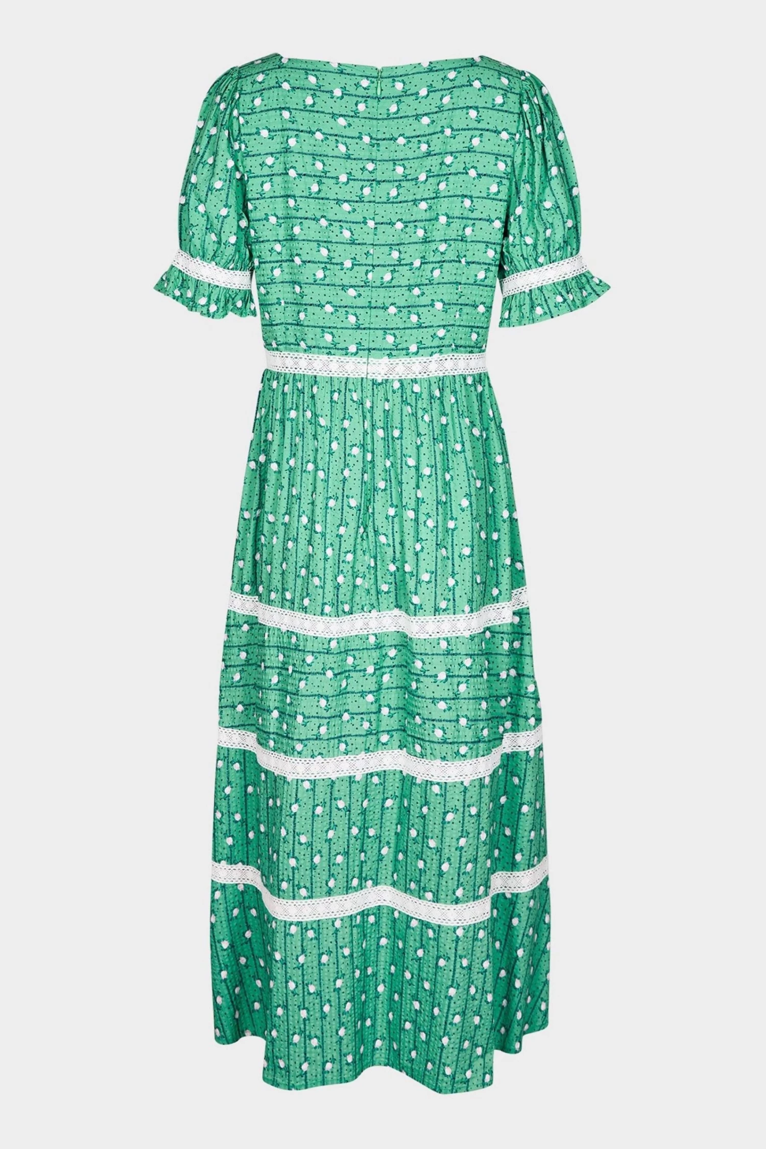 Boasting a floral and stripe pattern on a green fabric, this midi dress is complemented by white lace panelling, pleated cuffs and a square neckline, finished with an invisible zip fastening.