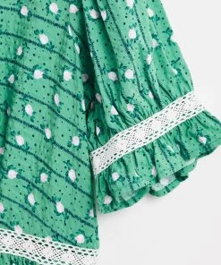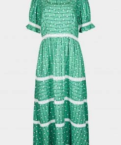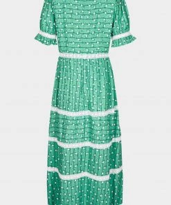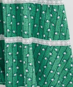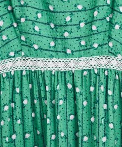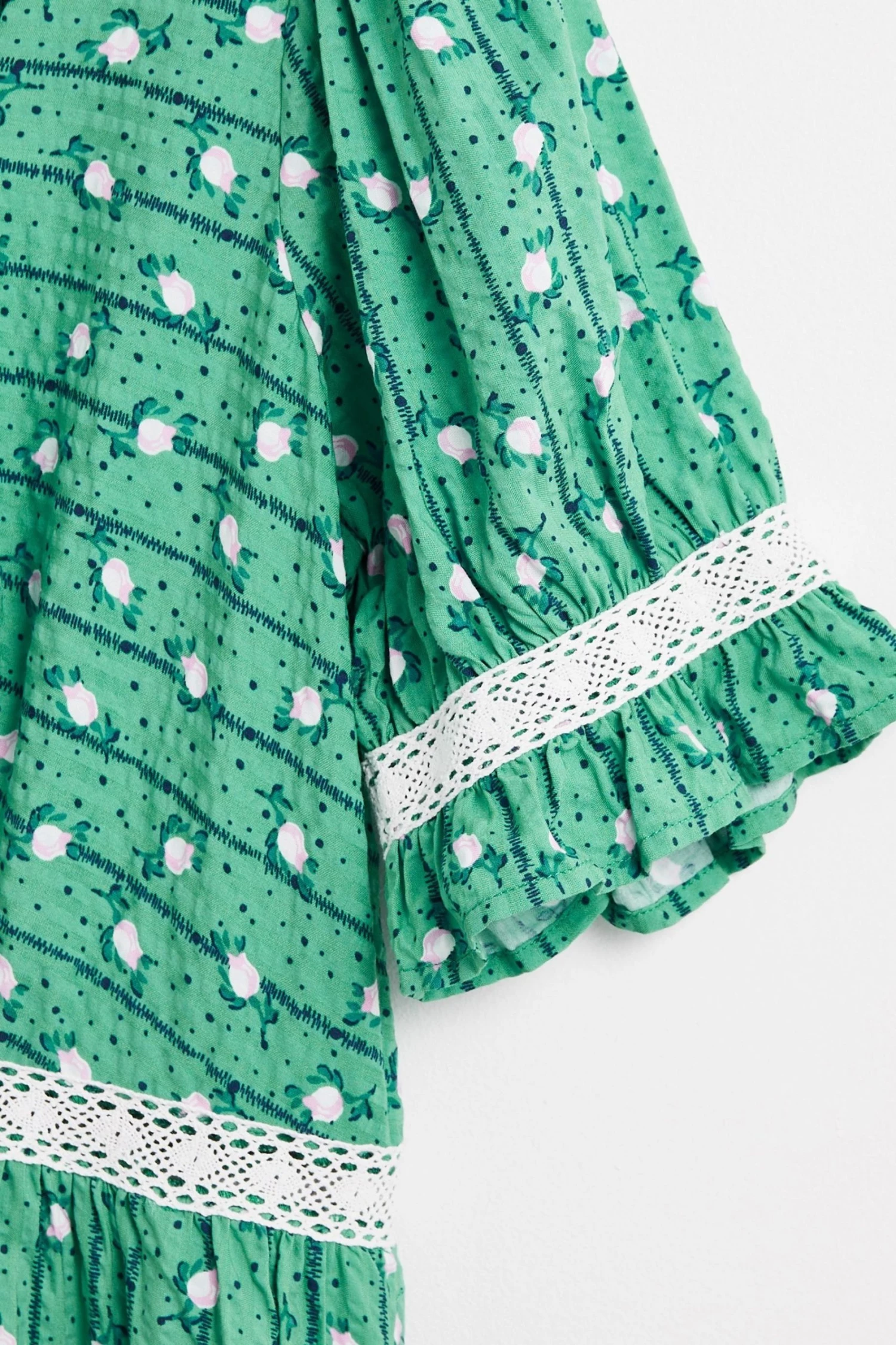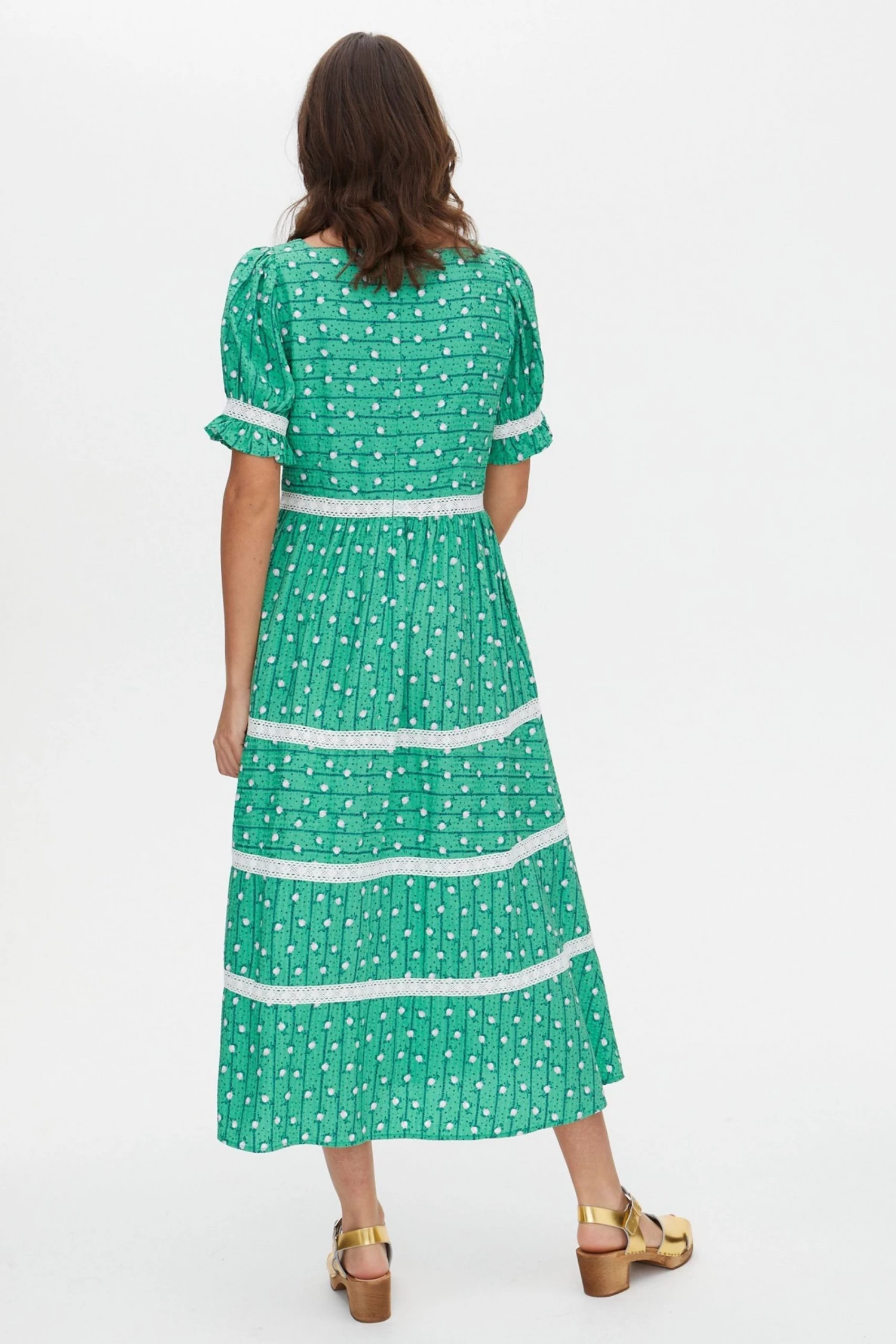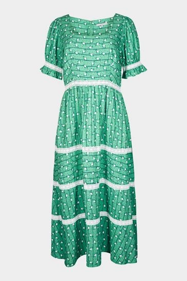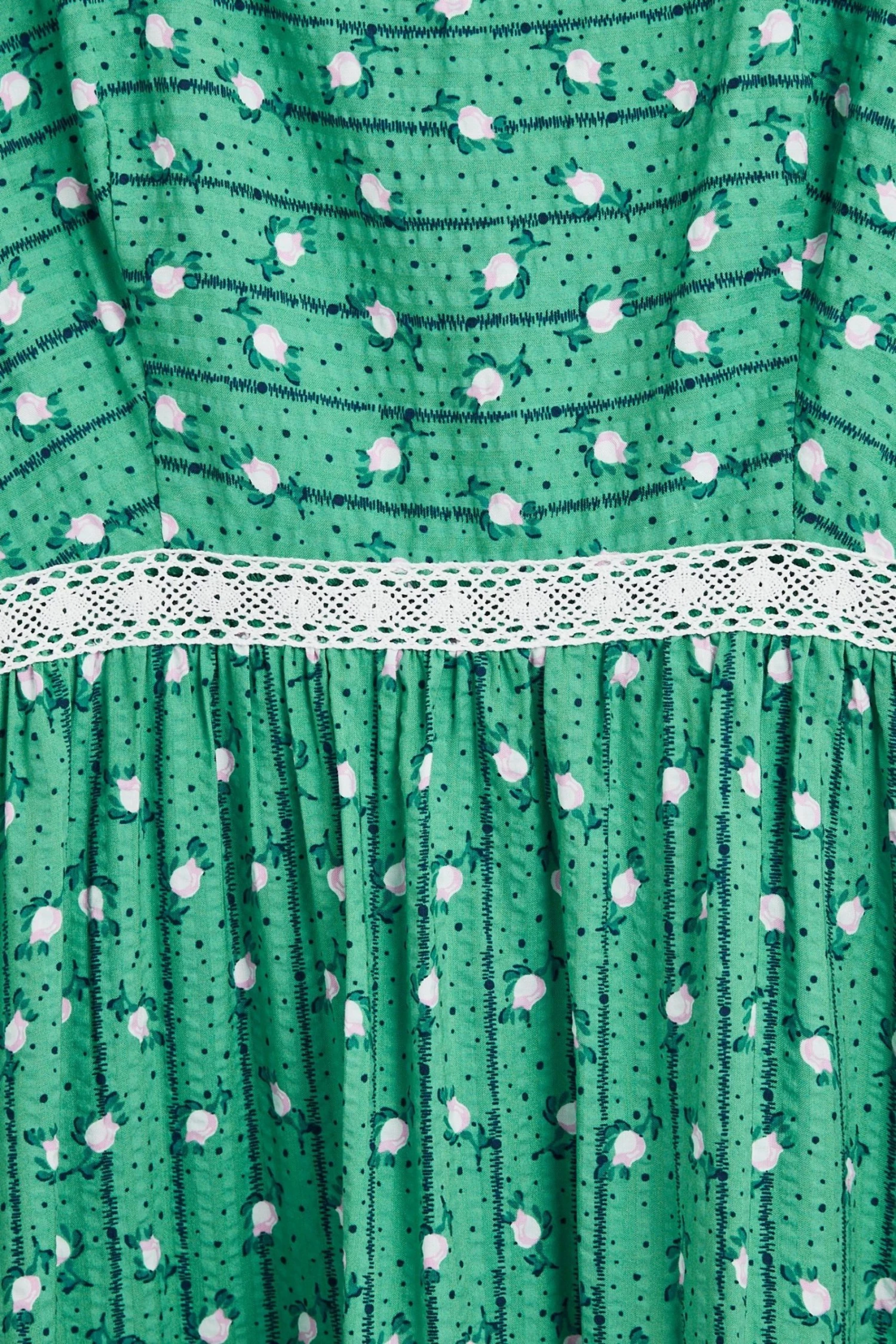 Boasting a floral and stripe pattern on a green fabric, this midi dress is complemented by white lace panelling, pleated cuffs and a square neckline, finished with an invisible zip fastening.