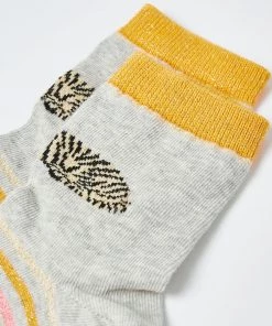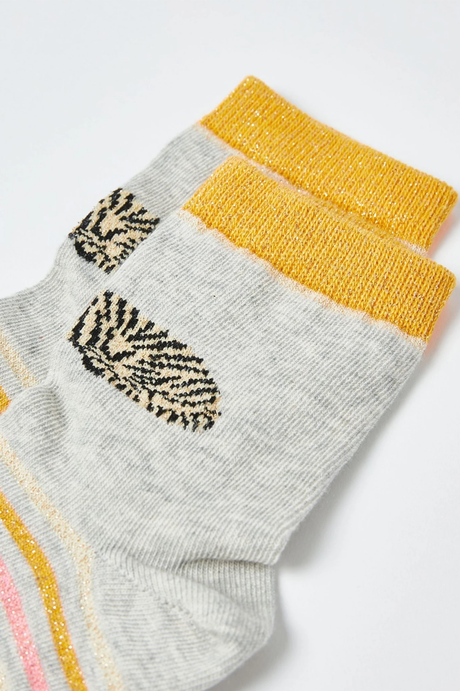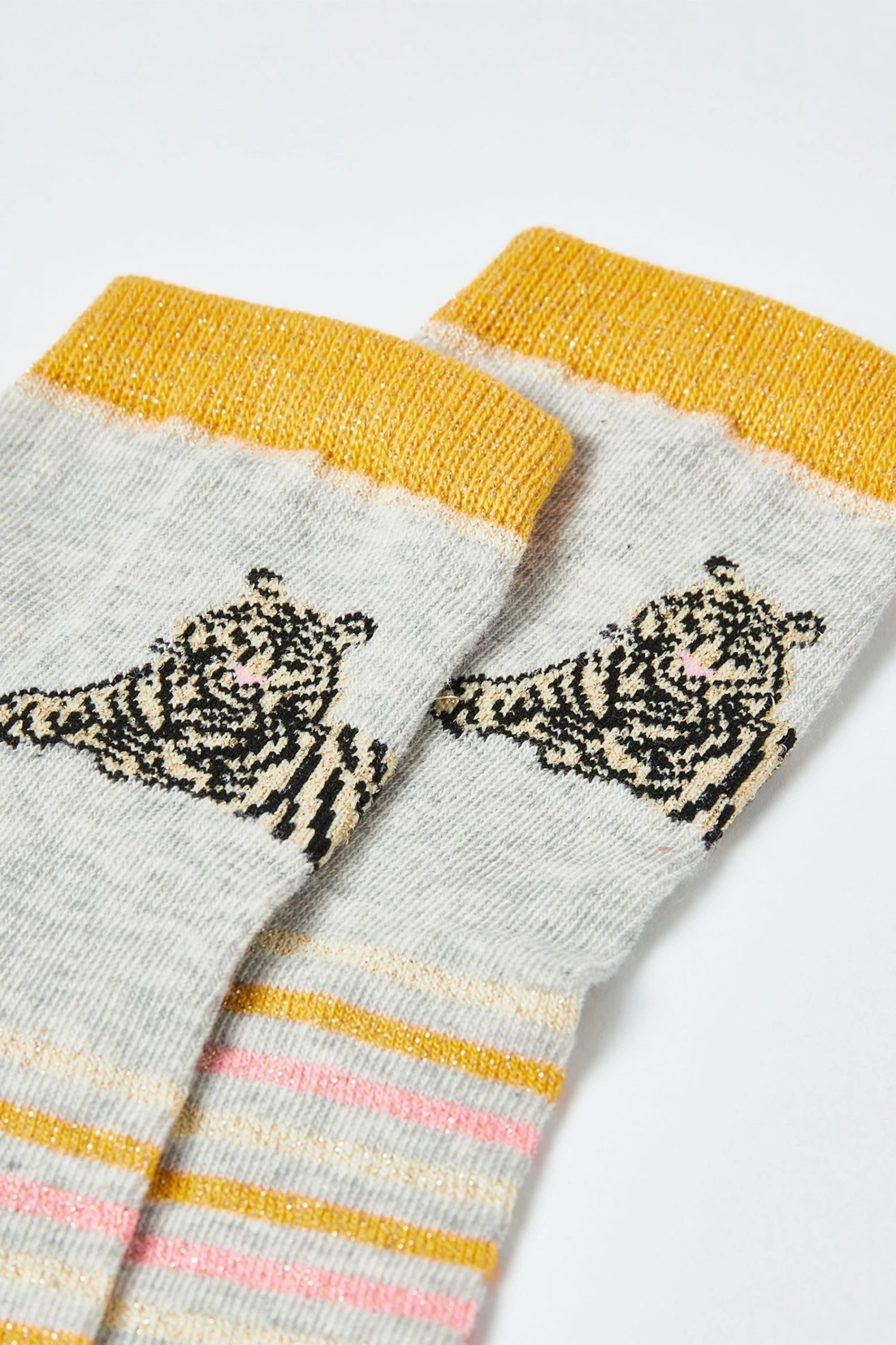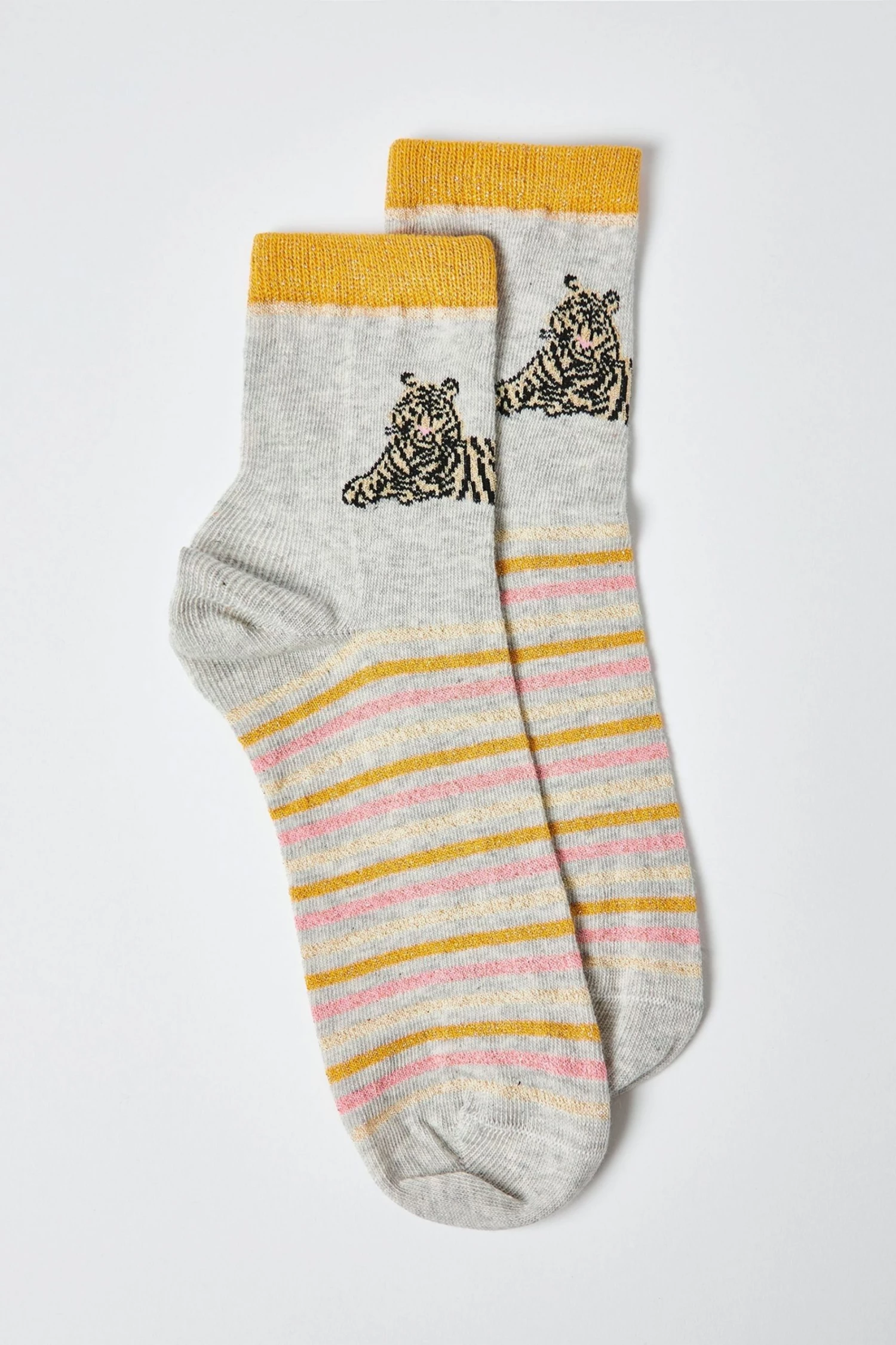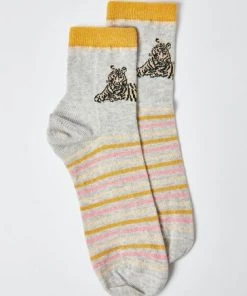 A single tiger sits on the front of each of these grey ankle socks. With an orange stripe design, these socks are truly roar-some.