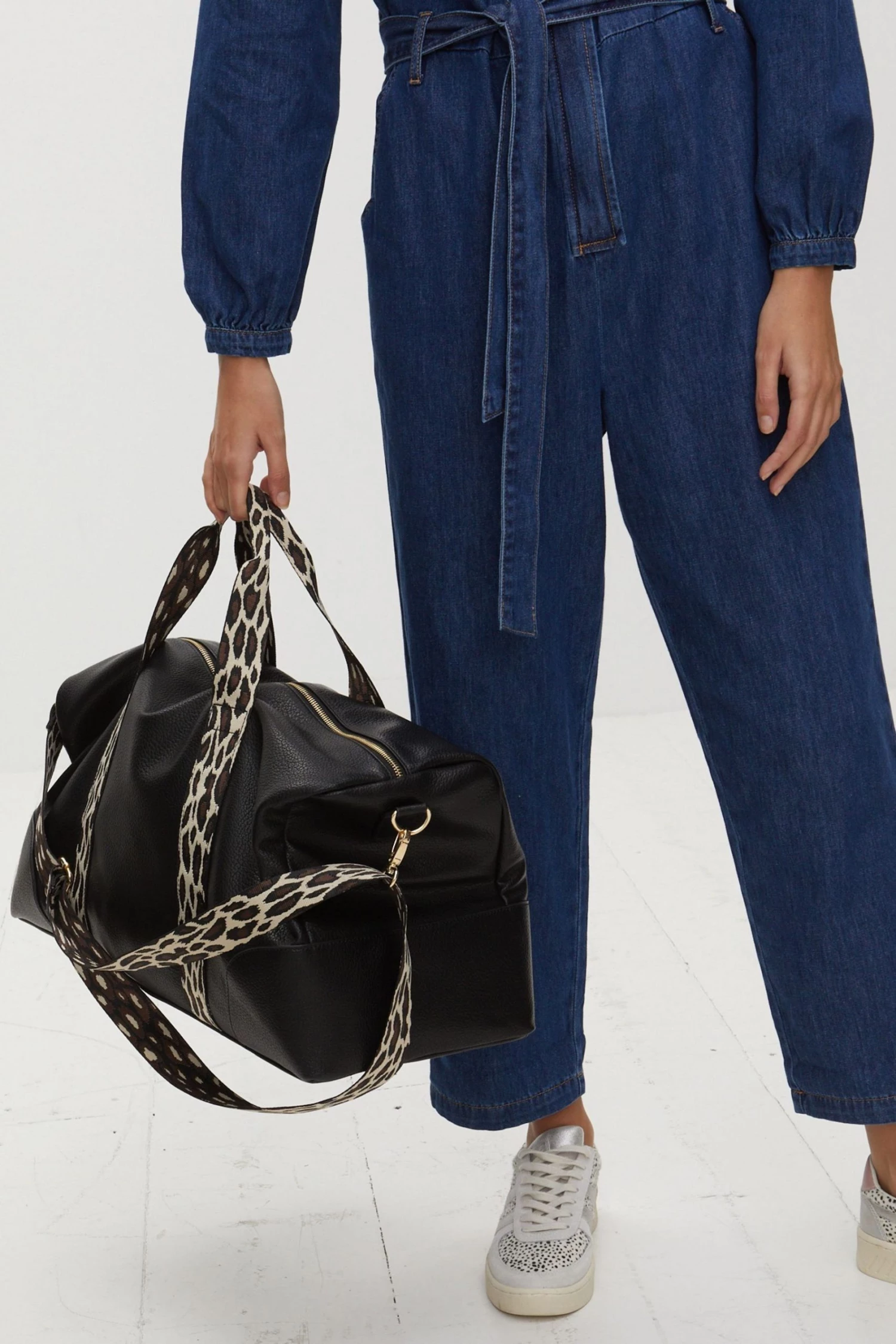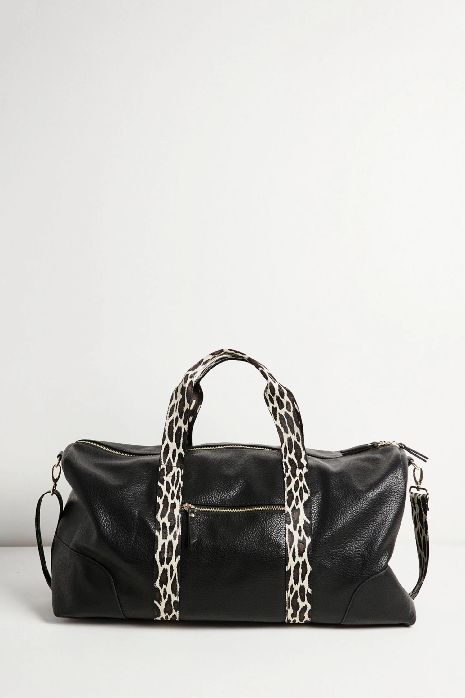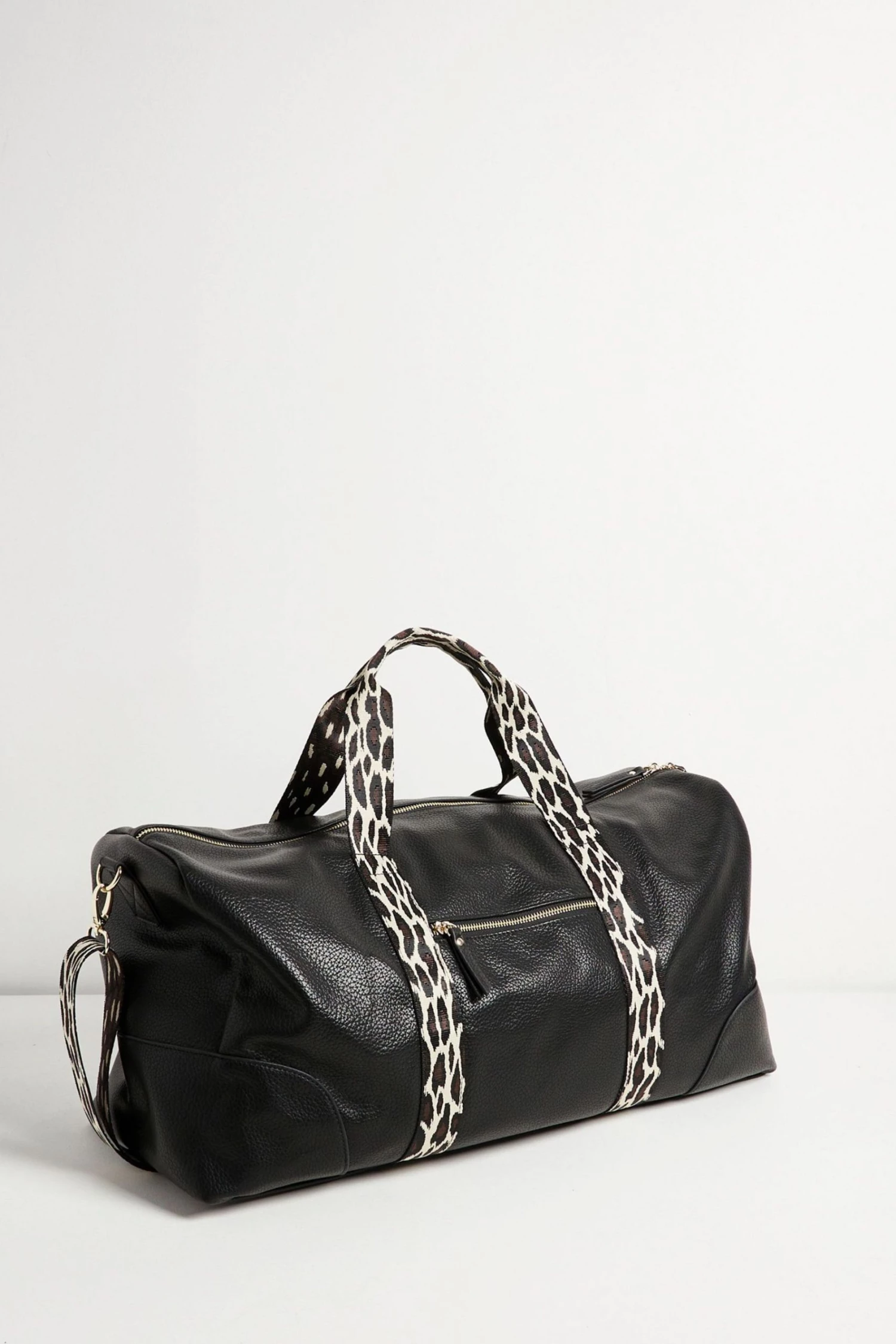 Pack everything you need for a weekend getaway in this large weekend bag. Made with PU, this black bag has a grab handle plus a removable cross-body strap in animal pattern. The weekend bag is complete with gold metalware and includes inner and outer zipped pockets to keep your smaller items secure.