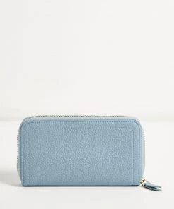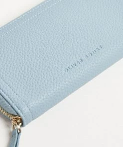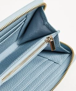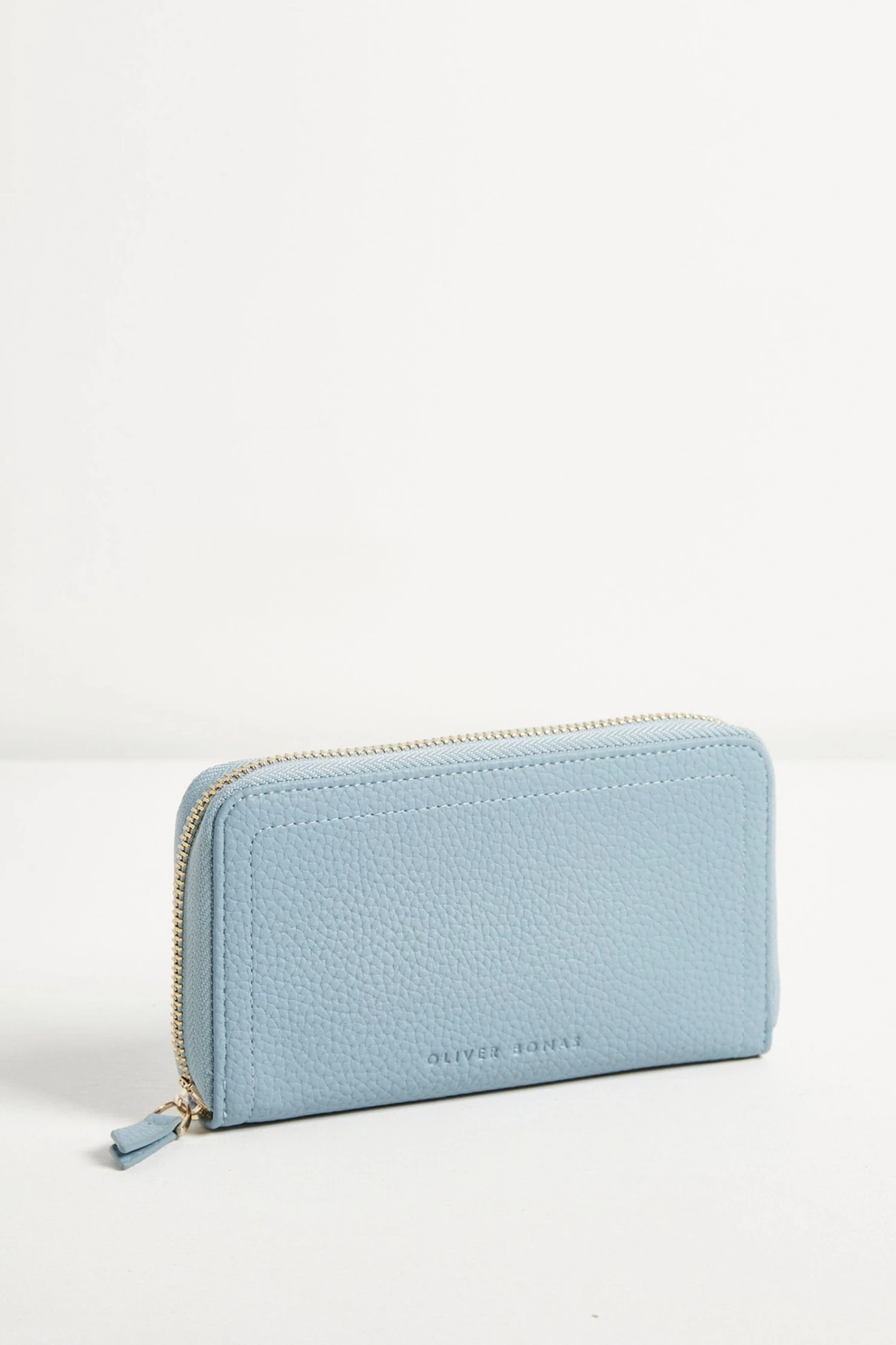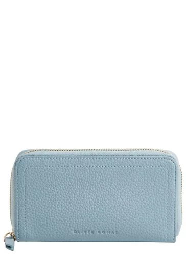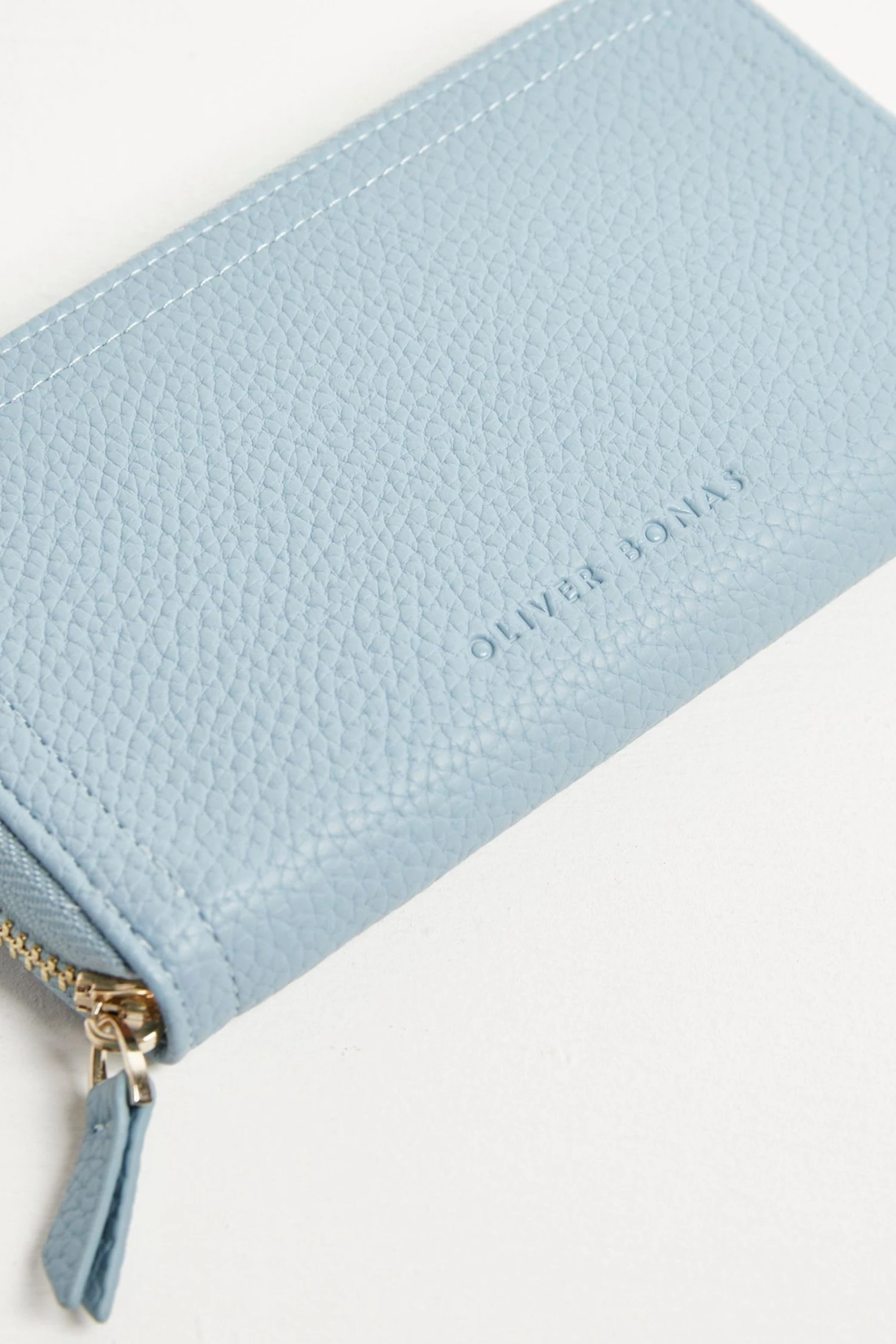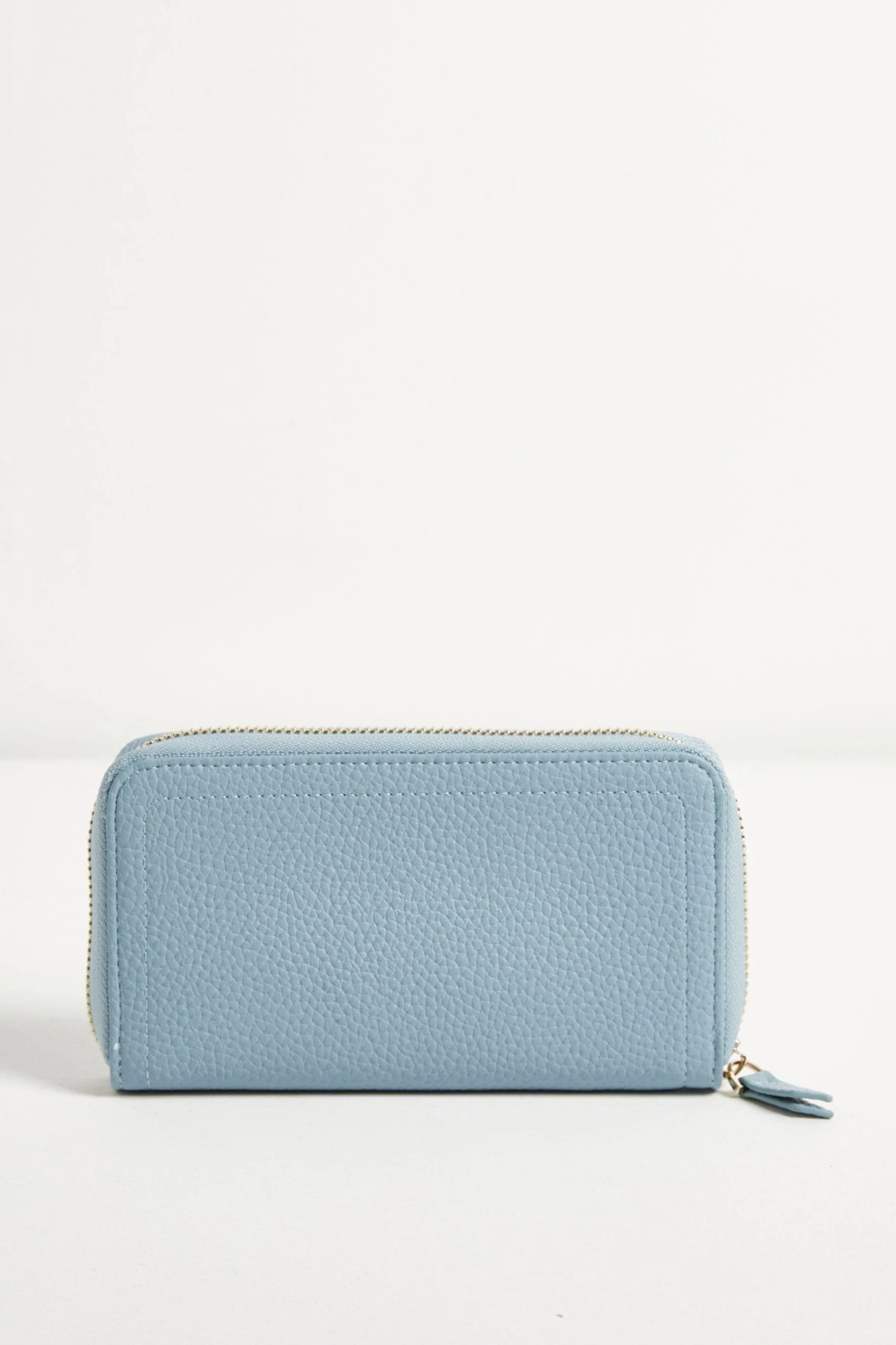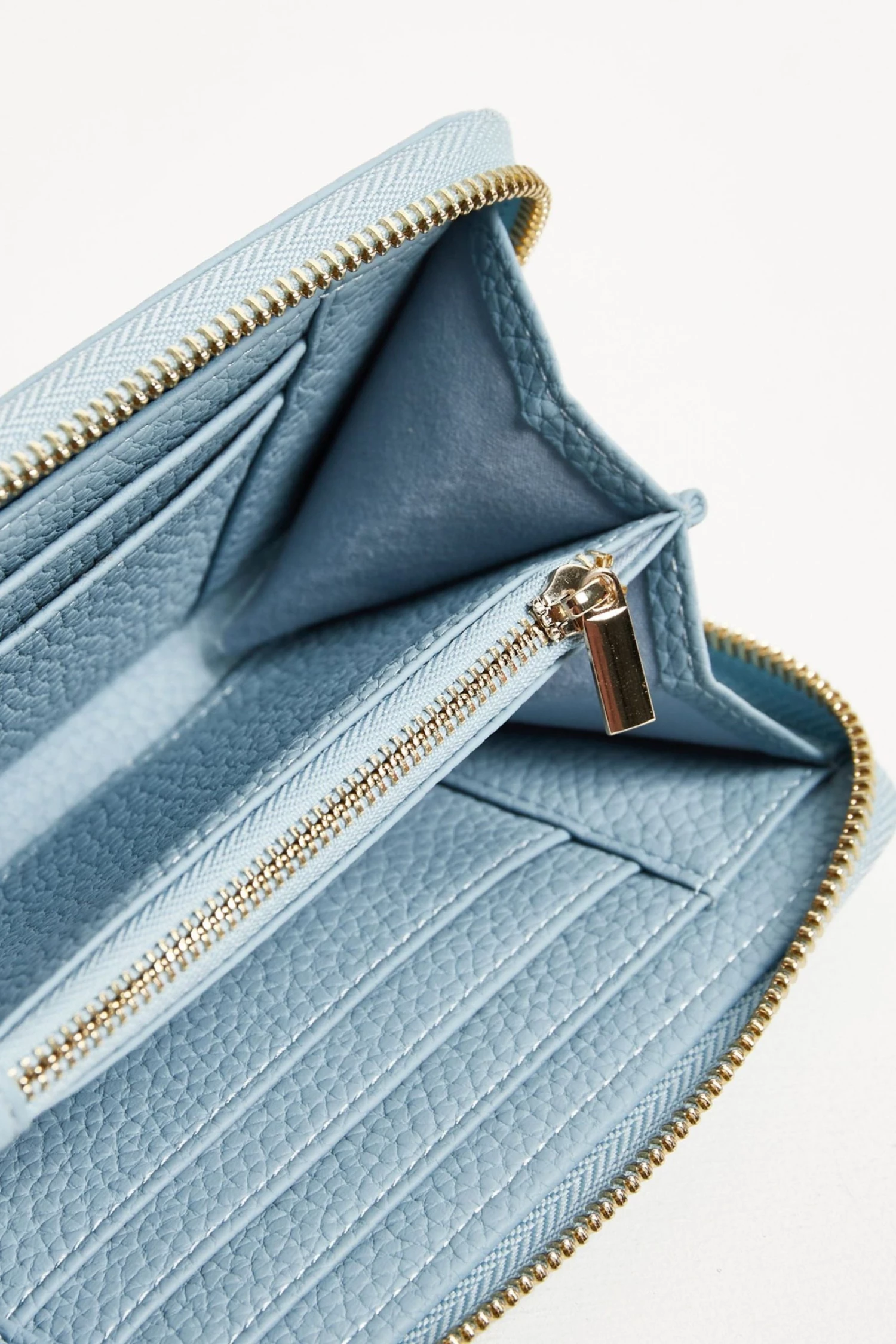 In a rectangular profile with zip around access, this blue purse features a zipped coin compartment, slip pockets and card slots for your essentials, completed with gold-toned metal ware.