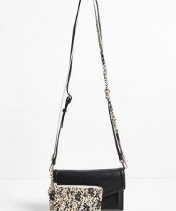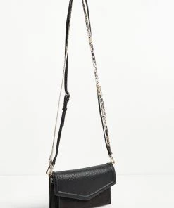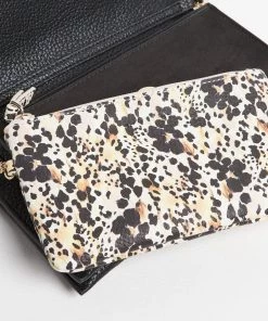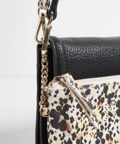 In a slim envelope profile with a fold-over panel, this black cross-body bag combines smooth faux leather with soft suedette detailing, whilst the two detachable straps, one black and one animal print, lets you can mix it up to suit your outfit. With one main compartment and one front pocket, this sleek bag also comes with a detachable inner pouch in an all-over animal print and gold-toned chain detailing.