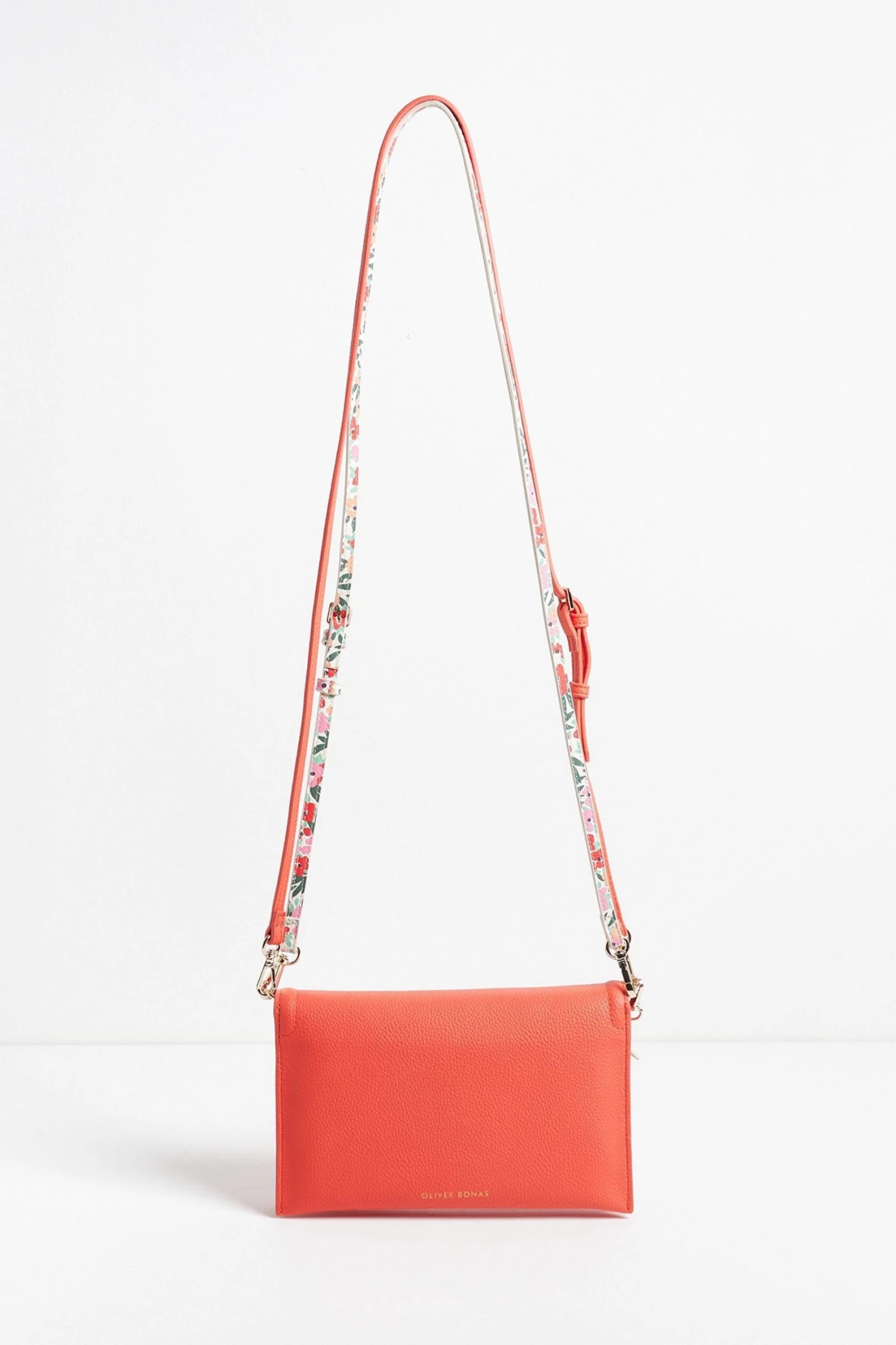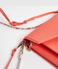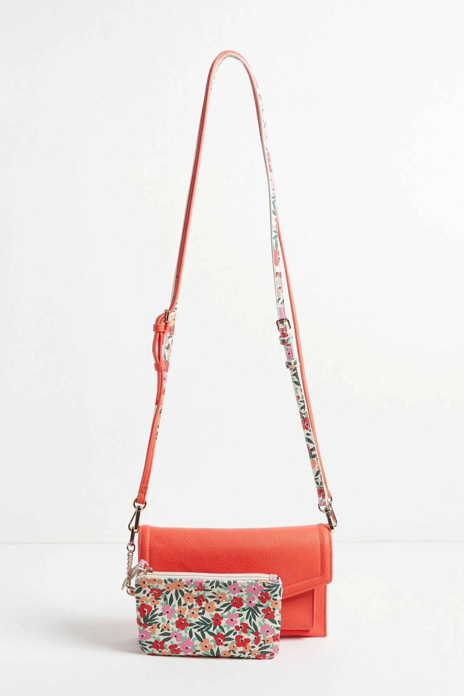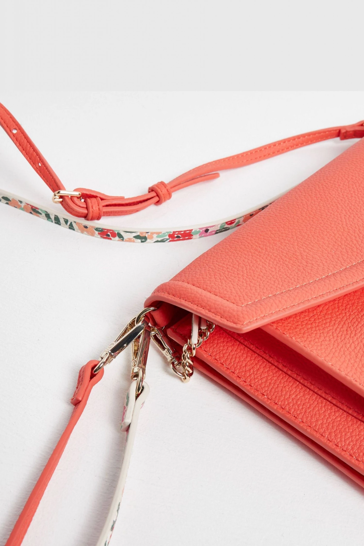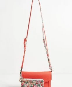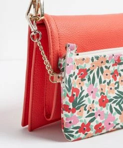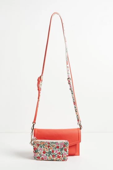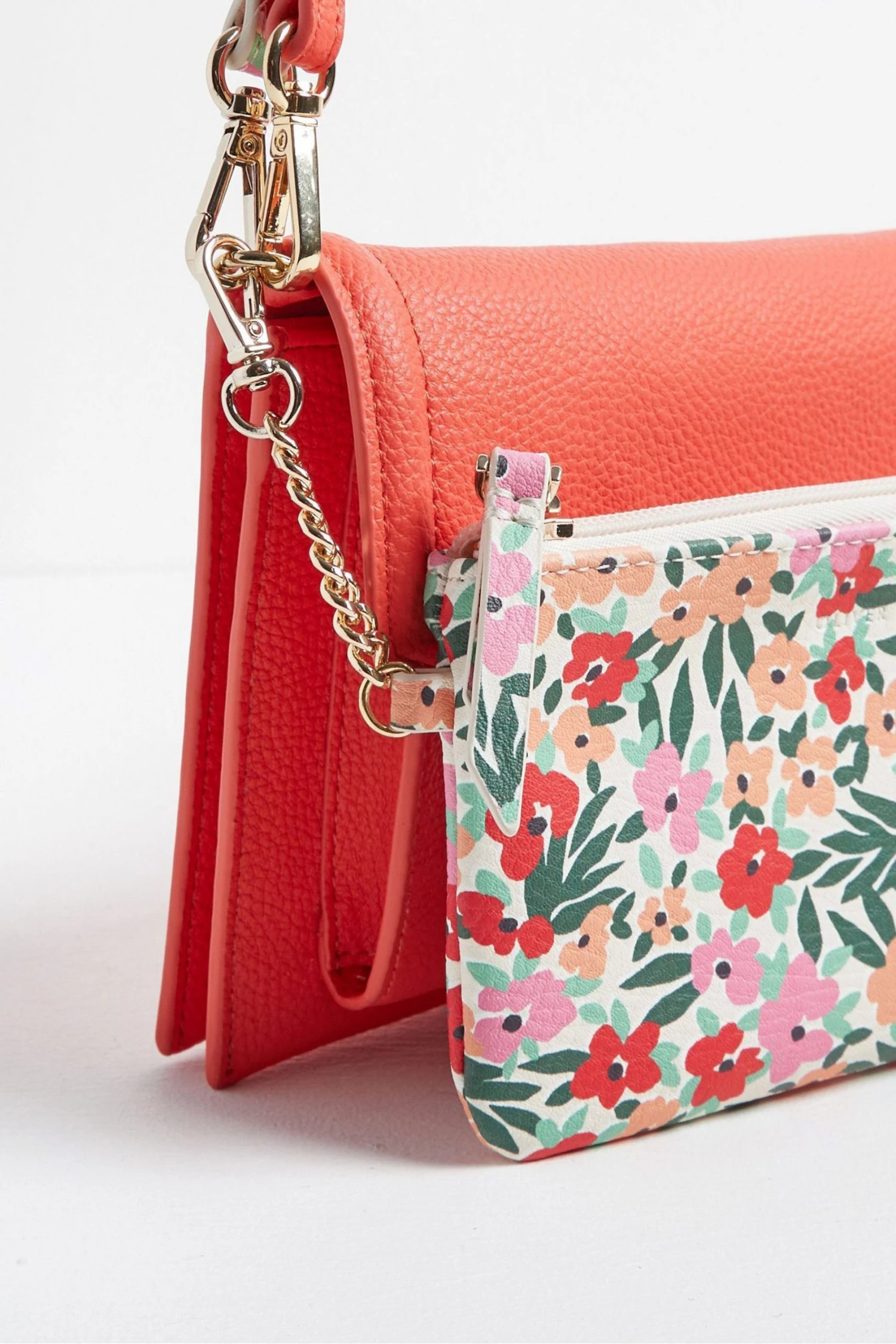 In a slim envelope profile with a fold-over panel, this red cross-body bag is in a smooth finish with two detachable straps, one matching and one floral print, allowing you to mix it up to suit your outfit. With one main compartment and one front pocket, this sleek bag also comes with a detachable inner pouch in an all-over floral print and gold-toned chain detailing.