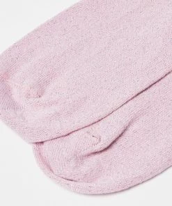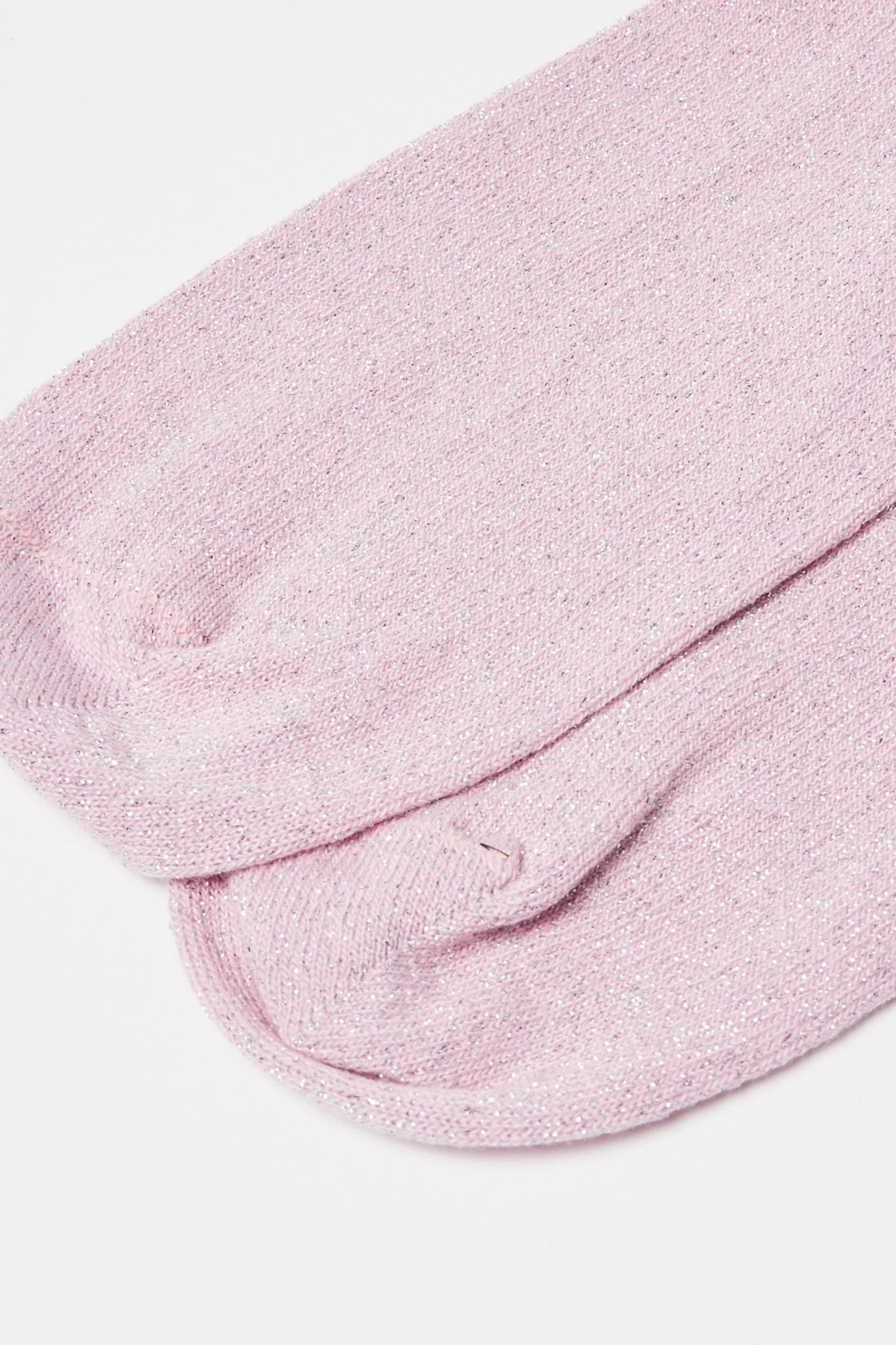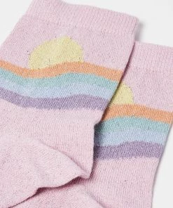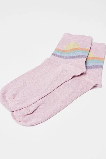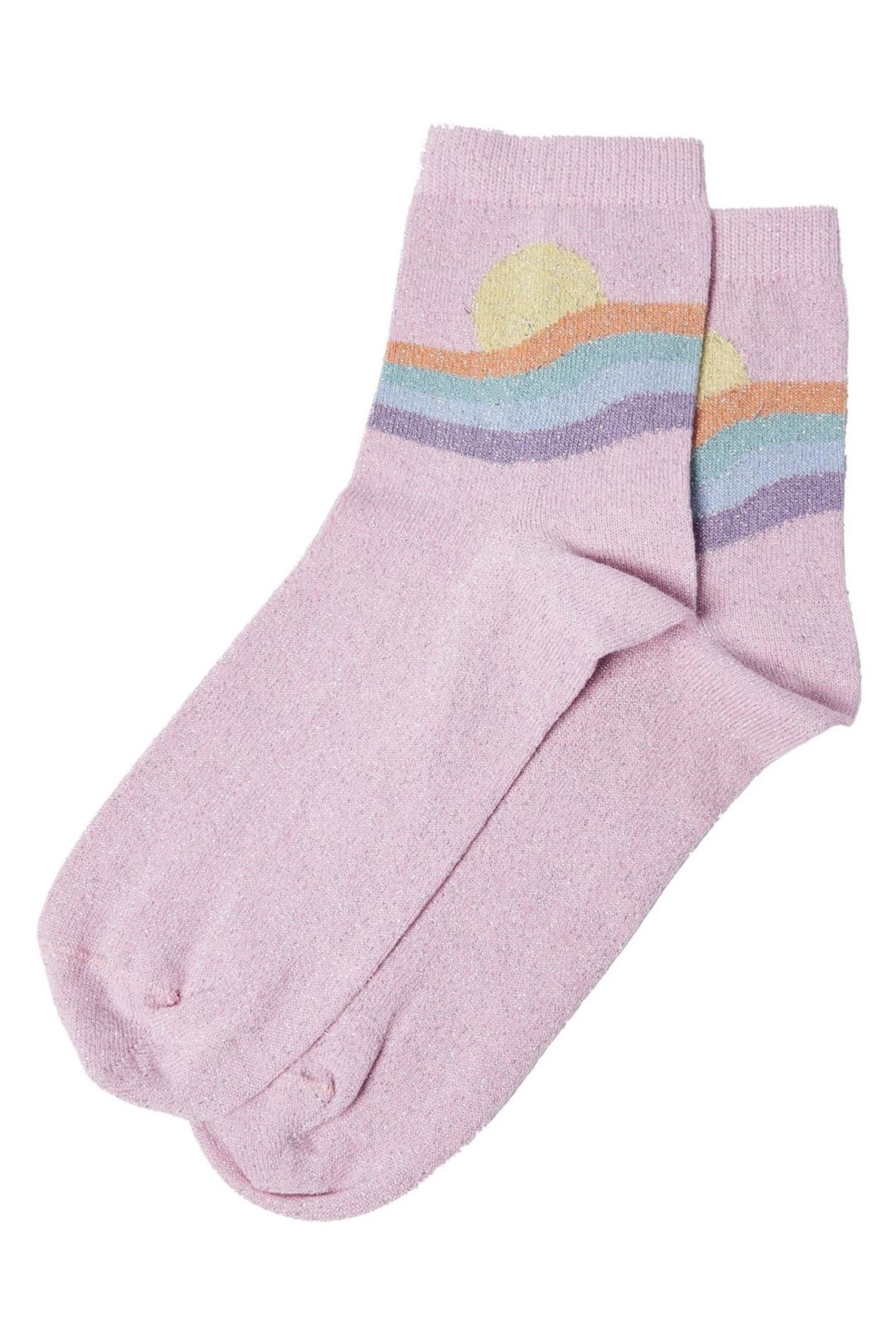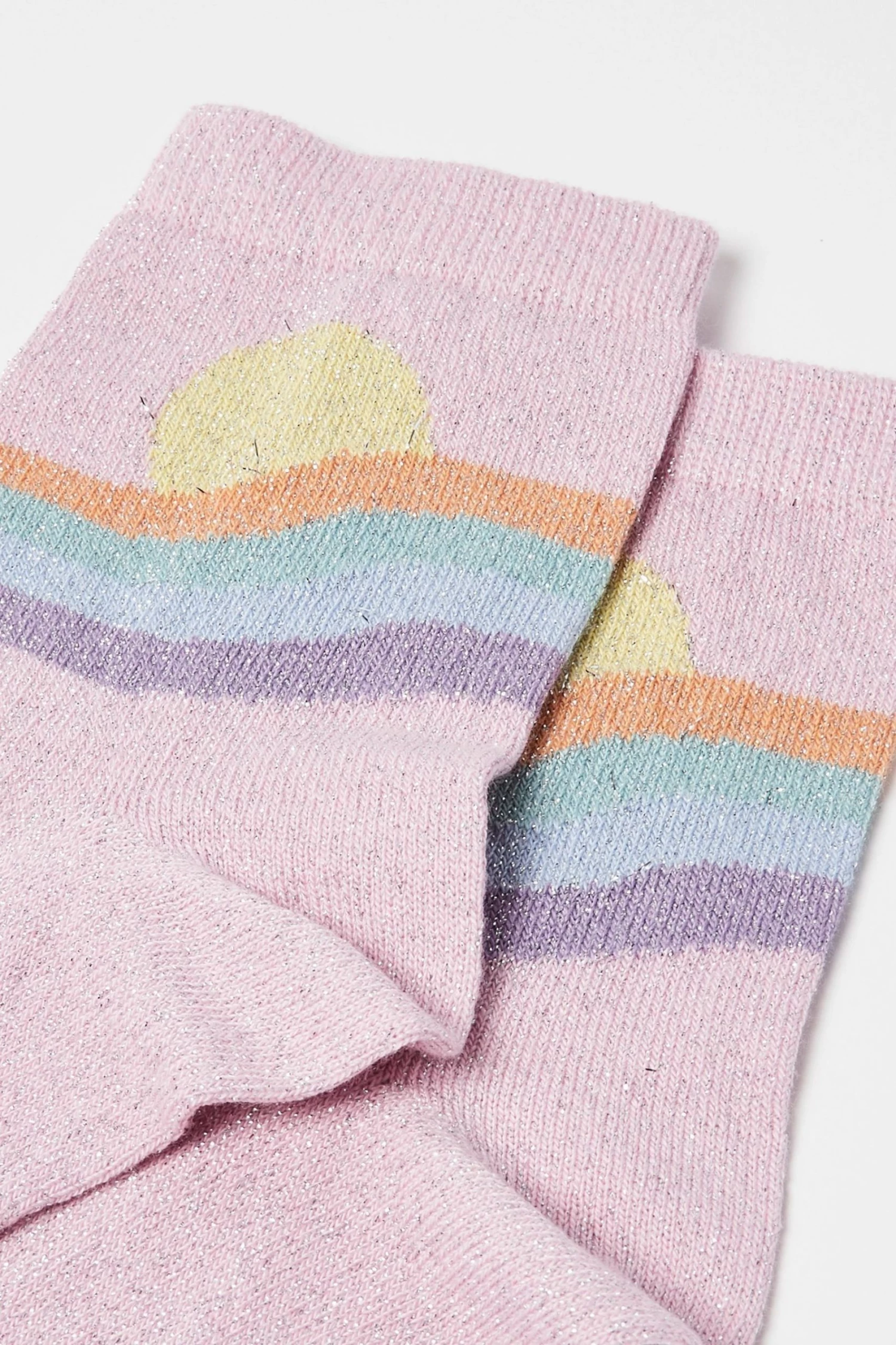 A muted sunset scene design sits at the top of this pair of socks on a light pink shimmering material.