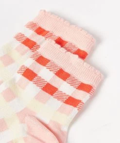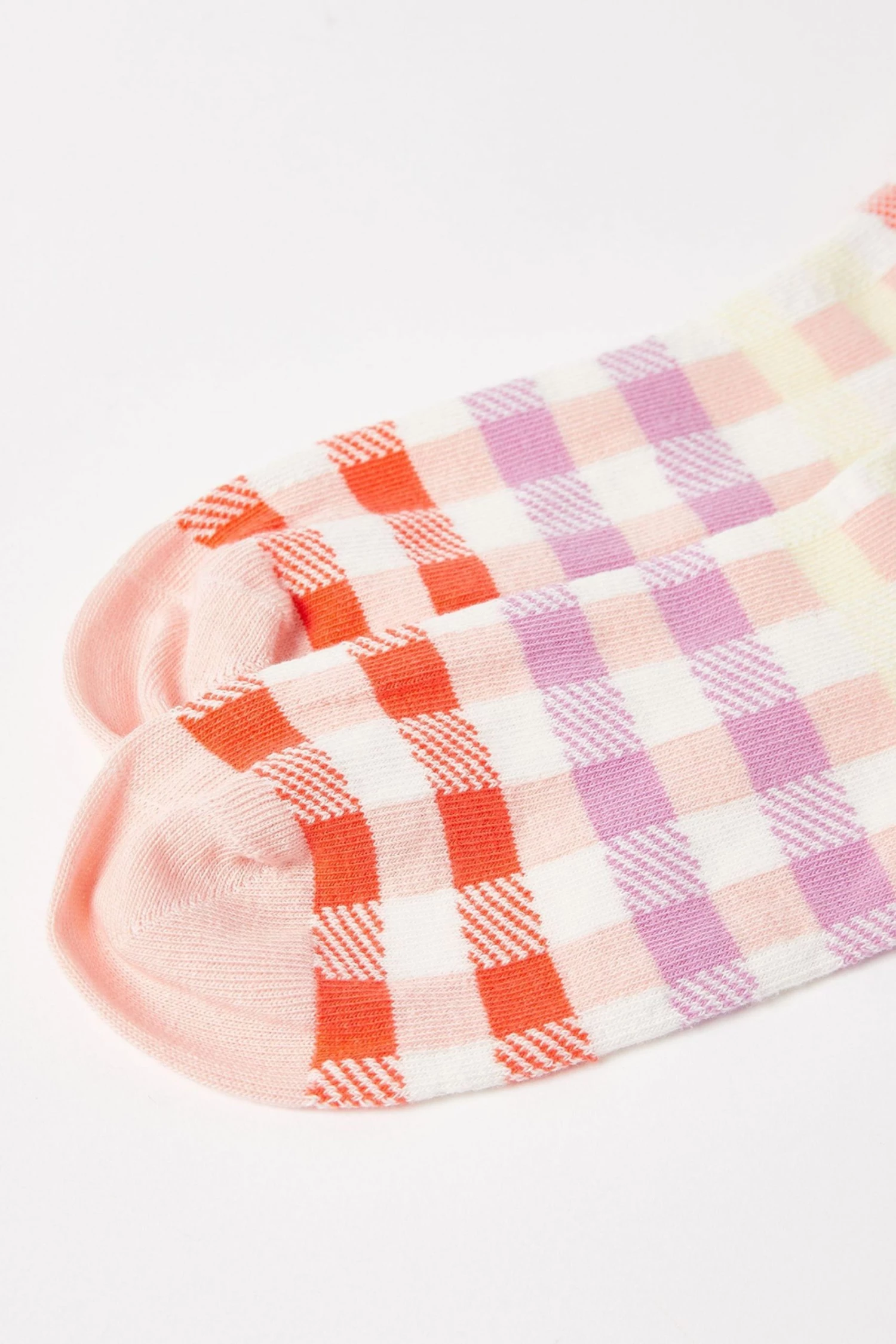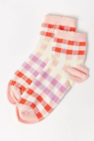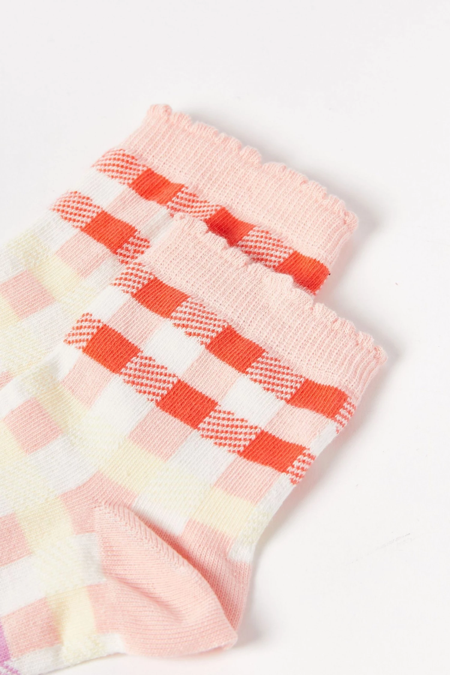 On a light pink material, red, purple and yellow gingham stripes cover this scallop edged sock.