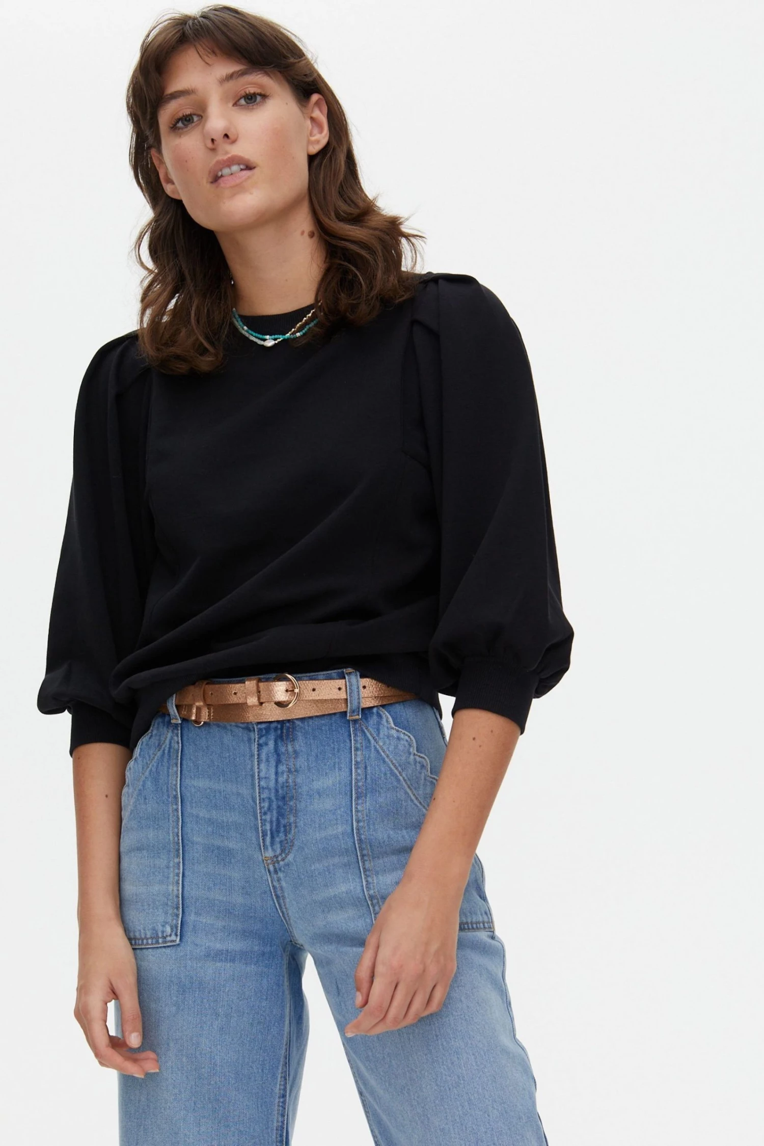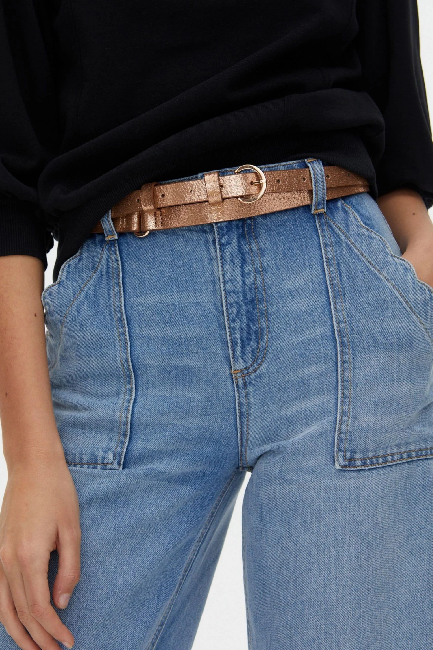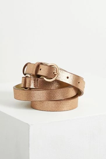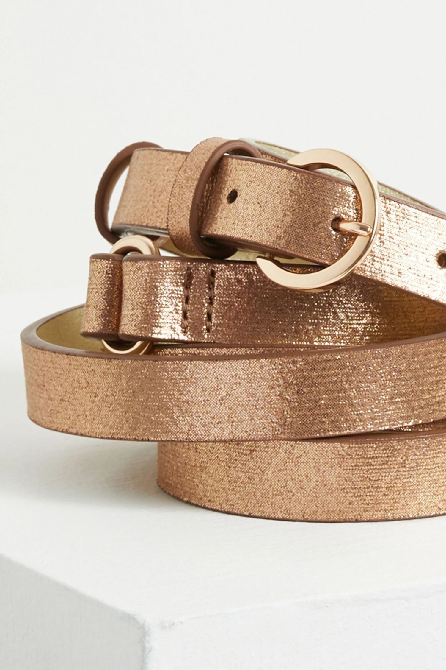 In a molten copper tone, this double wrap around belt in a skinny profile features a round gold toned buckle and a metallic sheen.