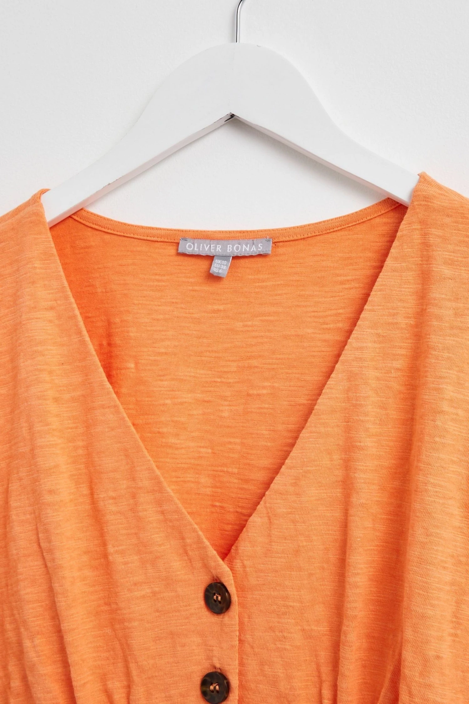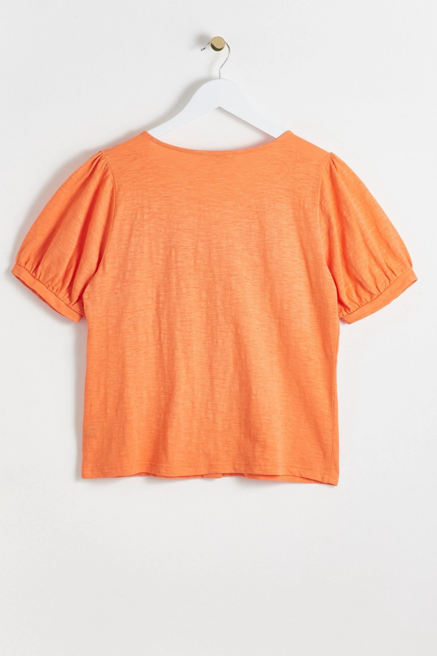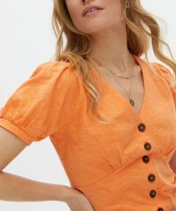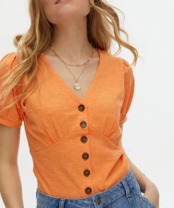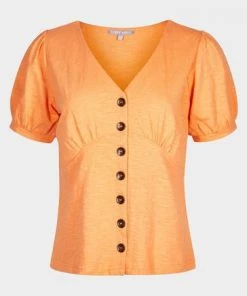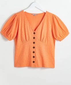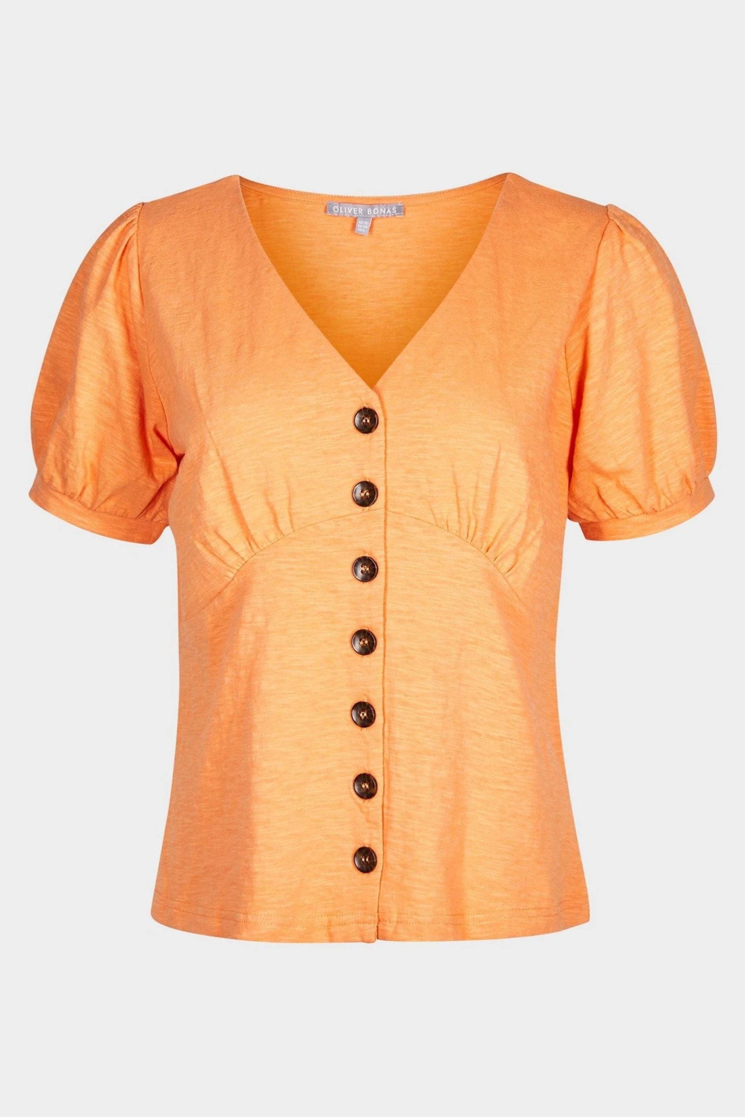 In a fitted silhouette, this orange T-shirt with brown button up fastenings along the front has an elegant V-neckline and short sleeves. Pleat accents line the cuffs and around the waist, pair with a midi skirt in neutral tones for a dreamy look.
