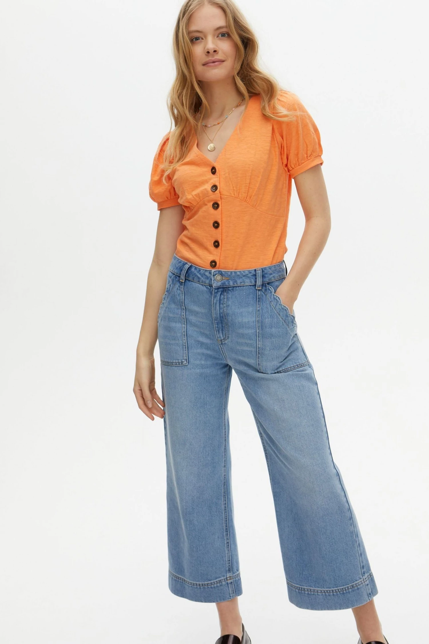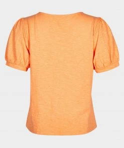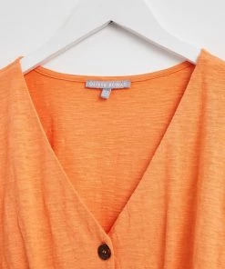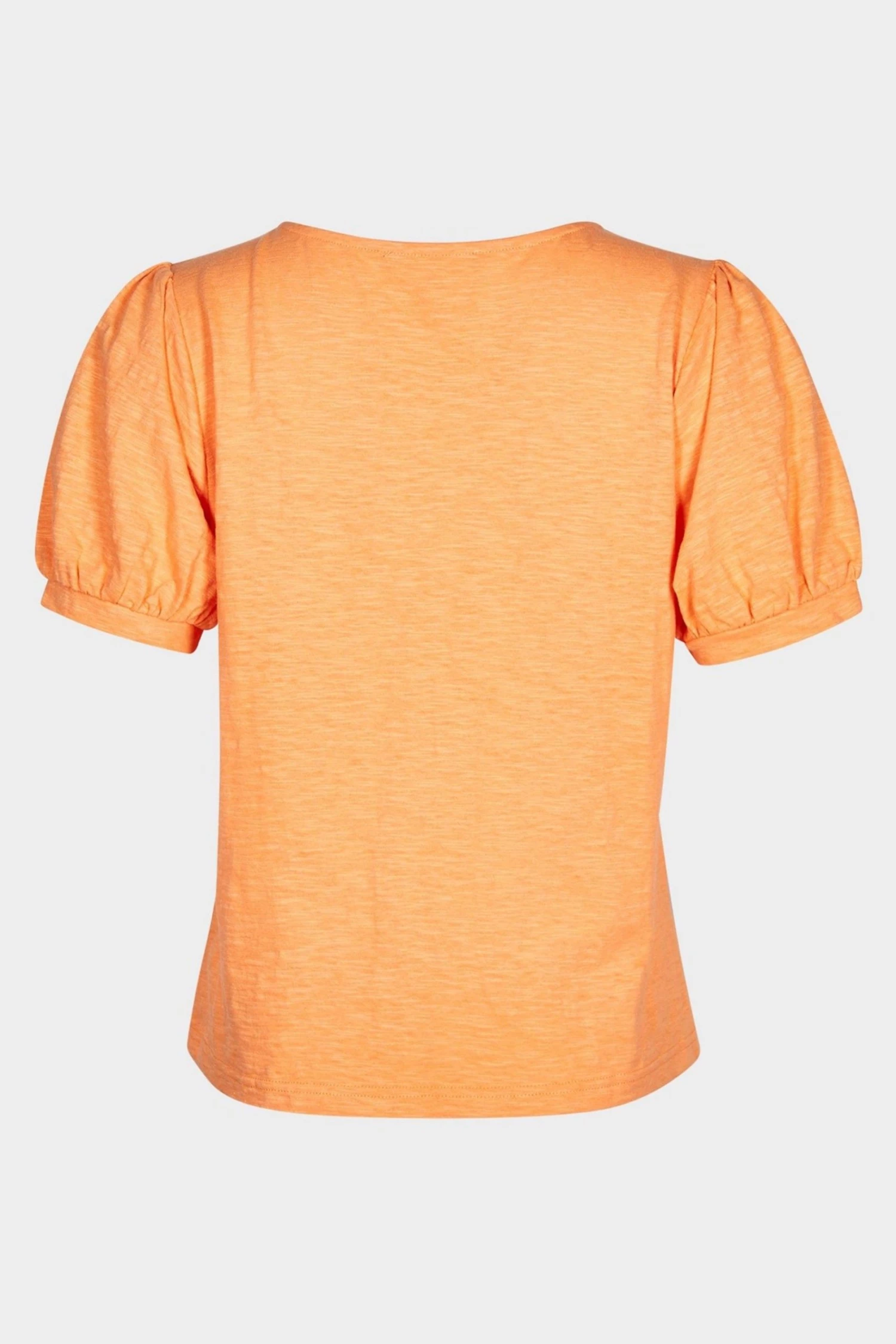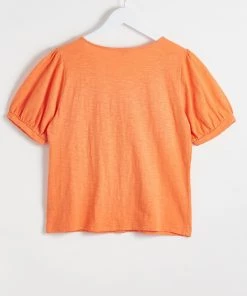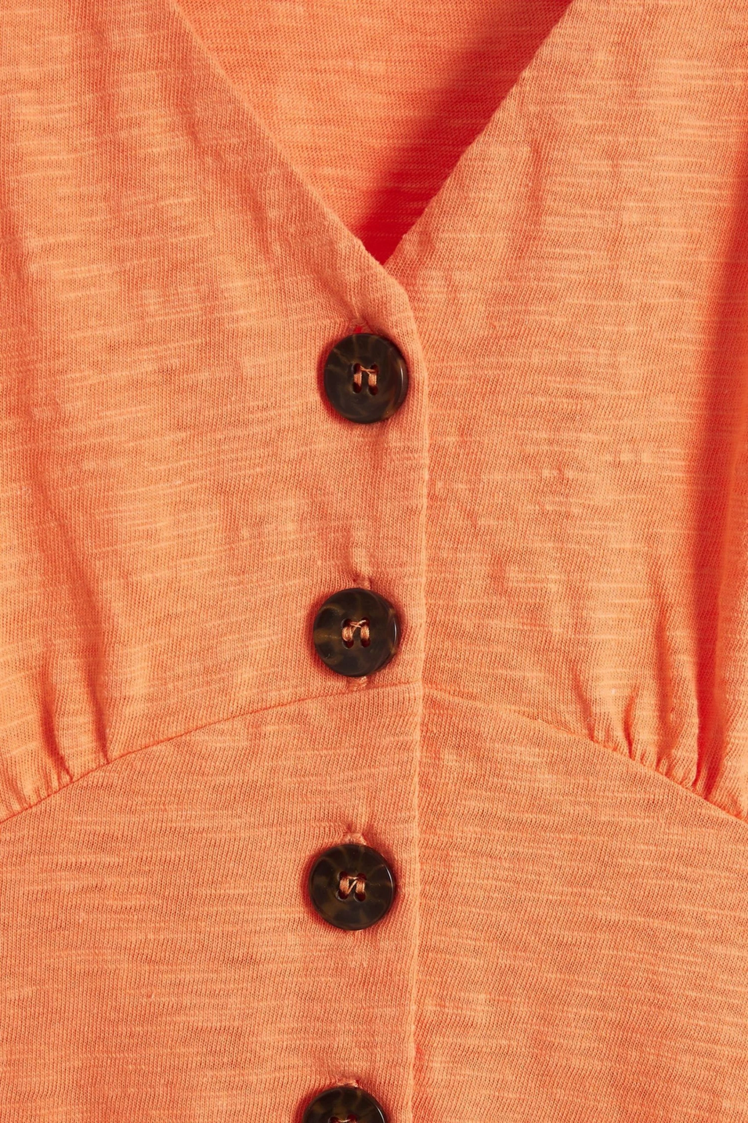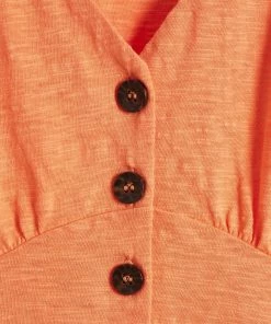 In a fitted silhouette, this orange T-shirt with brown button up fastenings along the front has an elegant V-neckline and short sleeves. Pleat accents line the cuffs and around the waist, pair with a midi skirt in neutral tones for a dreamy look.
