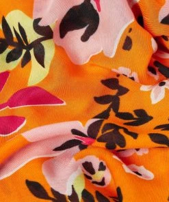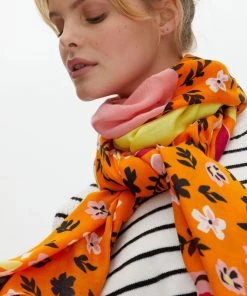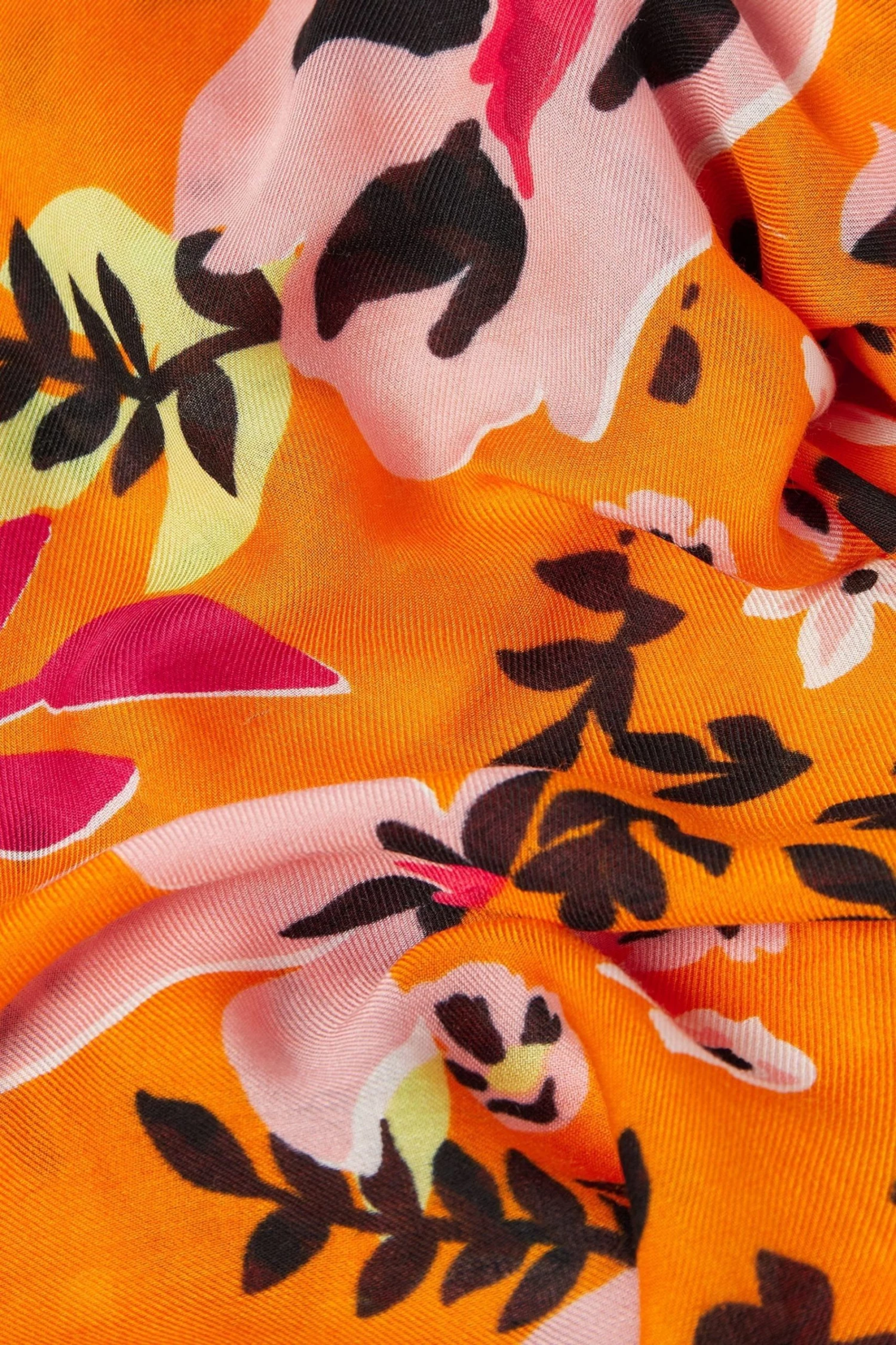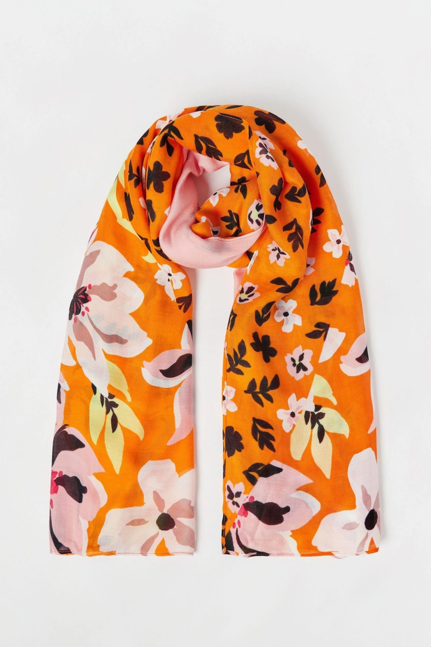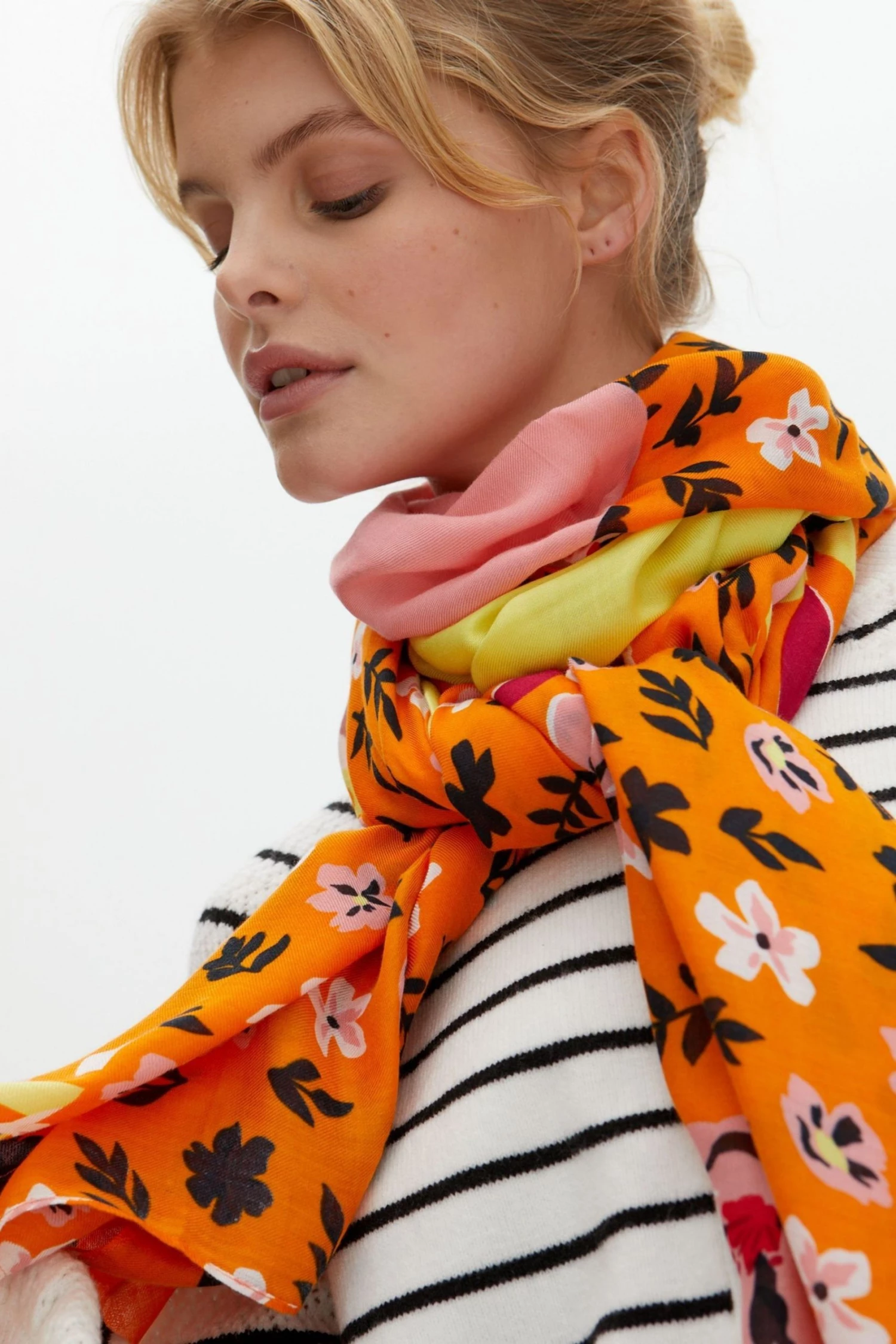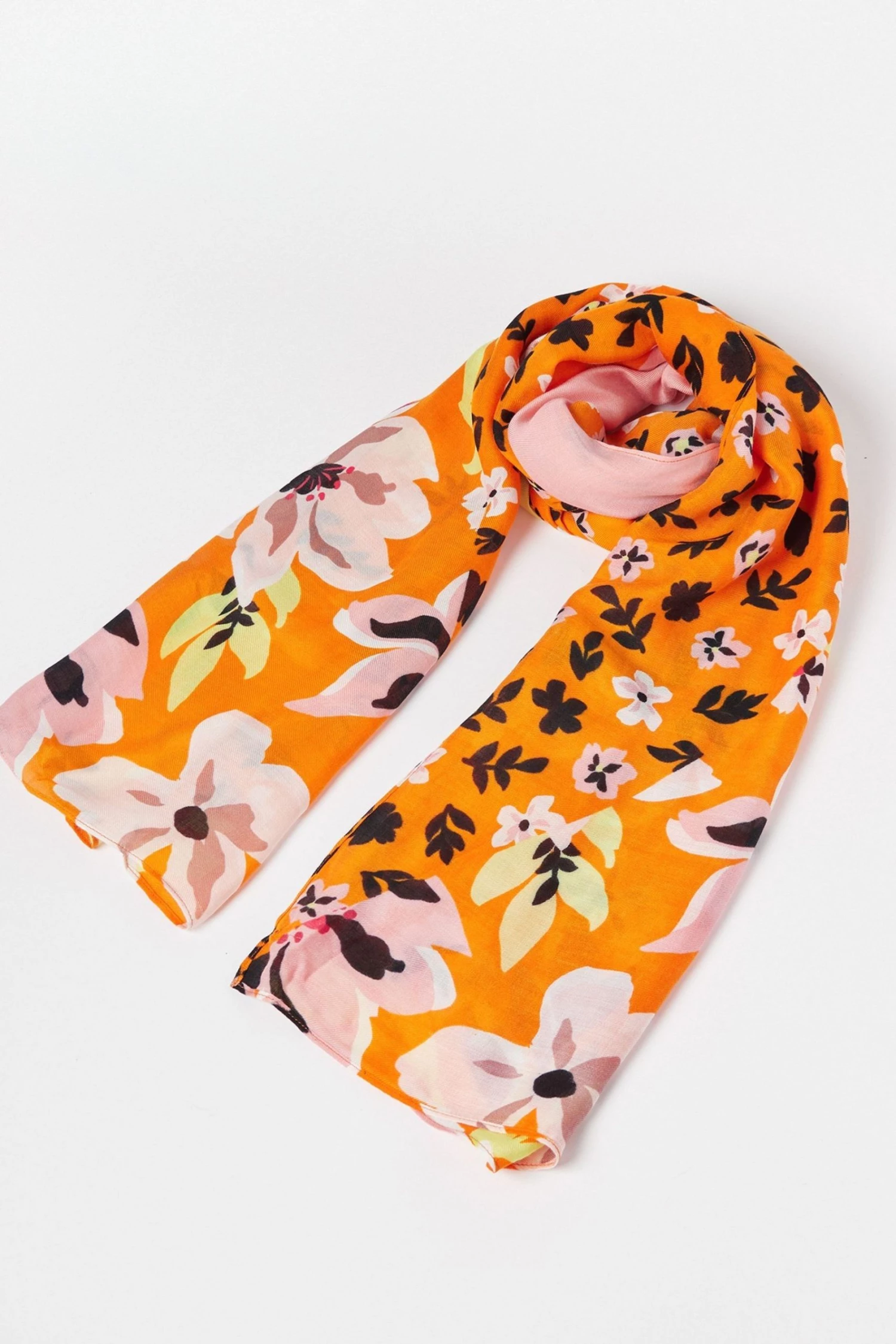 A bright orange light weight scarf is home to a detailed pink and yellow floral print with black details.