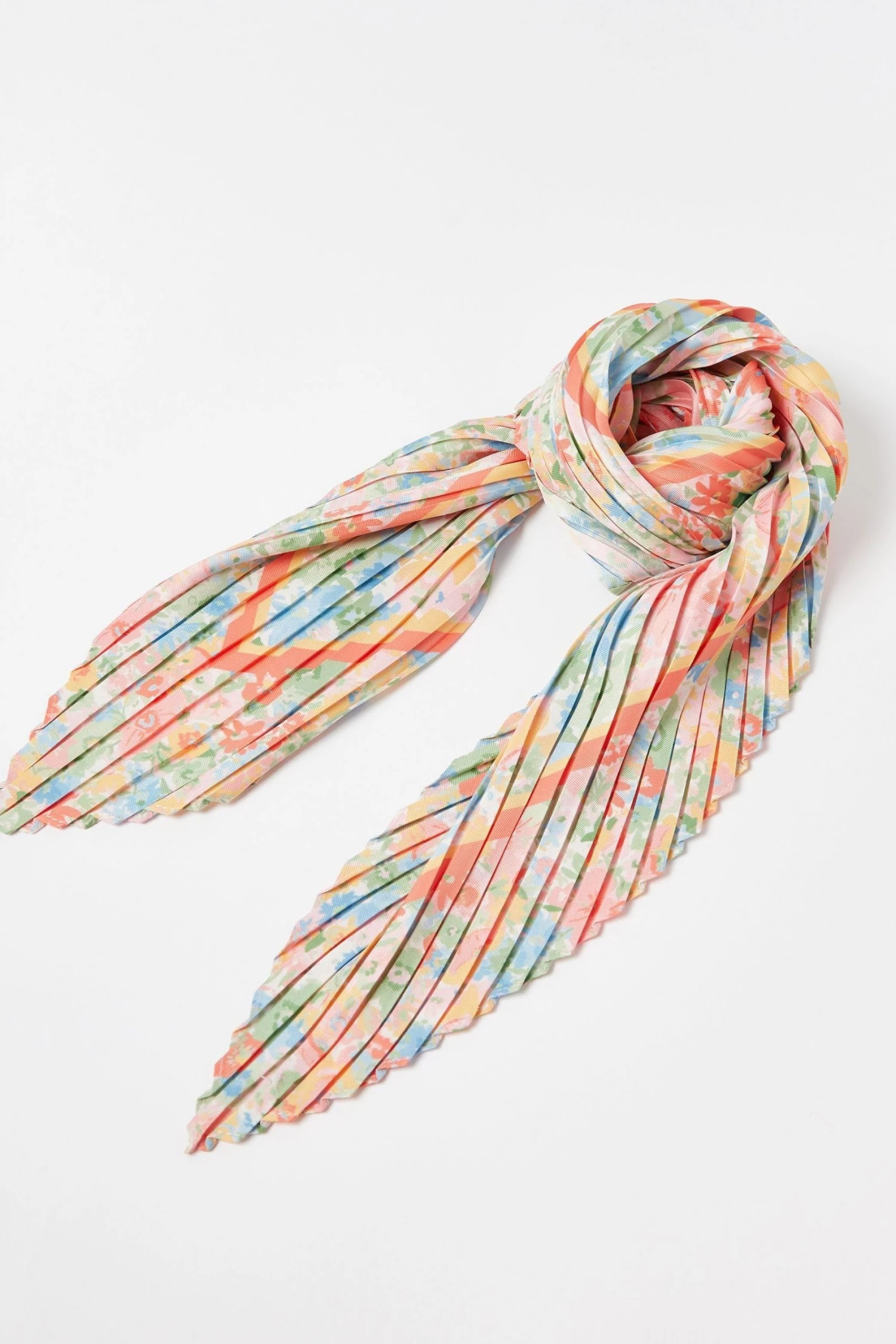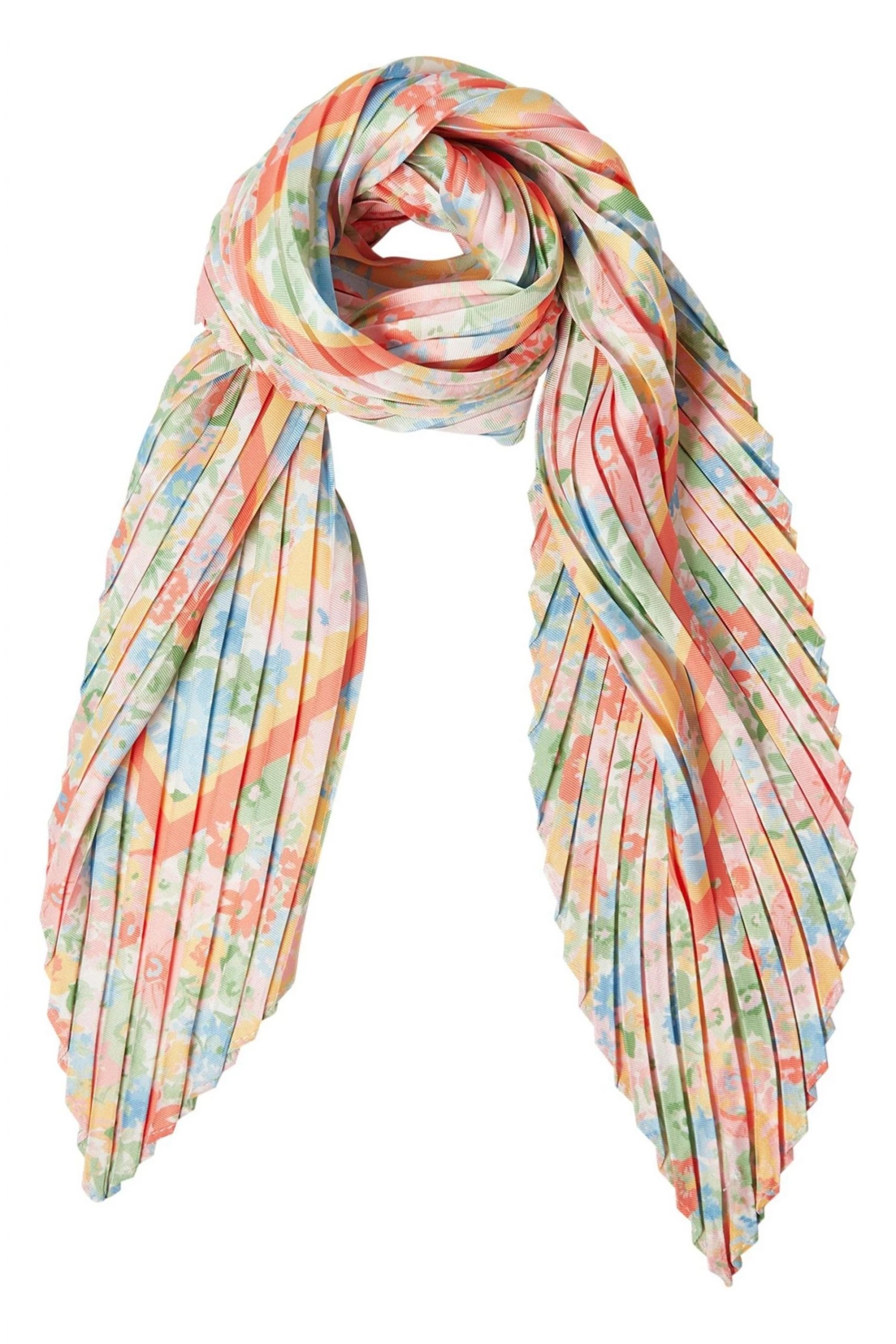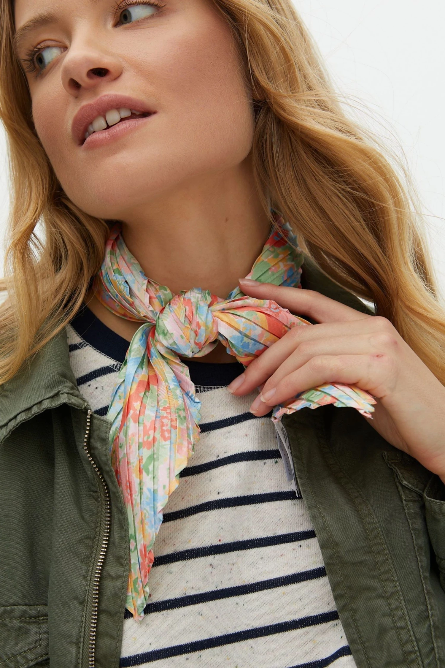 Pleated fabric is decorated with a multicoloured floral print on this spring themed scarf. Layer over a denim jacket to keep the chill away.
