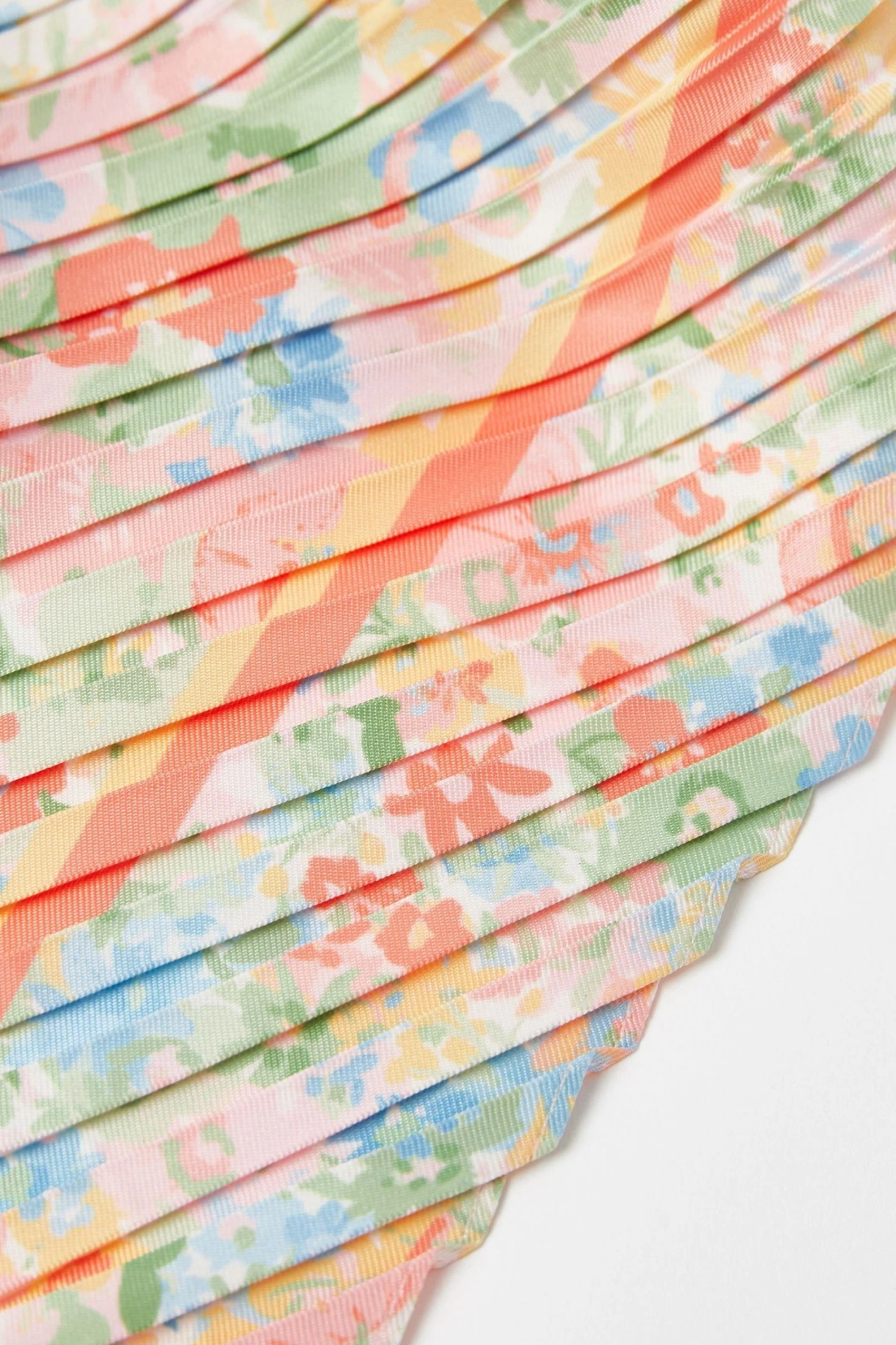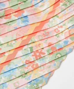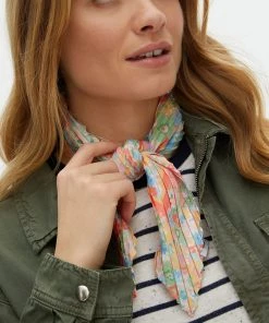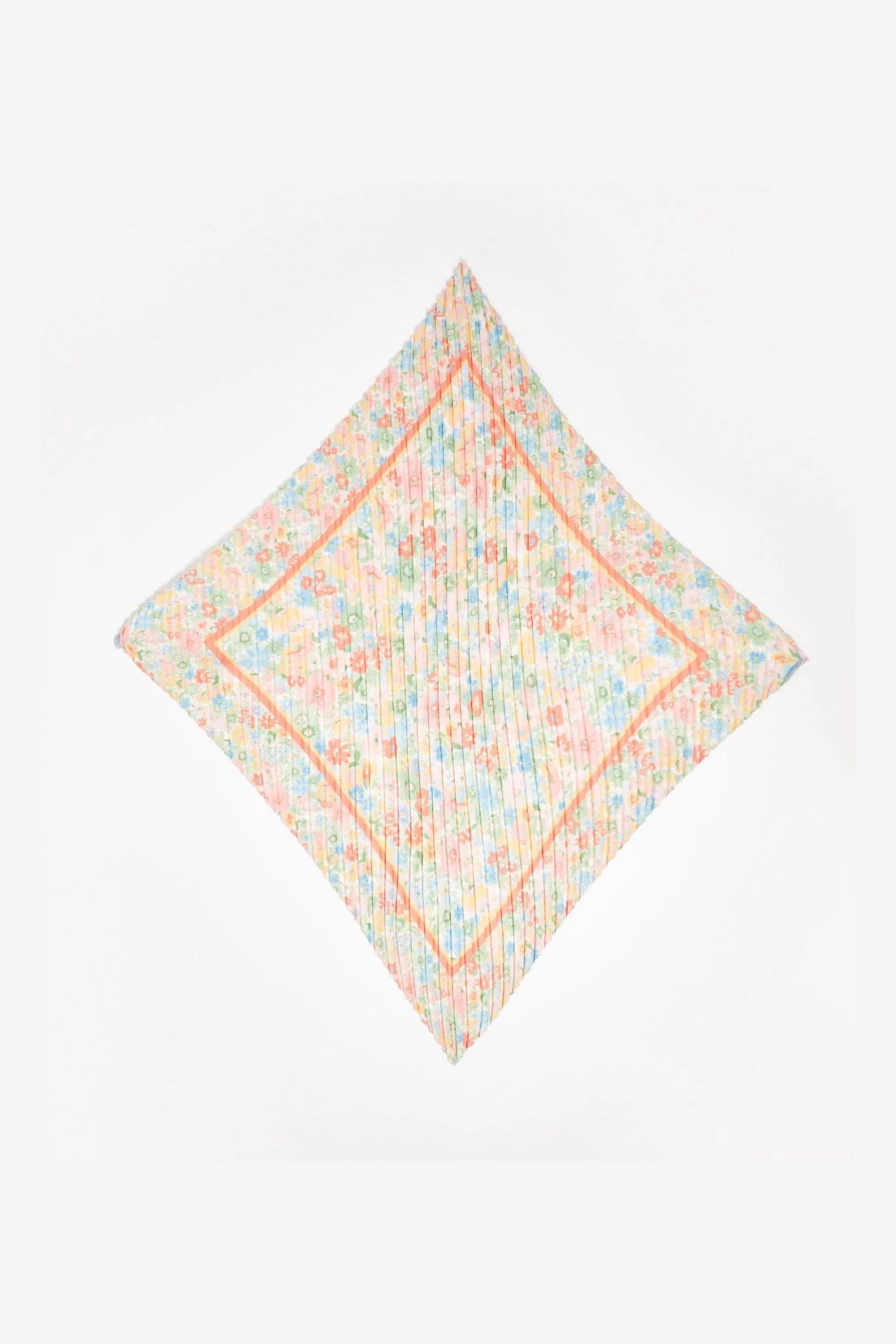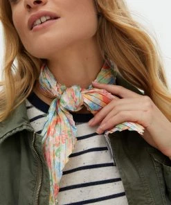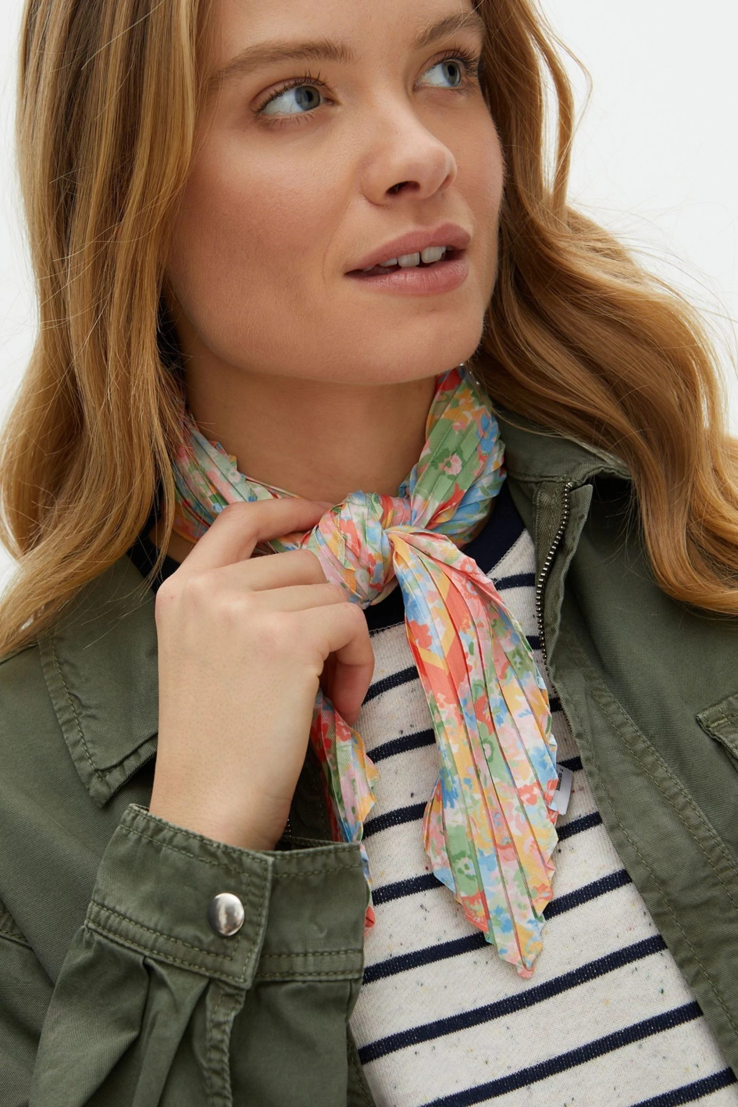 Pleated fabric is decorated with a multicoloured floral print on this spring themed scarf. Layer over a denim jacket to keep the chill away.