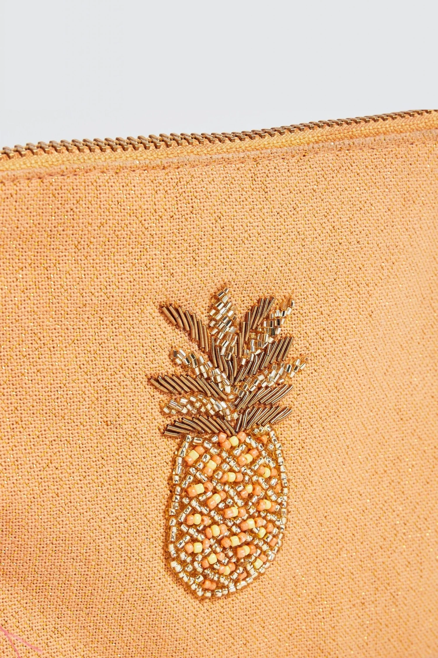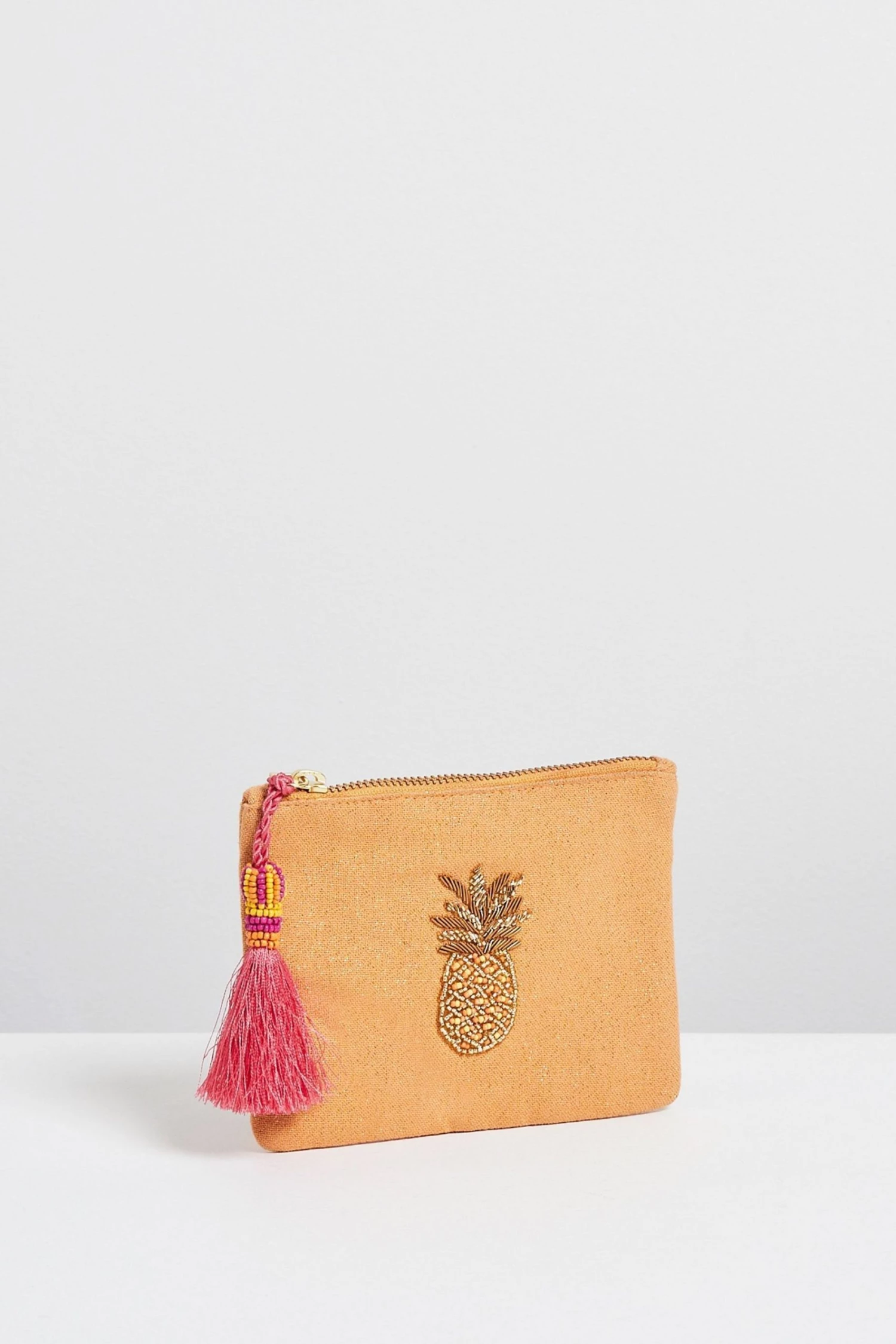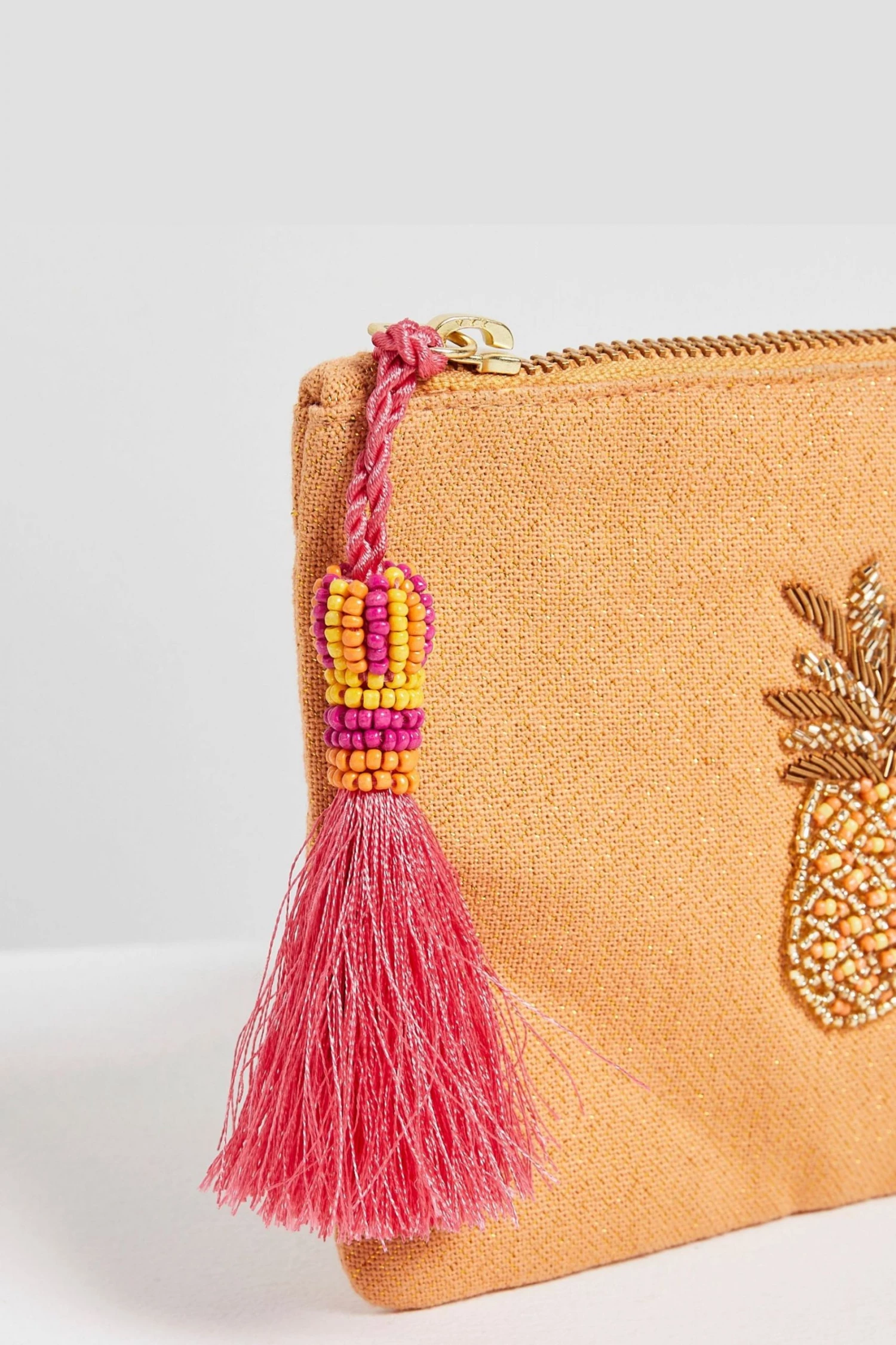 Organise your handbag essentials into this fruity pouch, featuring a beaded pineapple motif on an orange fabric, complete with a zip fastening and a statement pink tassel pull.
