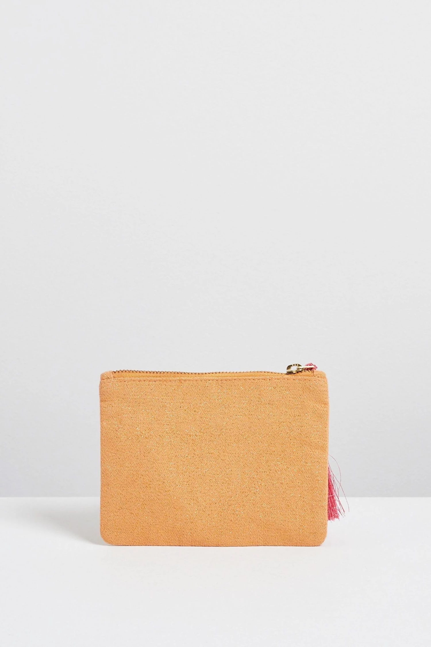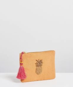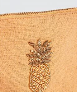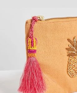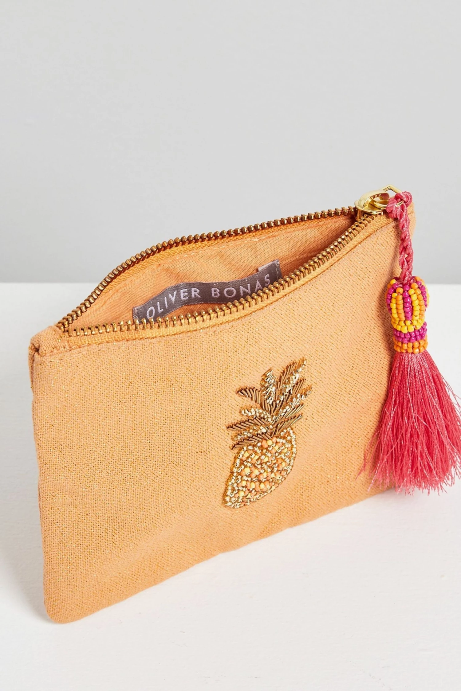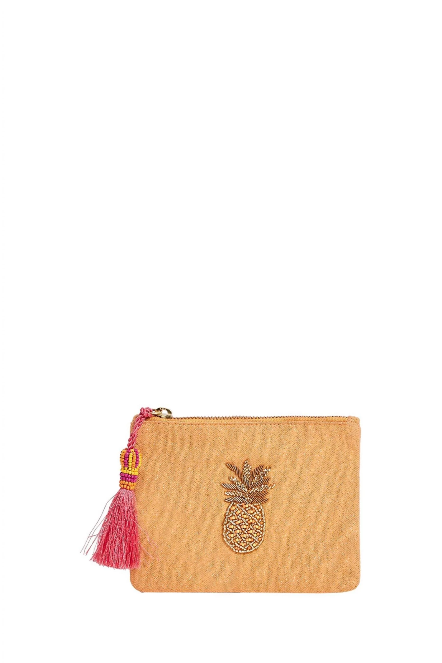 Organise your handbag essentials into this fruity pouch, featuring a beaded pineapple motif on an orange fabric, complete with a zip fastening and a statement pink tassel pull.