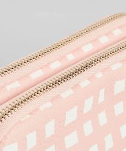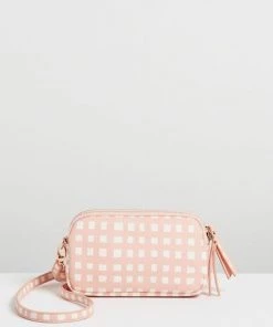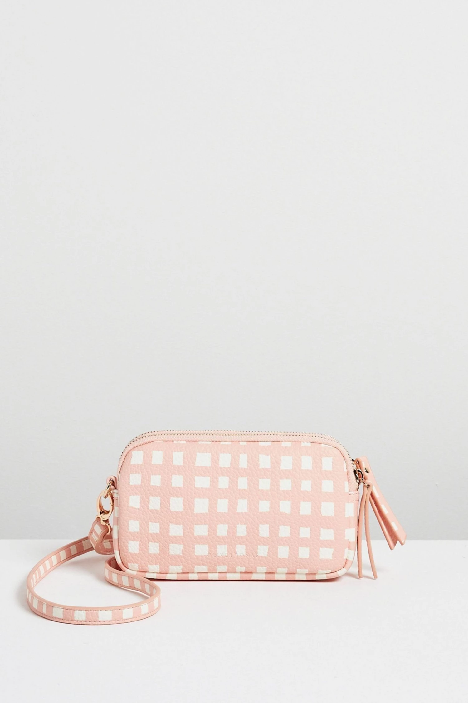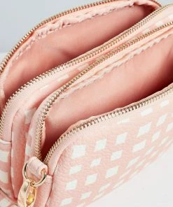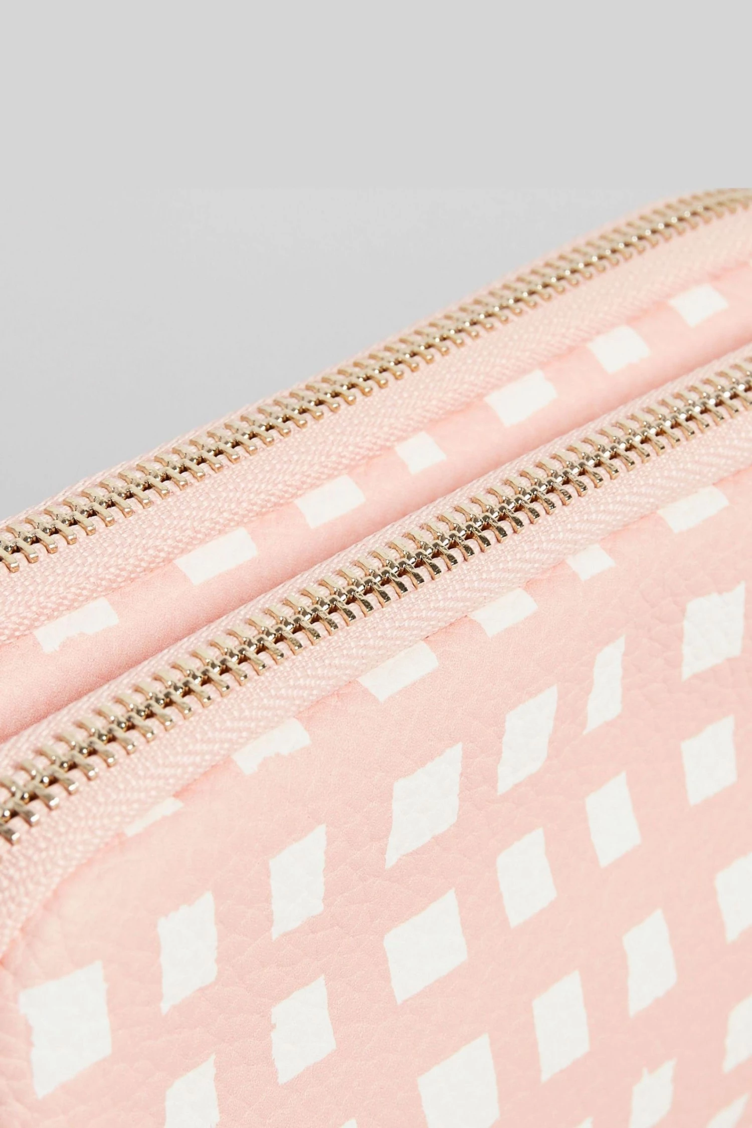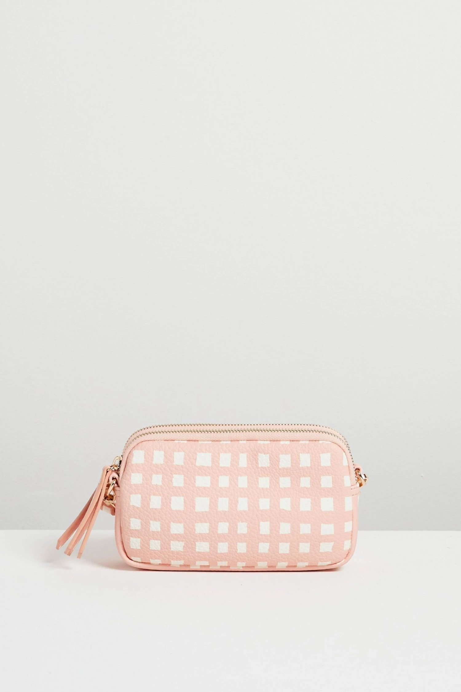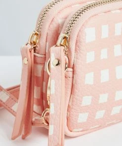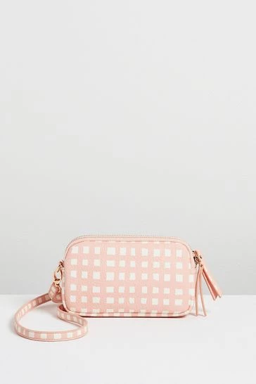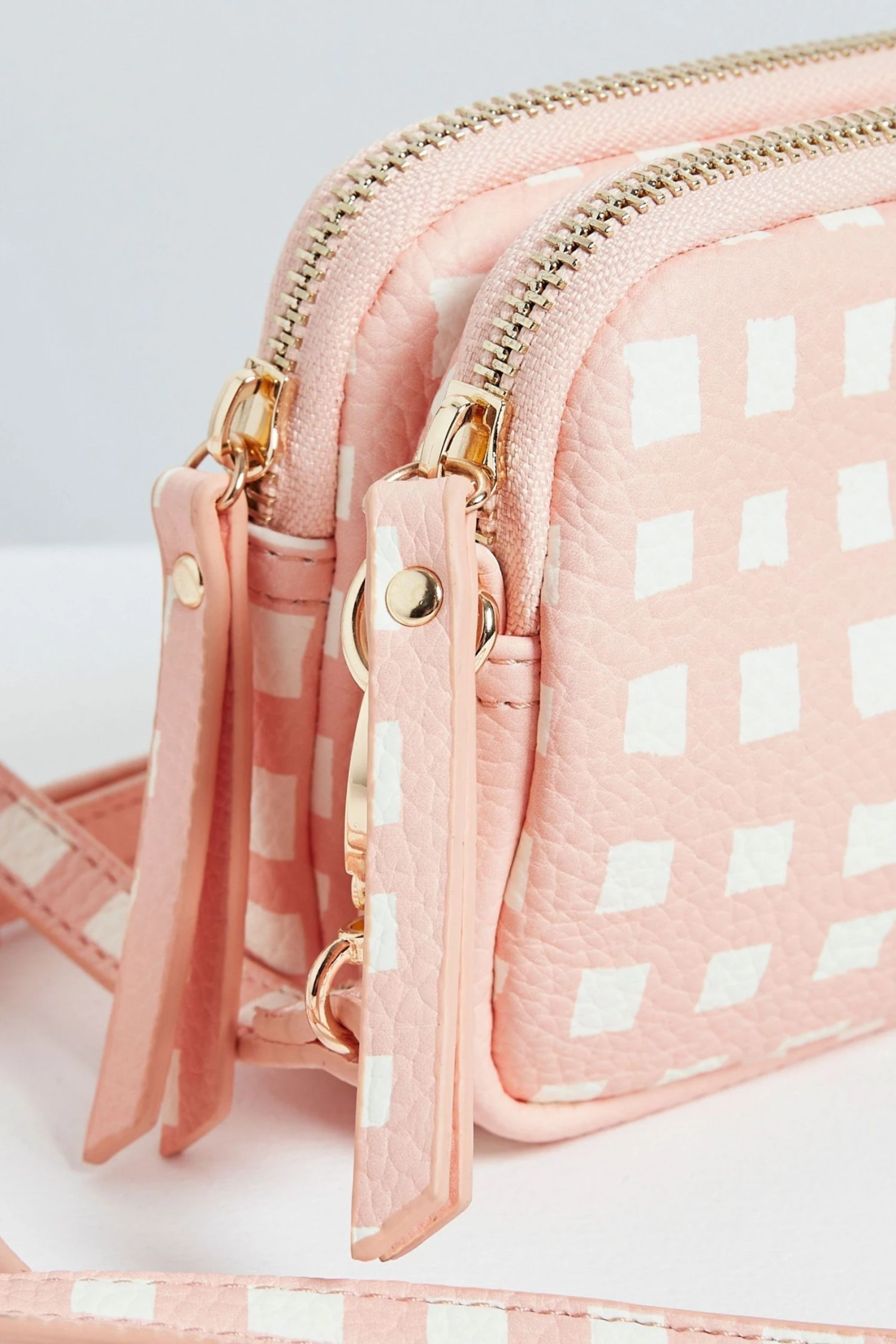 Check finding your new favourite summer bag off your list with this compact peach pink style. Featuring a checked print with two compartments and zip fastenings to keep your essentials safe, it is complete with golden metalware and a crossbody strap.