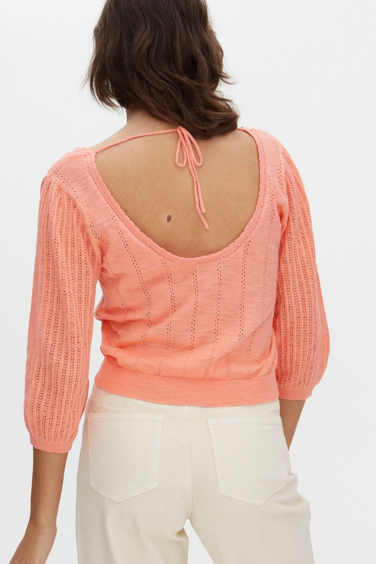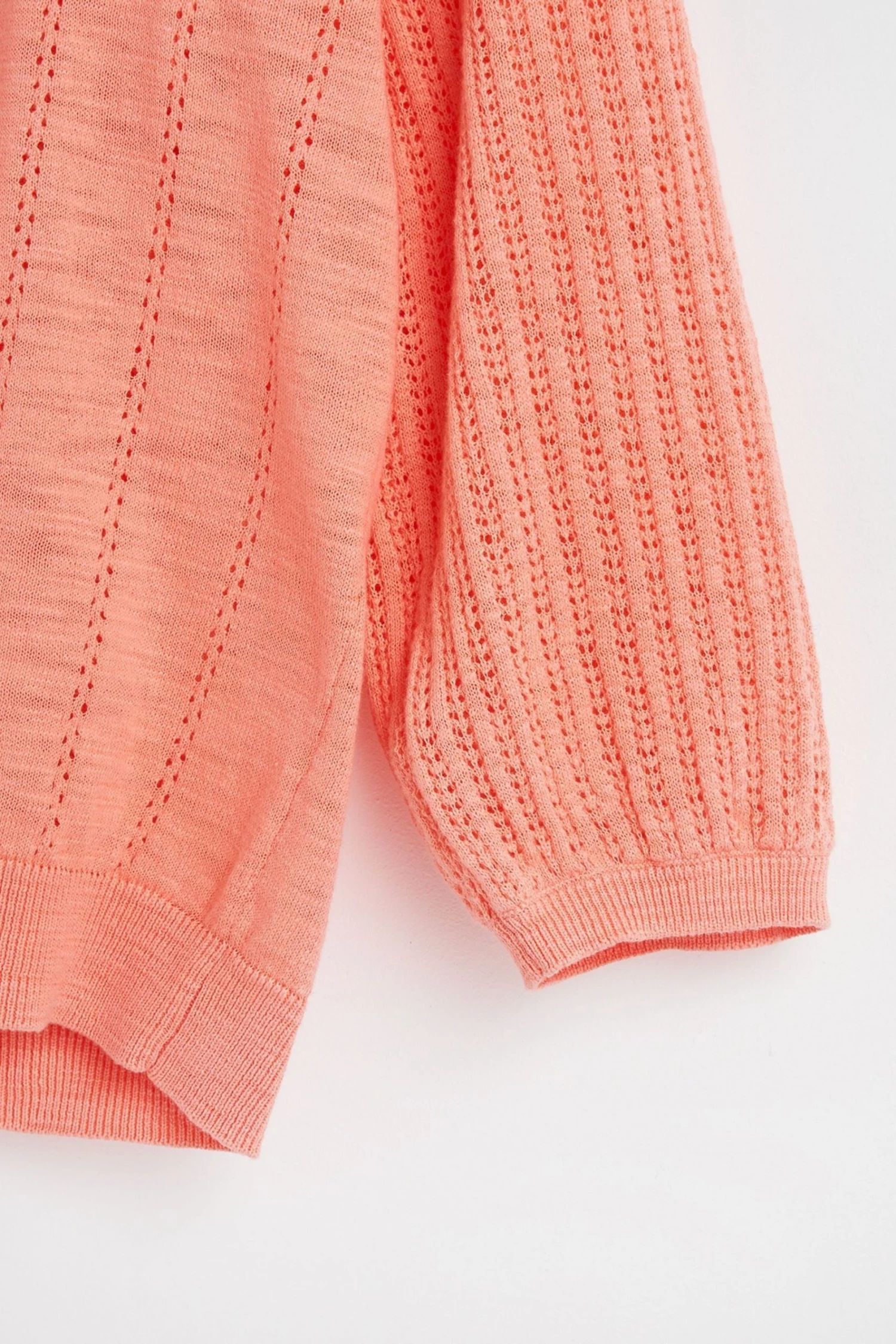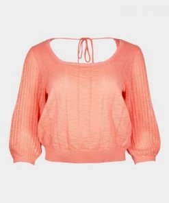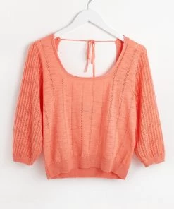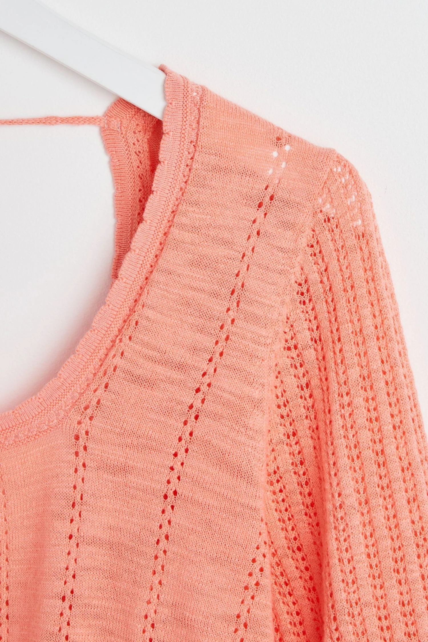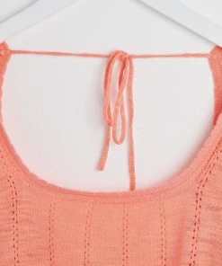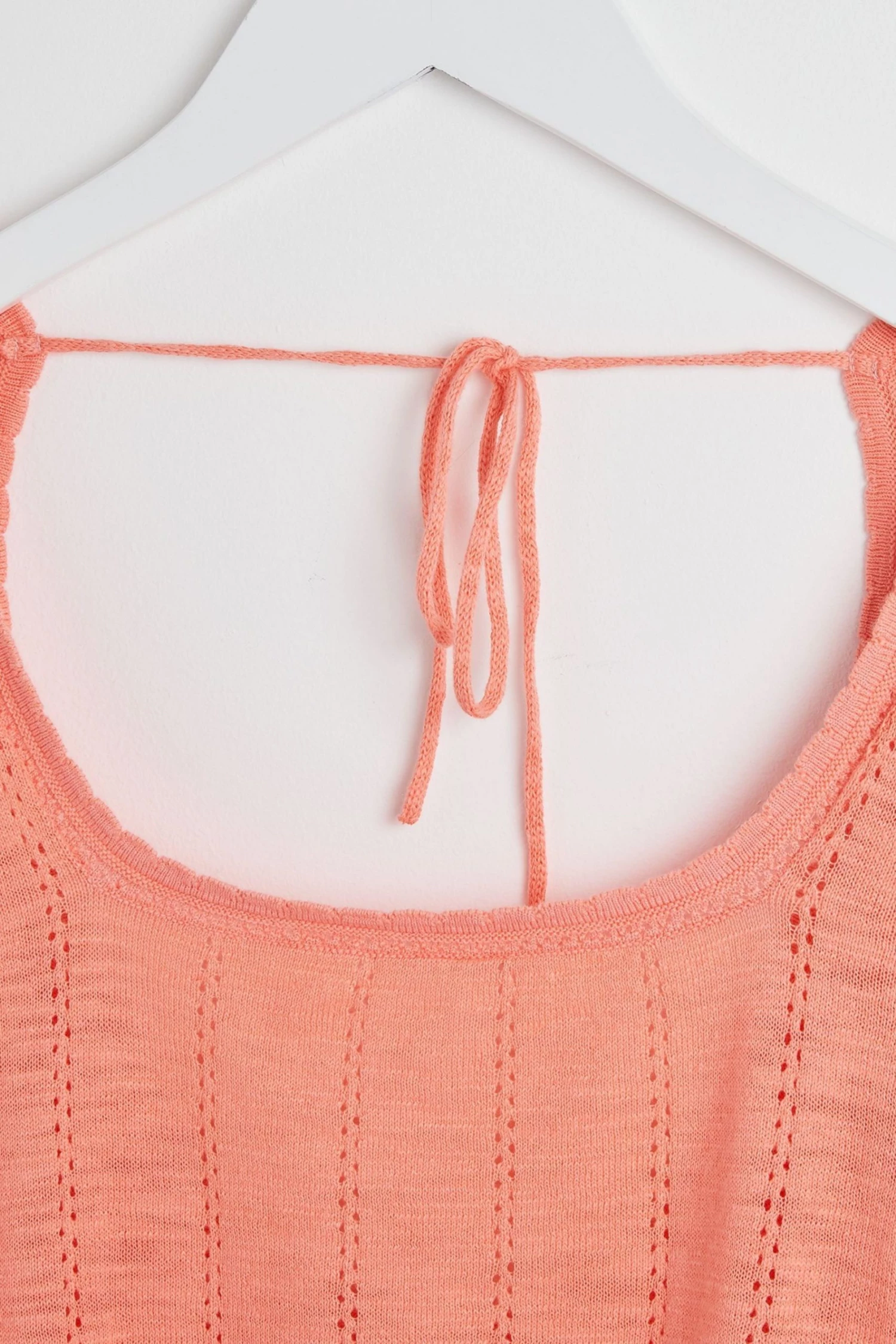 Pairing a relaxed fit with scoop back and tie fastening, this coral pink knitted top features delicate stitch detailing and ribbed hems for a comfortable fit.