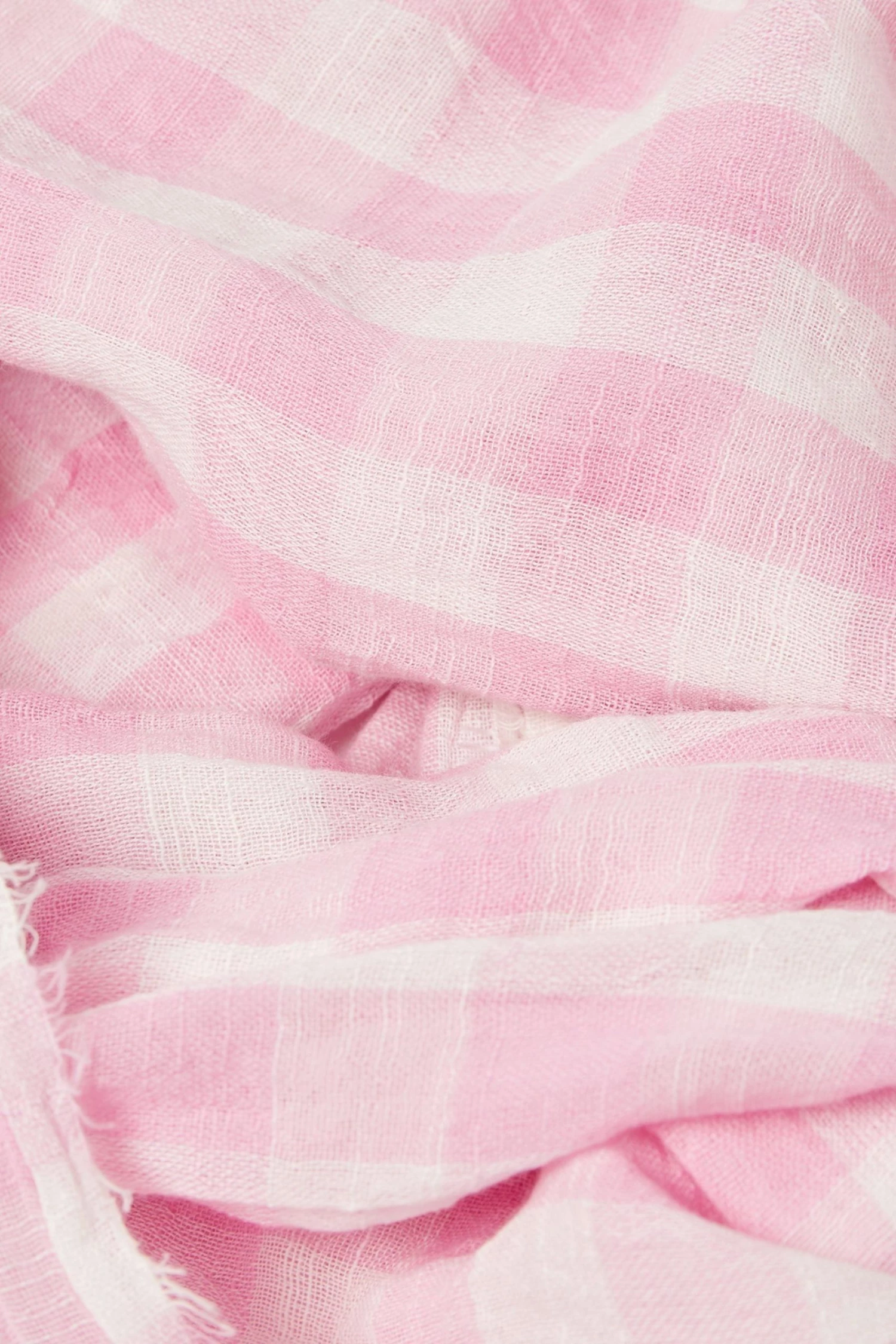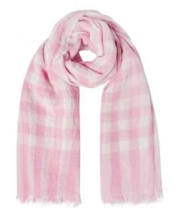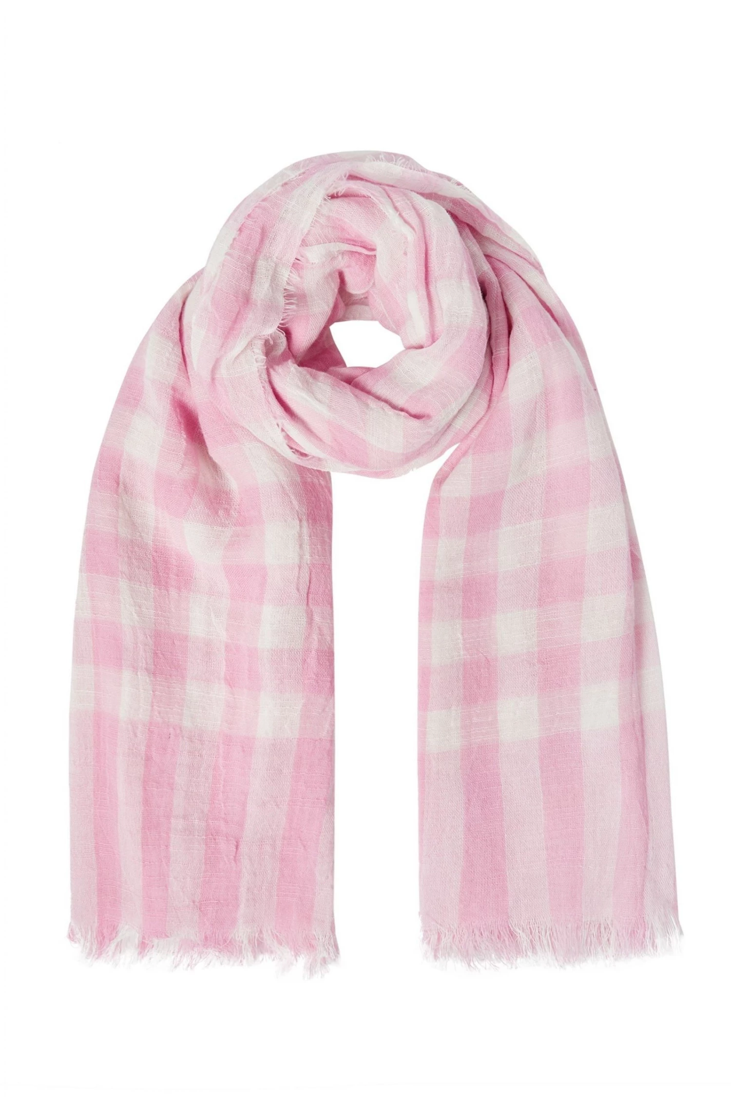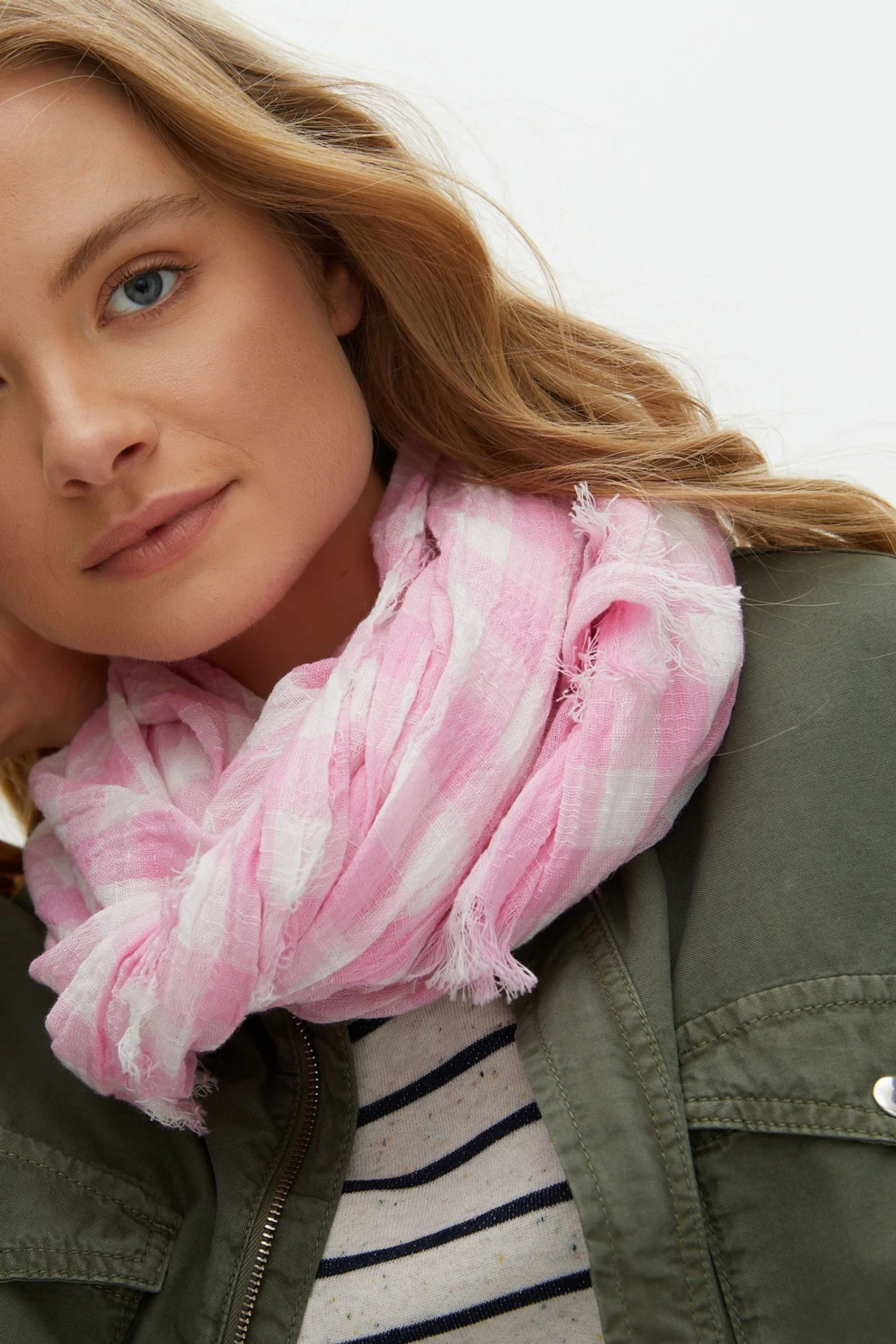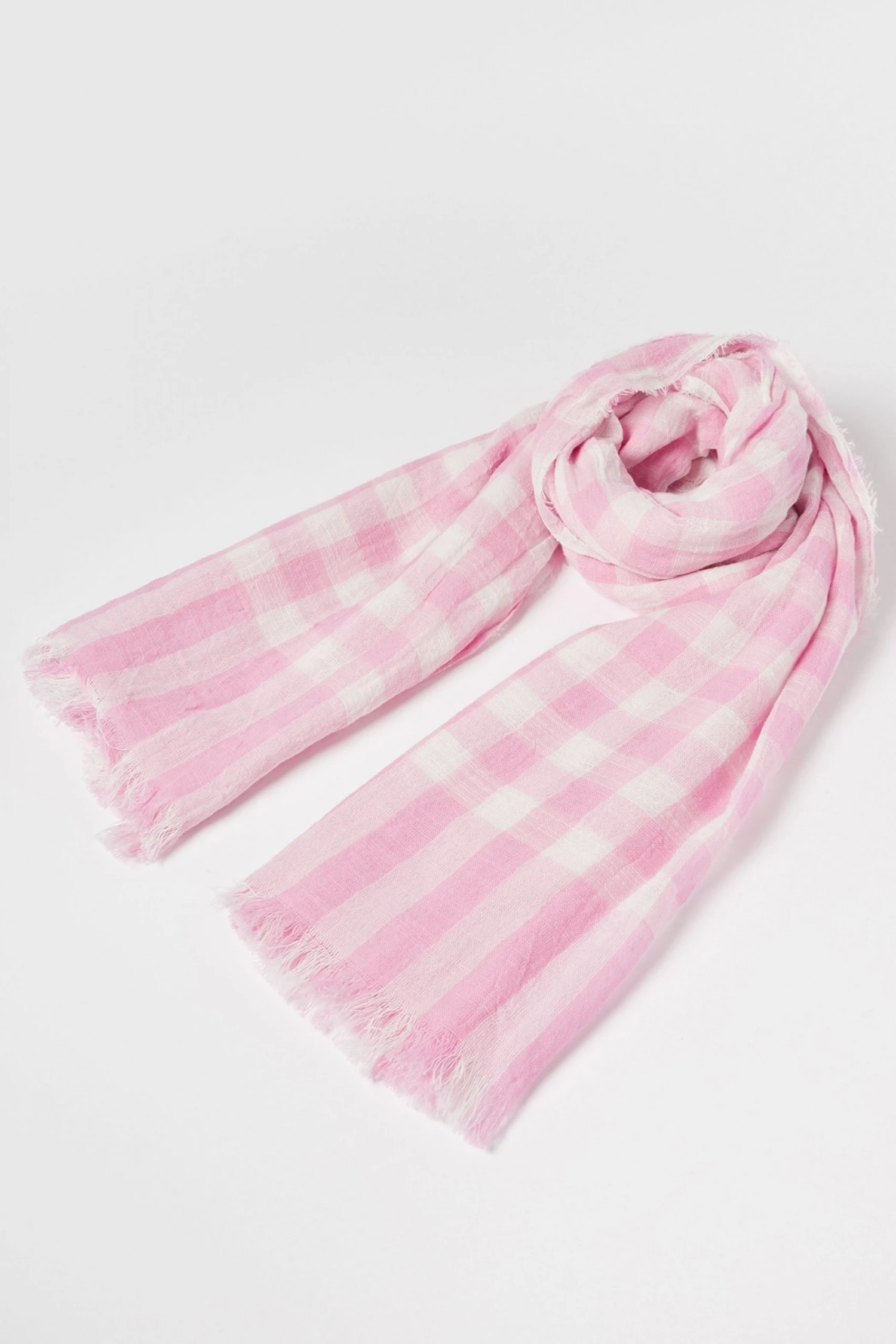 In an airy cotton fabric, this light weight pink gingham scarf has frayed detailing around the edges. Add to your outfit for an easy pop of colour.