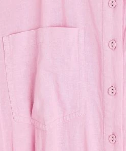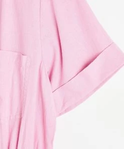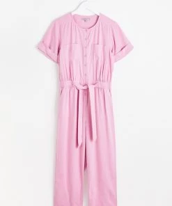 In a lightweight linen mix fabric, this pink jumpsuit with short sleeves is an easy utility style to dress up or down. A tie belt sits at the waist with button up fastenings leading up to a round neckline. Cuffed details sit at the sleeves and legs, all in a straight profile.
