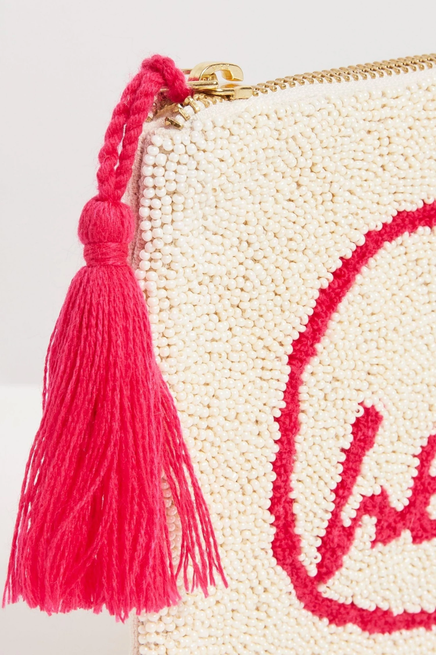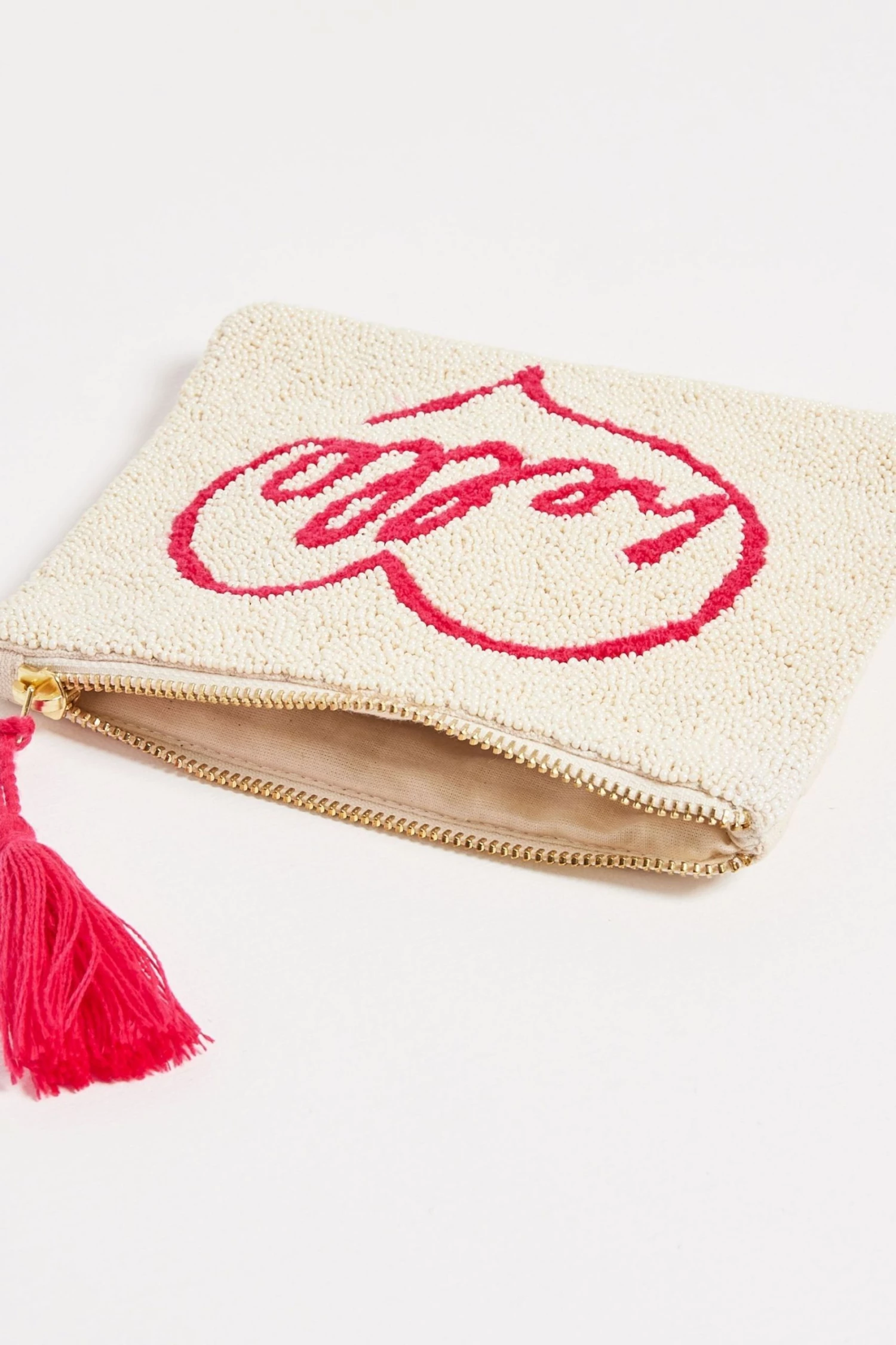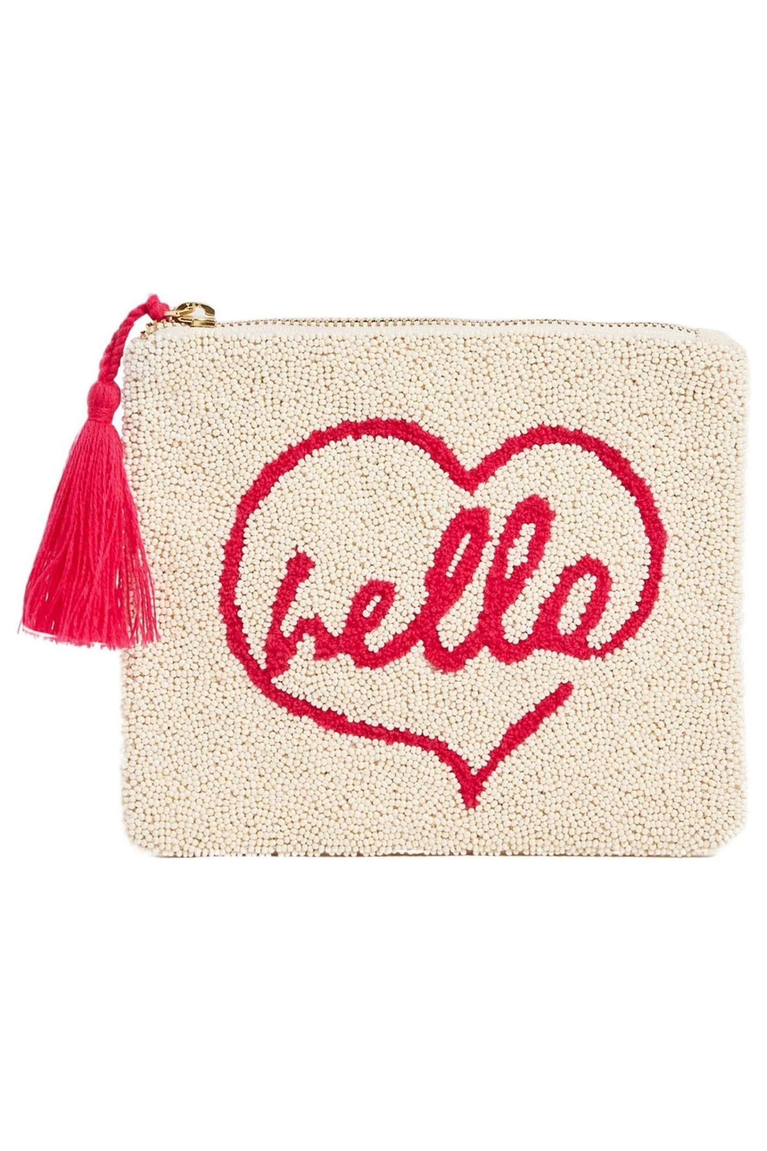 Add a little love to your accessories with this textured pouch. In a cream tone, it features red Hello text in a heart with a matching pink tassel and gold-toned zip fastening.