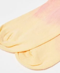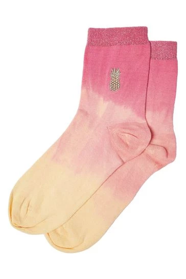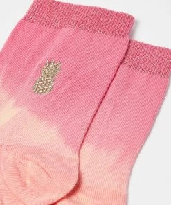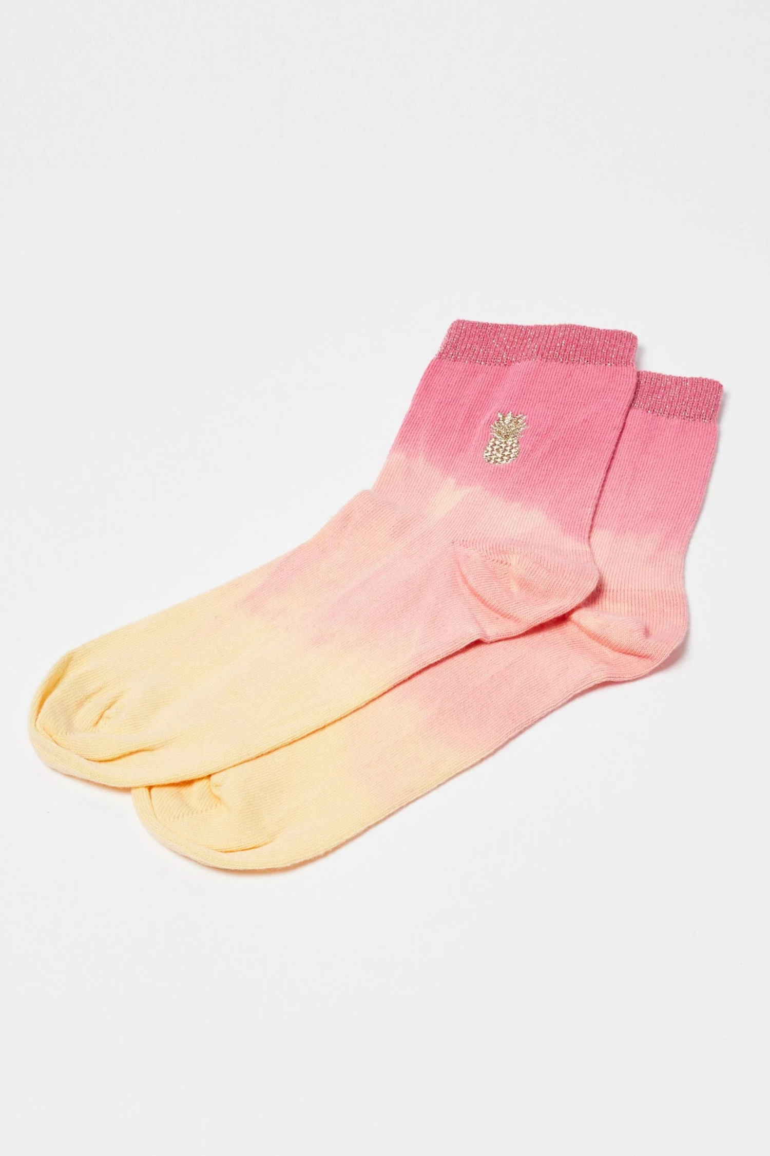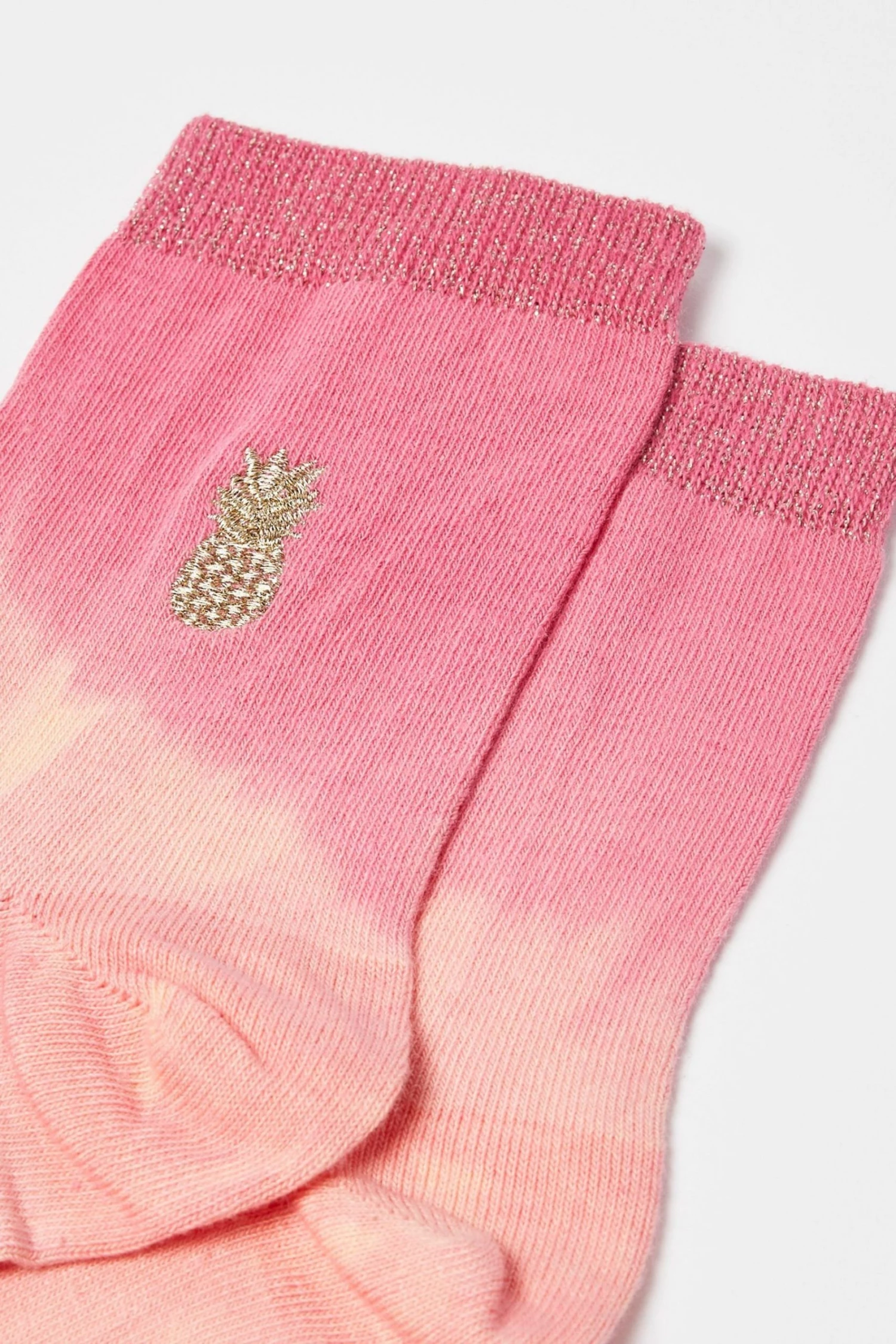 In a pink to yellow ombrê, this pair of socks features an embroidered golden pineapple and is complete with an added touch of gold thread around the hem.